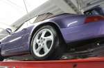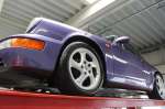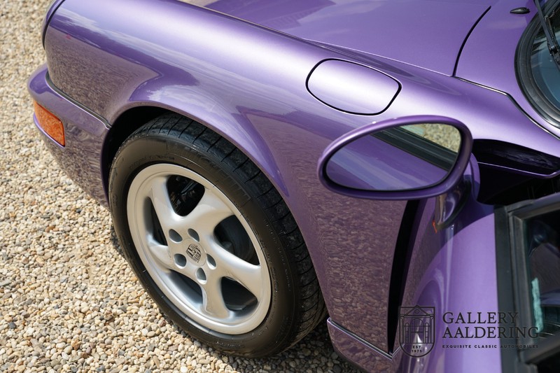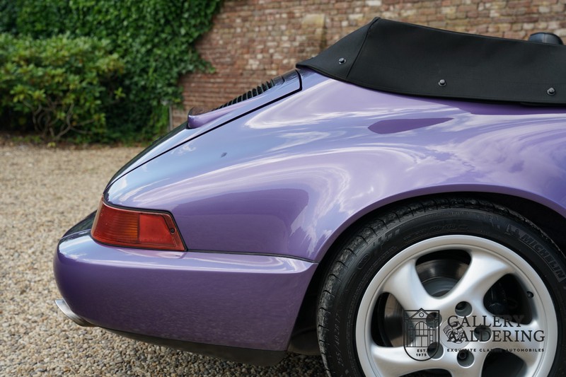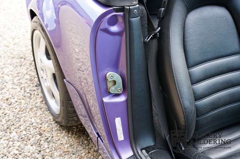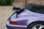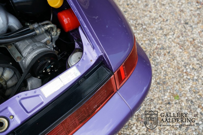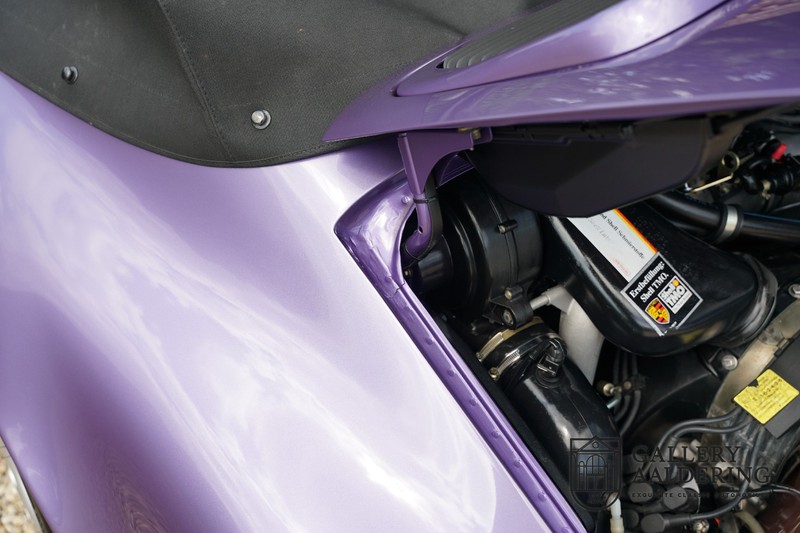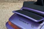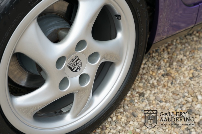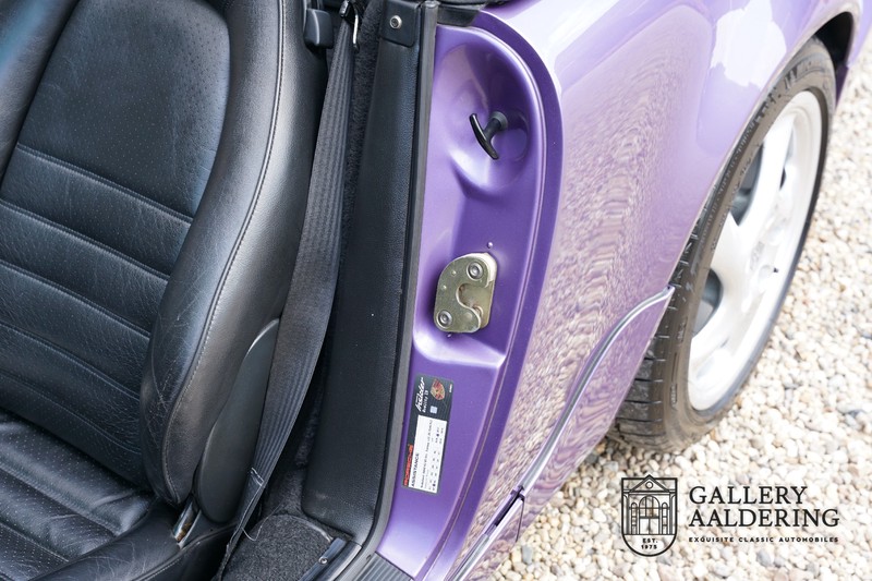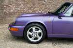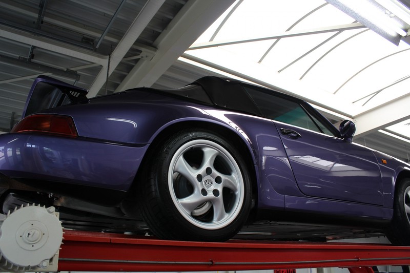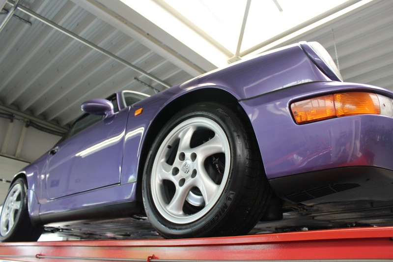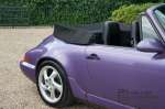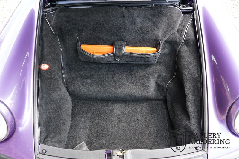 Das erste, was Ihnen beim Anblick dieses 964 auffällt, ist die schöne und originale Violettblau-Metallic-Lackierung. Das Auto ist zu 95% im Erstlack. Der Lack hat leichte Gebrauchsspuren, ist aber insgesamt in einem sehr guten Zustand. Dann fallen die Felgen ins Auge, umgeben von Michelin Pilot Sport Reifen mit „N“ Codierung. Das Cabrioverdeck wurde 2020 ersetzt und sieht aus wie neu. Die Kapuze passt überall gut und kann viele Jahre halten. Die Zierleisten, Stoßstangen und Lampen sind ebenfalls alle in gutem und originalem Zustand.
