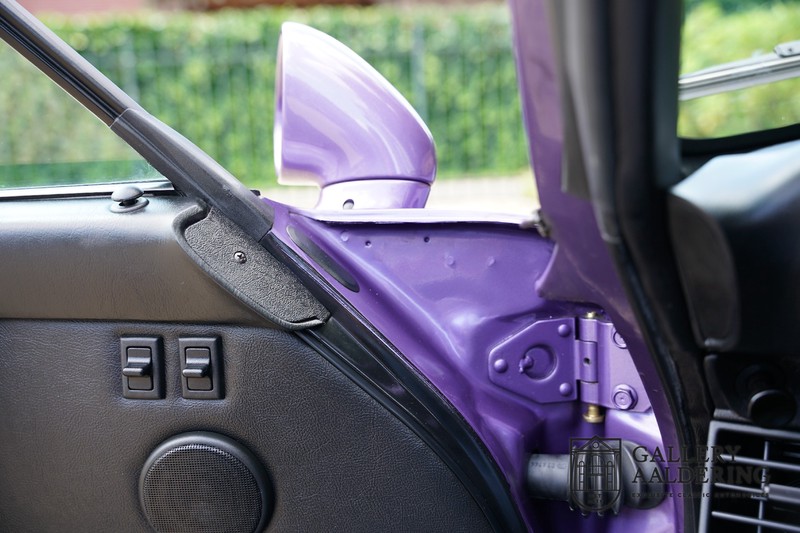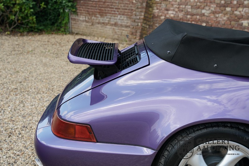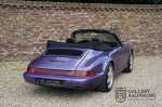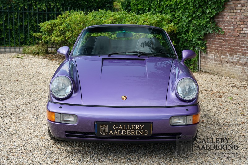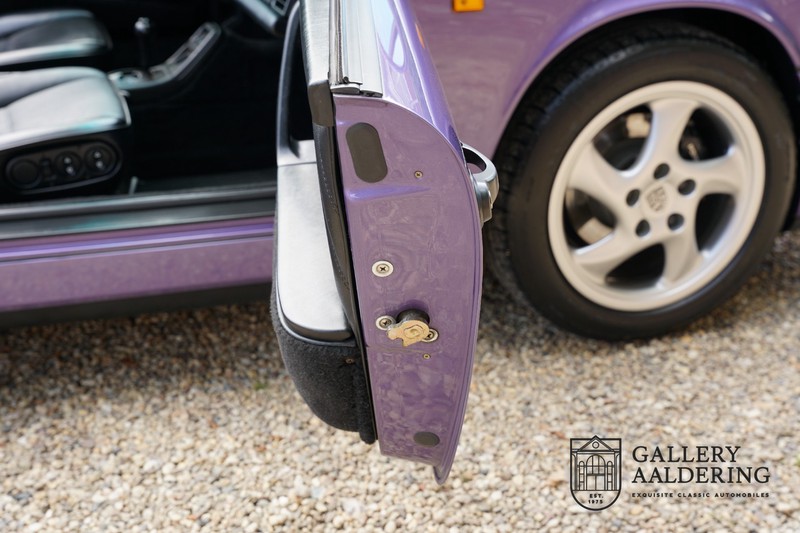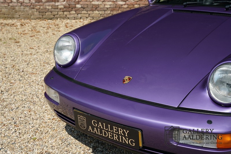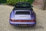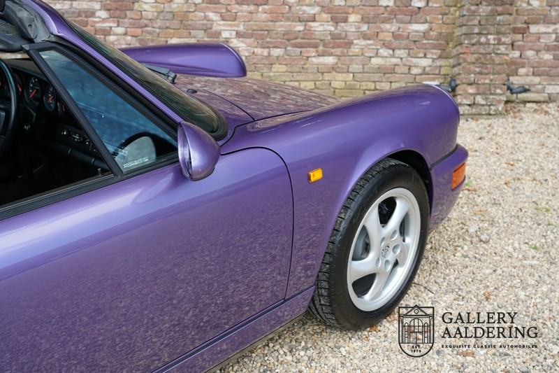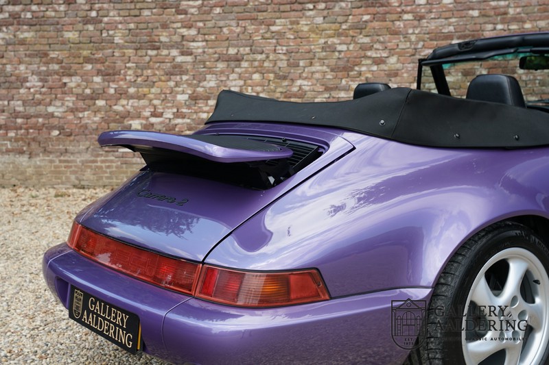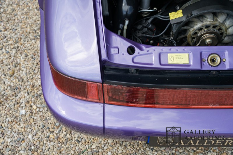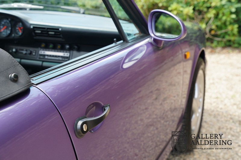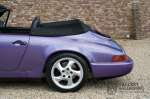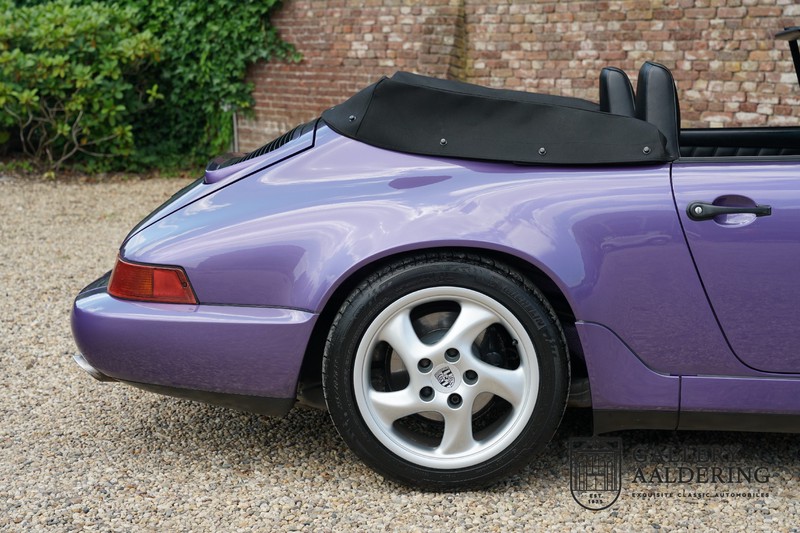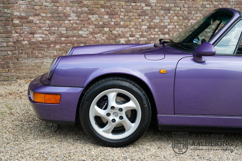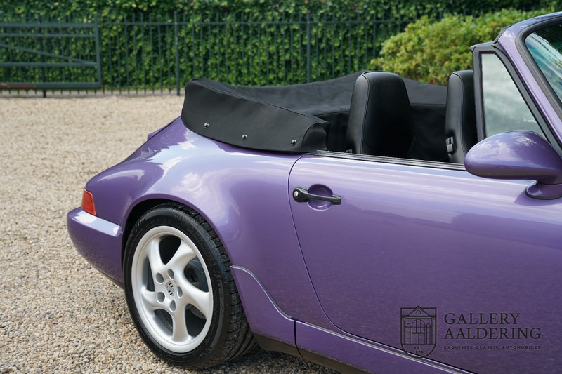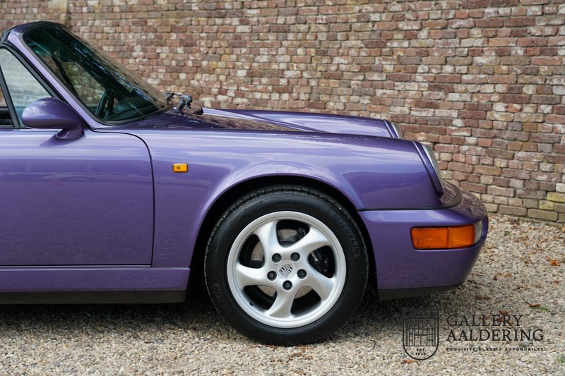 Het eerste dat opvalt bij het zien van deze 964 is de prachtige en originele Violet Blue metallic lak. De auto staat voor 95% in de eerste lak. De lak heeft wat lichte sporen van gebruik maar is over het algemeen in zeer goede staat. Daarna springen de velgen in het oog met daaromheen Michelin Pilot Sport banden mét “N” codering. De cabrioletkap is in 2020 vervangen en ziet er als nieuw uit. De kap sluit overal mooi aan en kan er weer jaren tegenaan. Ook de sierlijsten, bumpers en lampen verkeren allemaal in goede en originele conditie.
