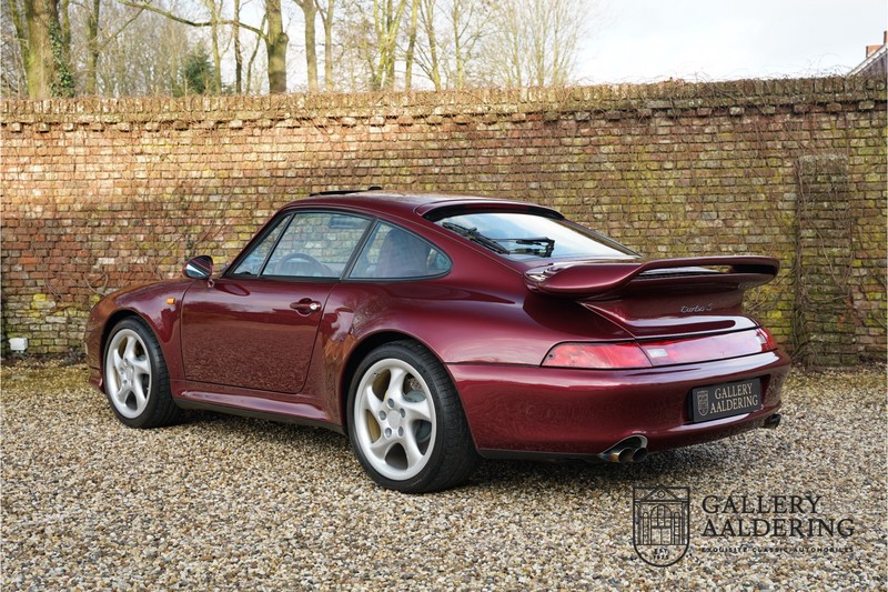 Dit “Arena Rot” exemplaar werd nieuw geleverd op 5 mei 1997 in de Verenigde Staten door Porsche dealer Beechmont Motors in Cincinatti in de staat South Ohio. De auto is via een Belgische verzamelaar in Nederland terechtgekomen. Het betreft hier een matching numbers exemplaar met nog maar 23.787 miles op de teller. De auto verkeert in topconditie. Toen de auto naar Nederland kwam viel op dat de auto door de jaren heen wat steenslag aan de voorzijde had opgelopen. Daar waar de gemiddelde eigenaar genoegen zou nemen met het spuiten van de voorbumper en motorkap bleek zulks niet voldoende te zijn voor de vorige eigenaar. Als absolute liefhebber vatte hij het plan om de auto helemaal kaal te maken en opnieuw te spuiten in de originele kleur. Maar voordat er een begin kon worden gemaakt met de spuitwerkzaamheden werd er eerst een grote bestelling geplaatst om de gehele carrosserie om te bouwen van US-specificaties naar Europese specificaties. Bij de werkzaamheden werd louter gebruik gemaakt van originele onderdelen. De werkzaamheden zijn niet alleen zeer grondig uitgevoerd maar ook naar een hele hoge standaard. Kosten noch moeite werden gespaard om de auto opnieuw te spuiten met als doel een originele lakdikte en perfect resultaat. Arena Rot was de introductie kleur voor de 993 Turbo S en staat de auto fantastisch. De carrosserie en lak verkeren allebei in nieuwstaat. Het plaatwerk is strak, met correcte passingen en is volledig vrij van gebruikerssporen of beschadigingen. De lak is goed gespoten en verkeert vanzelfsprekend in nieuwstaat. Het interieur van de 993 Turbo S werd door Porsche Exclusive volledig bekleed met rood