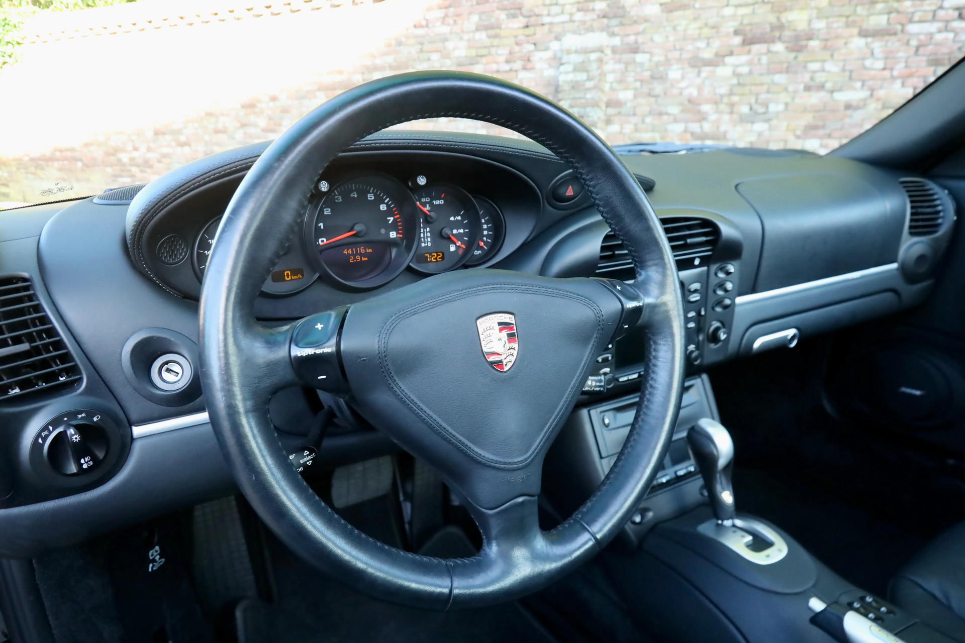 Bovendien is dit een origineel Nederlands geleverde 996 Turbo, volledig volgens Europese specificaties. Sinds nieuw heeft hij slechts 44.000 kilometer gereden, met slechts twee eigenaren sinds de eerste aflevering. Alle serviceboeken en facturen zijn aanwezig, dus de volledige historie is keurig gedocumenteerd – precies zoals u het wilt zien.