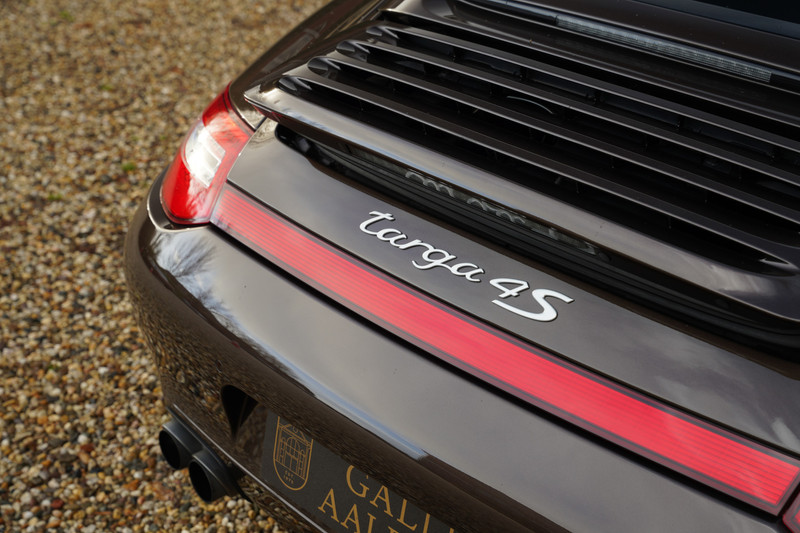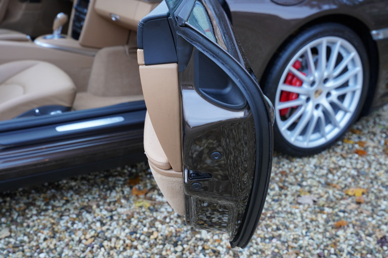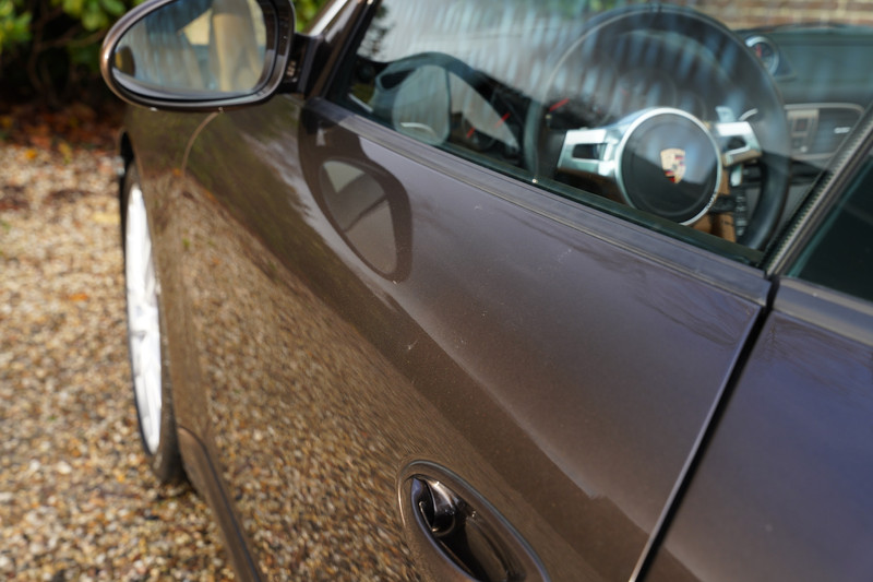 Laten we maar met de deur in huis vallen: deze 911 heeft behoorlijk wat zaken die bij de liefhebber in het juiste keelgat schieten: schakelen doe je in deze 4S met de zeer comfortabele automaat en er is gekozen voor het Sport Chrono Plus pakket. En dan vergeten we haast het optionele schuifdak nog te noemen: bij deze! Ook niet te missen: de schitterende Macadamia metallic lak over een werkelijk prachtig lichtbruin lederen interieur.
