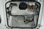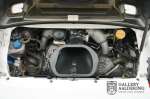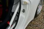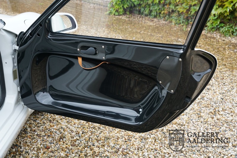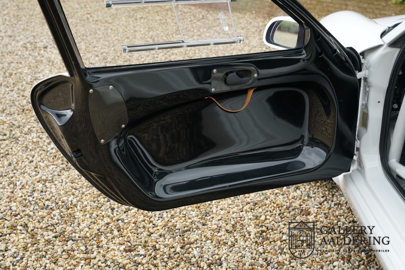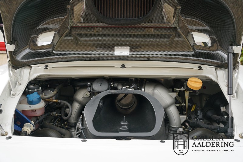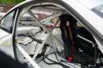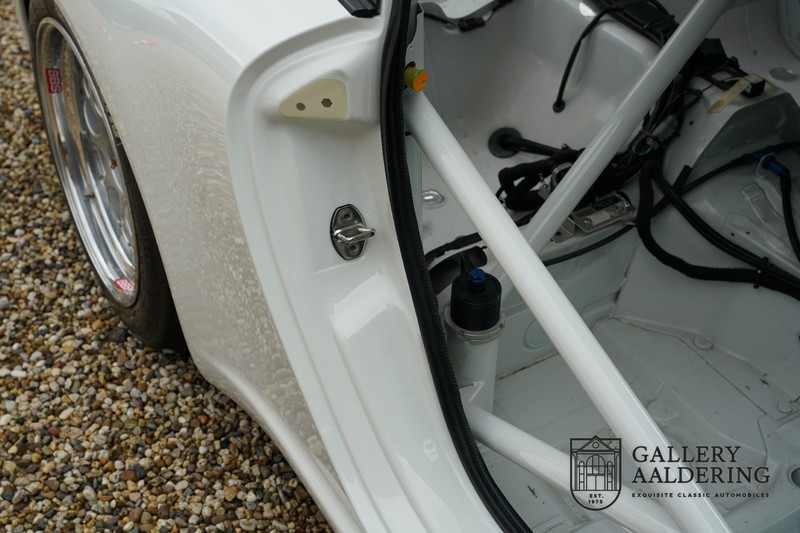 On the inside, this Porsche is exactly as it should be in a racing car: spartan and functional. The standard gauges have been replaced with a central Motec data logger. The usual short gearstick has been replaced by a longer one for ease of use with the sequential gearbox. The usual fairly large leather steering wheel has been replaced with a 3-spoke OMP steering wheel. Naturally, the interior is dominated by the fully FIA approved roll-cage. The car still has the carbon OMP seat Zampredi used. The complete fibreglass doors help keep the car’s weight down.