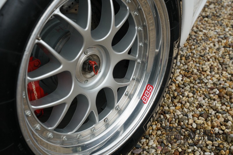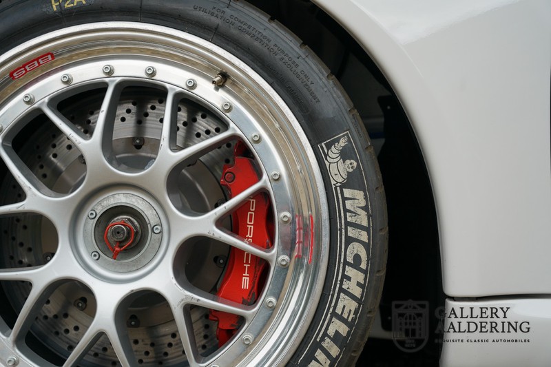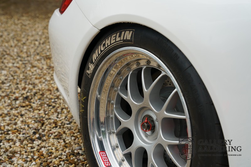 After the season ended the wrap was removed from the bodywork, leaving her now gleaming in her lovely “Carrera Weiss” tailored suit. The outside appearance is completed by the large splitter, the enormous rear spoiler with its Gurney Flap and the iconic 3-part centre-lock BBS rims that are filled by the enormous brakes and shod in Michelin rain tyres. The front brakes have 6 pistons whilst the rear one have 4 pistons fitted, delivering massive brake power as well as being a fantastic sight. All the windows have been replaced with Lexan ones for safety reasons. The car has an inbuilt air-powered jack system. All the suspension rubbers have been replaced with steel uniballs. The car also has a 90-litre fuel tank. The adaptions to this GT3 racer are practically endless. Porsche delivered, as it always does, top craftsmanship.