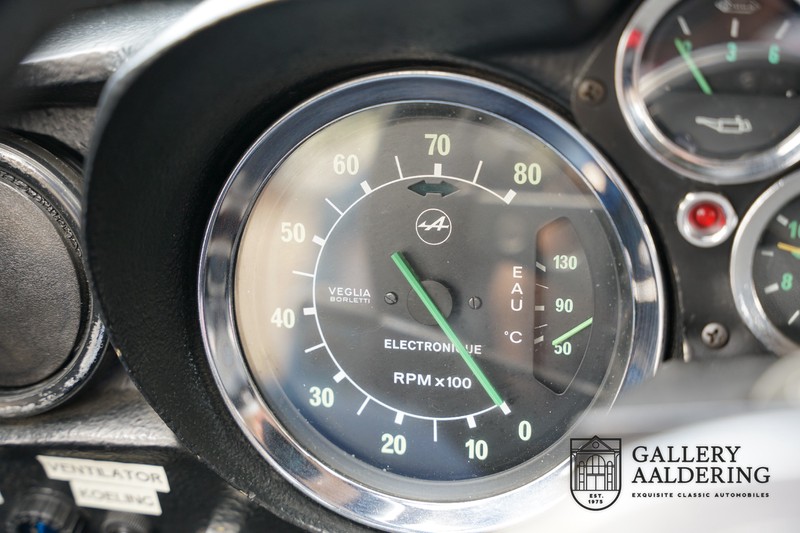 Der A110 wird von einem längs angeordneten 1,6-Liter-Vierzylindermotor angetrieben, der mit zwei Weber-Doppelvergasern ausgestattet ist. Der Motor klingt nicht nur fantastisch, sondern läuft auch wunderbar leicht durch die Drehzahlen. Natürlich reicht ein guter Motor allein nicht aus. Ein präzise schaltendes Getriebe mit schön kurzen Gängen ist das, was ein echtes Fahrerauto unterhalten muss. Glücklicherweise ist das perfekt füreinander. Das manuelle Getriebe verfügt über fünf perfekt aufeinander abgestimmte Gänge. Es macht das Fahren in den Alpen unabhängig von der Geschwindigkeit zu einem wahren Erlebnis. Das Auto hat rundum gute Yokohama-Reifen und ist mit einem breiten Gothi-Satz ausgestattet. Die Technik wurde in den letzten Jahren gut gewartet und beim Fahren merkt man sofort, dass dieser Alpine noch immer in einem Top-Zustand ist.
