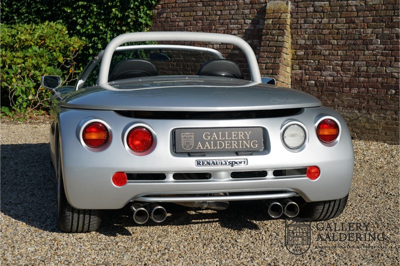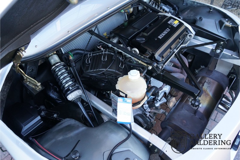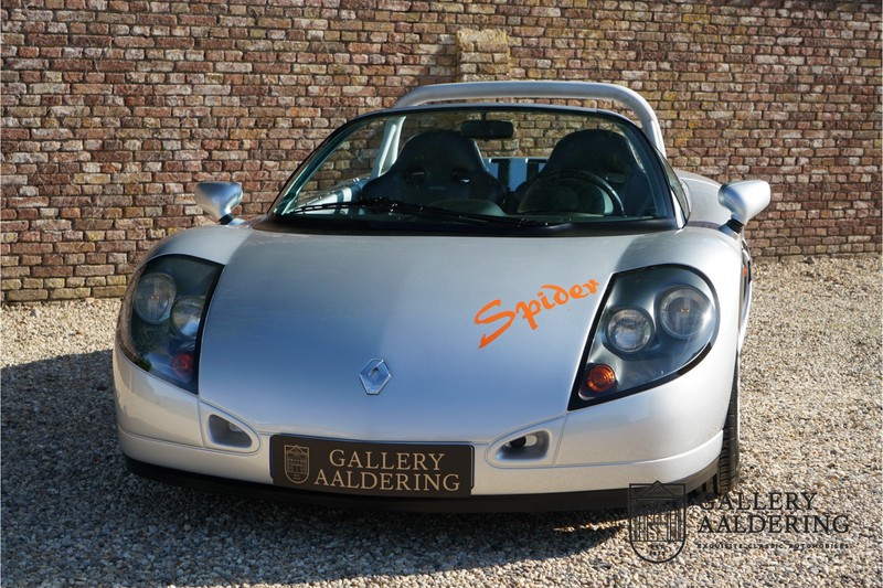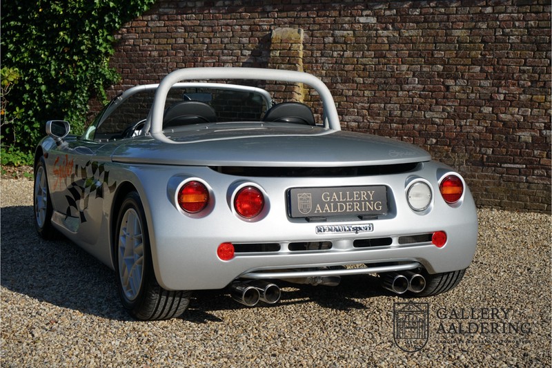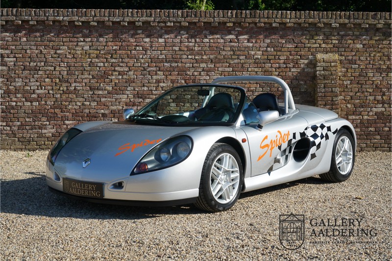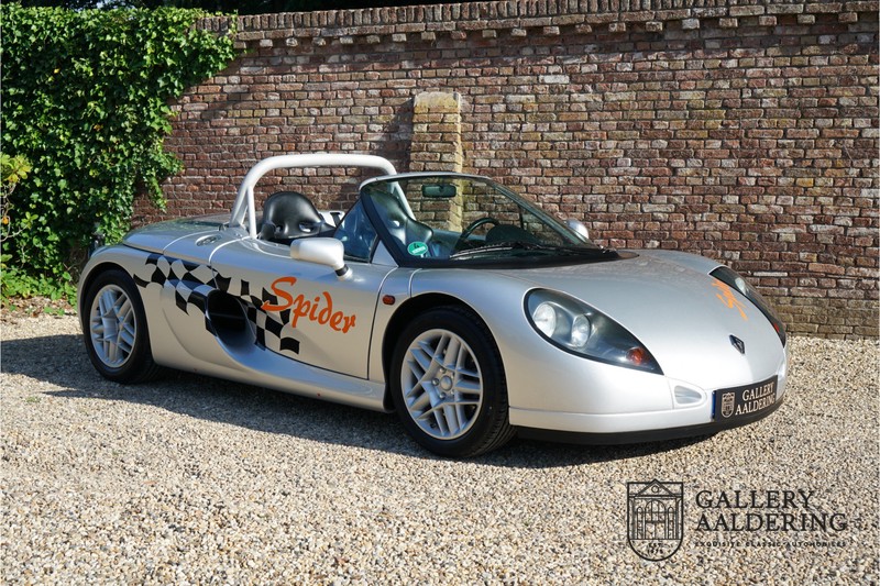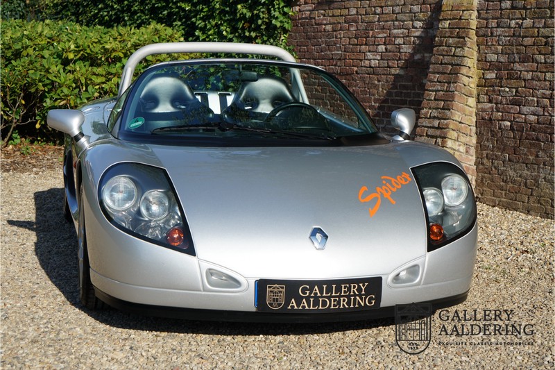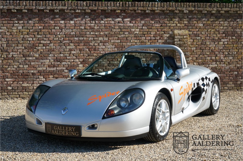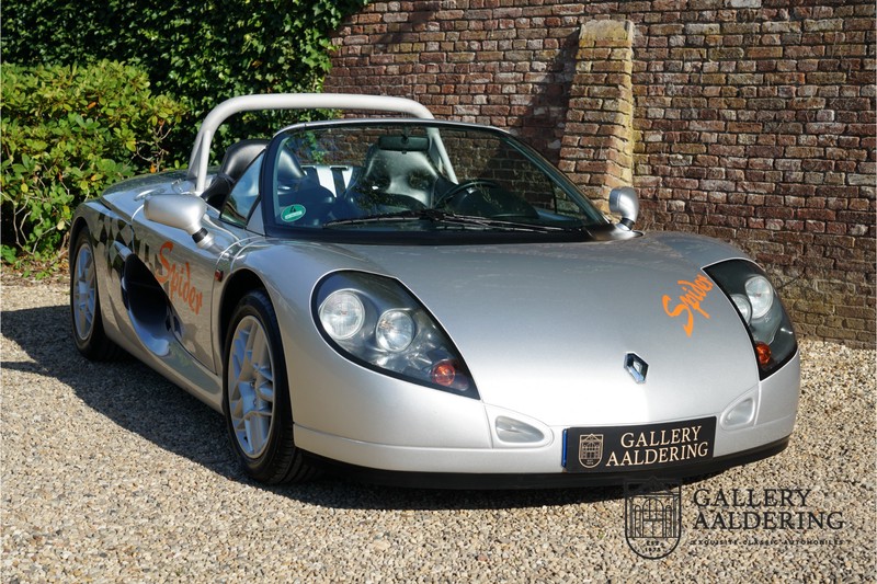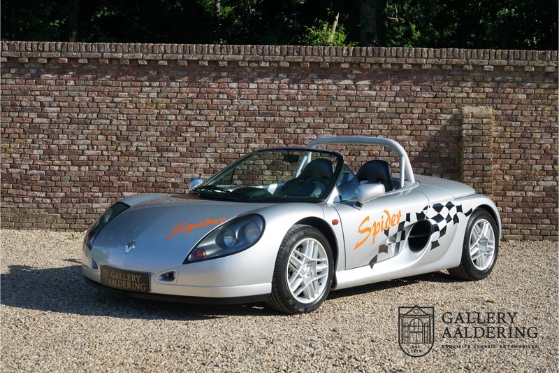 Der Renault Sport Spider wurde ursprünglich als Cup-Spider für den Rennsport konzipiert (Renault Sport Spider Trophy im Vorfeld der Formel 1 und von der Renault Motorsport-Einheit Renault Sport in Dieppe gebaut. So ein Auto wird wahrscheinlich nie mehr gebaut und erst lange nachdem der Produktion eingestellt wurde, hat man das Auto richtig verstanden und den Reiz des Fahrzeugs erkennt. Mit den heutigen Sicherheitsvorschriften kann das Auto nicht mehr gebaut werden, damals hatte man nur einen Ausgangspunkt und das war Fahrspaß ohne Ende. Eigentlich hatte Renault ein wenig Pech, denn zu gleicher Zeit wurde die Lotus Elise introduziert mit einem Gewicht von nur 752 Kilo. Der Renault hatte einen Gewicht von 938 Kilo und das im Vergleich zu der Elise war das etwas zu viel. Der Renault hatte aber auch einige Vorteile, der Sport Spider war ein echter offener Zweisitzer ohne Windschutzscheibe, der Kofferraum war wesentlich besser zu benutzen und wurde nicht so warm, die Sitzposition war besser und vor allem war der Motor viel stärker. Auch ist der Sport Spider viel seltener als die 1e Generation der Lotus Elise. So letztendlich hat alles doch noch geklappt mit dem Sport Spider, auch für die Käufer die sich damals eine Renault Sport Spider bestellt hatten. Nach 20 Jahren ist der Sport Spider einen stabilen Wert in der Leichtgewicht Sportwagen Klasse. Die Wertstabilität war schon immer gut, aber in den letzten Jahren gehen die Preise hoch. Renault hatte vor 2000 Exemplare zu produzieren, aber es wurde eine Stückzahl von 1725 Exemplaren erreicht, wovon 80 Exemplare benutzt wurden für eine spezielle Rennklasse. In der Zeit von Frühjahr 1995 bis Herbst 1999 wurde der Spider auch als Straßenversion mit Windabweiser oder mit einer beheizbaren Windschutzscheibe hergestellt, dieses Exemplar hatte so eine Windschutzscheibe und ein Raid-Airbag-Lenkrad. Man konnte bei Renault noch andere Optionen (die Broschüre ist vorhanden) dazu bestellen und dieses Exemplar hat die schöne 16 Zoll Räder, eine Elia Sportauspuffanlage, ein vollwertiges Verdeck und einen Persenning. Nicht nur die Optionen machen das Auto attraktiv, auch der Zustand des Fahrzeugs sorgt dafür. Die originale und komplette Bordmappe und der zweite Schlüssel sind vorhanden. Das Fahrzeug hatte seine Erstzulassung in 1999 in Deutschland und es ist also eins der letzten Exemplaren. Der Sport Spider befindet sich in einem außergewöhnlich guten und schönen Zustand, die “Gris-Titane“ Lackierung sieht sehr schön aus und die Kunststoff Karosserie befindet sich in einem Topzustand, es gibt keine Beschädigungen und die Passungen sind korrekt. Die nach oben aufschwenkende Scherentüren funktionieren einwandfrei und das Interieur befindet sich in einem sehr guten Zustand. Die Recaro Sportsitze sind wie neu und alle Instrumente funktionieren einwandfrei. Der originale und flache Unterboden befindet sich in makellosen Zustand. Der Motor und das Getriebe sind wie zu erwarten knochentrocken. Die geringe Laufleistung und die sorgfältige Wartungen sind natürlich dafür verantwortlich. Der 2.0 Liter F7R 16v Motor und das Schaltgetriebe kommen aus einer anderen Ikone, nämlich der Renault Clio Wiliams. Die 90er waren ein gutes Jahrzehnt für Renault. Der Motor funktioniert ausgezeichnet und hat einen fantastischen Sound und auch das Getriebe