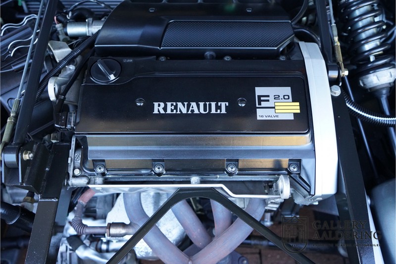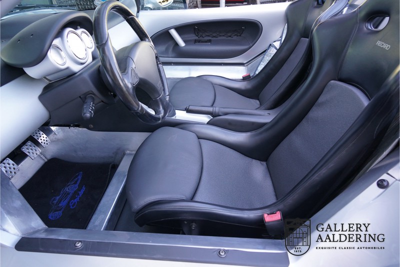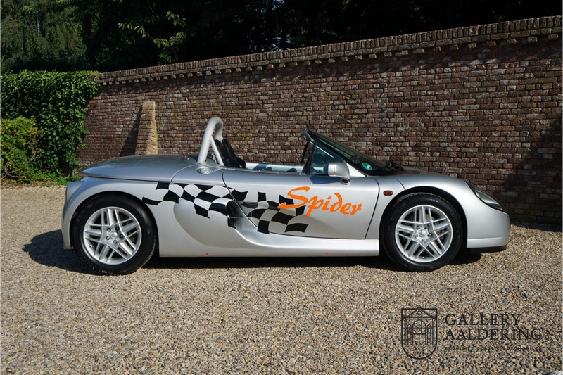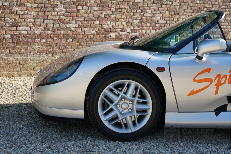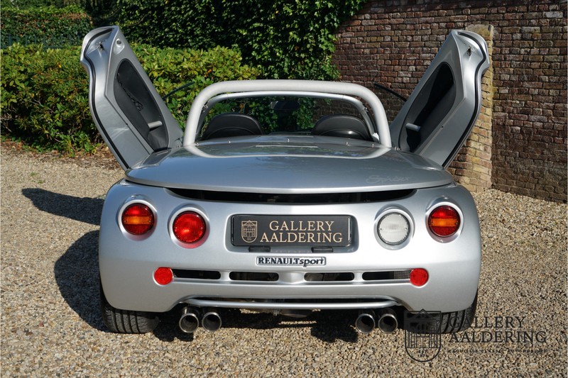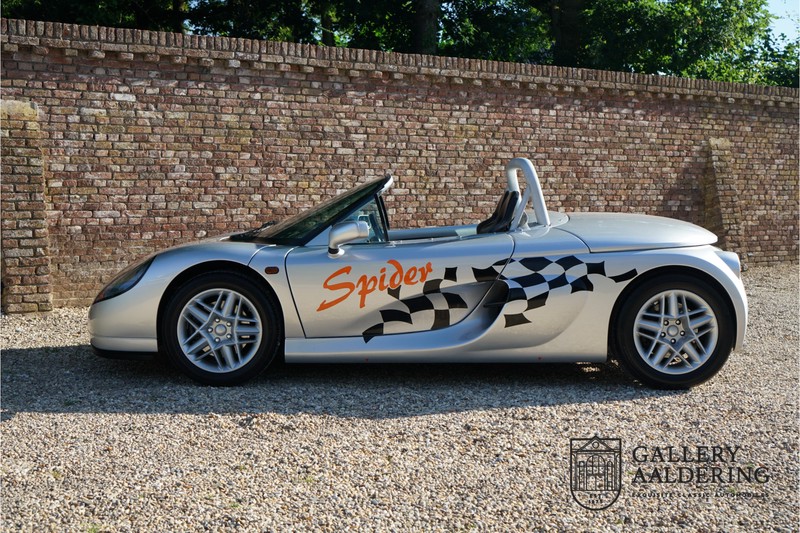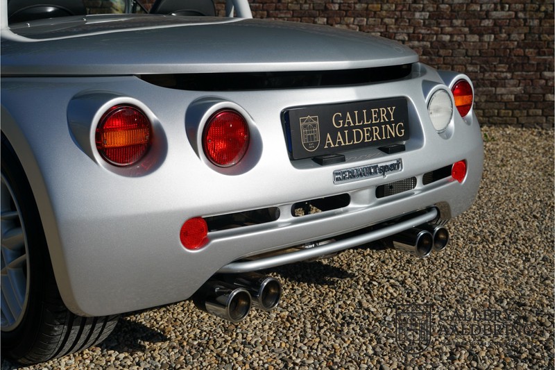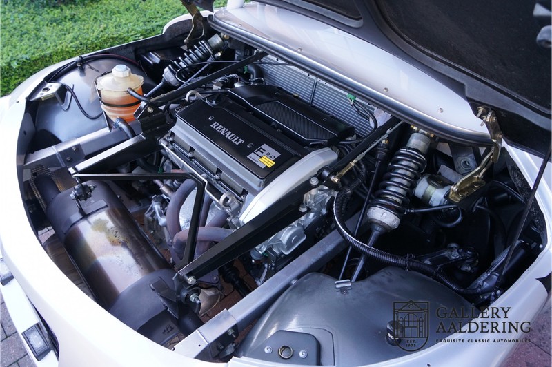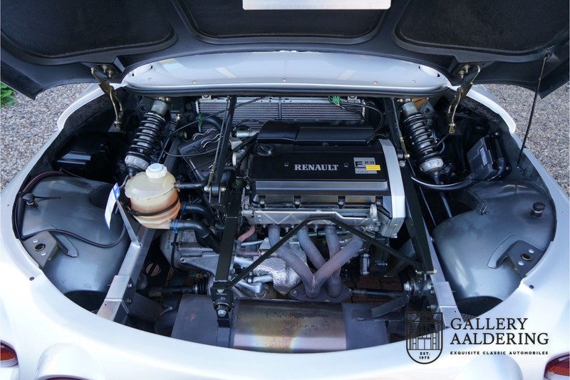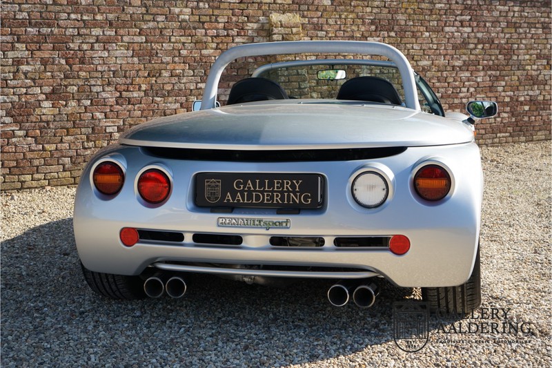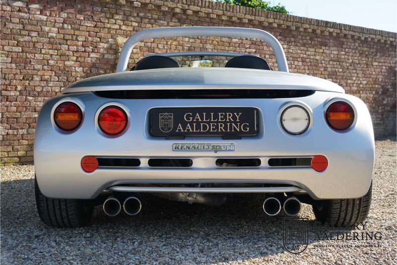 Der Renault Sport Spider wurde ursprünglich als Cup-Spider für den Rennsport konzipiert (Renault Sport Spider Trophy im Vorfeld der Formel 1 und von der Renault Motorsport-Einheit Renault Sport in Dieppe gebaut. So ein Auto wird wahrscheinlich nie mehr gebaut und erst lange nachdem der Produktion eingestellt wurde, hat man das Auto richtig verstanden und den Reiz des Fahrzeugs erkennt. Mit den heutigen Sicherheitsvorschriften kann das Auto nicht mehr gebaut werden, damals hatte man nur einen Ausgangspunkt und das war Fahrspaß ohne Ende. Eigentlich hatte Renault ein wenig Pech, denn zu gleicher Zeit wurde die Lotus Elise introduziert mit einem Gewicht von nur 752 Kilo. Der Renault hatte einen Gewicht von 938 Kilo und das im Vergleich zu der Elise war das etwas zu viel. Der Renault hatte aber auch einige Vorteile, der Sport Spider war ein echter offener Zweisitzer ohne Windschutzscheibe, der Kofferraum war wesentlich besser zu benutzen und wurde nicht so warm, die Sitzposition war besser und vor allem war der Motor viel stärker. Auch ist der Sport Spider viel seltener als die 1e Generation der Lotus Elise. So letztendlich hat alles doch noch geklappt mit dem Sport Spider, auch für die Käufer die sich damals eine Renault Sport Spider bestellt hatten. Nach 20 Jahren ist der Sport Spider einen stabilen Wert in der Leichtgewicht Sportwagen Klasse. Die Wertstabilität war schon immer gut, aber in den letzten Jahren gehen die Preise hoch. Renault hatte vor 2000 Exemplare zu produzieren, aber es wurde eine Stückzahl von 1725 Exemplaren erreicht, wovon 80 Exemplare benutzt wurden für eine spezielle Rennklasse. In der Zeit von Frühjahr 1995 bis Herbst 1999 wurde der Spider auch als Straßenversion mit Windabweiser oder mit einer beheizbaren Windschutzscheibe hergestellt, dieses Exemplar hatte so eine Windschutzscheibe und ein Raid-Airbag-Lenkrad. Man konnte bei Renault noch andere Optionen (die Broschüre ist vorhanden) dazu bestellen und dieses Exemplar hat die schöne 16 Zoll Räder, eine Elia Sportauspuffanlage, ein vollwertiges Verdeck und einen Persenning. Nicht nur die Optionen machen das Auto attraktiv, auch der Zustand des Fahrzeugs sorgt dafür. Die originale und komplette Bordmappe und der zweite Schlüssel sind vorhanden. Das Fahrzeug hatte seine Erstzulassung in 1999 in Deutschland und es ist also eins der letzten Exemplaren. Der Sport Spider befindet sich in einem außergewöhnlich guten und schönen Zustand, die “Gris-Titane“ Lackierung sieht sehr schön aus und die Kunststoff Karosserie befindet sich in einem Topzustand, es gibt keine Beschädigungen und die Passungen sind korrekt. Die nach oben aufschwenkende Scherentüren funktionieren einwandfrei und das Interieur befindet sich in einem sehr guten Zustand. Die Recaro Sportsitze sind wie neu und alle Instrumente funktionieren einwandfrei. Der originale und flache Unterboden befindet sich in makellosen Zustand. Der Motor und das Getriebe sind wie zu erwarten knochentrocken. Die geringe Laufleistung und die sorgfältige Wartungen sind natürlich dafür verantwortlich. Der 2.0 Liter F7R 16v Motor und das Schaltgetriebe kommen aus einer anderen Ikone, nämlich der Renault Clio Wiliams. Die 90er waren ein gutes Jahrzehnt für Renault. Der Motor funktioniert ausgezeichnet und hat einen fantastischen Sound und auch das Getriebe