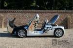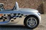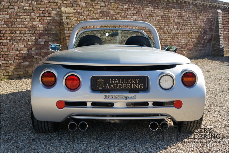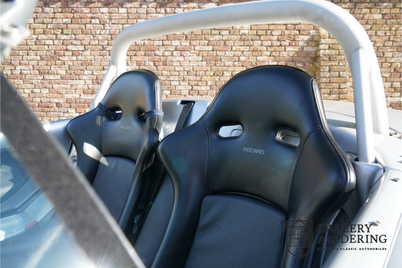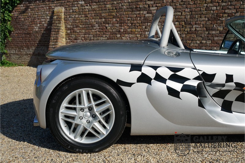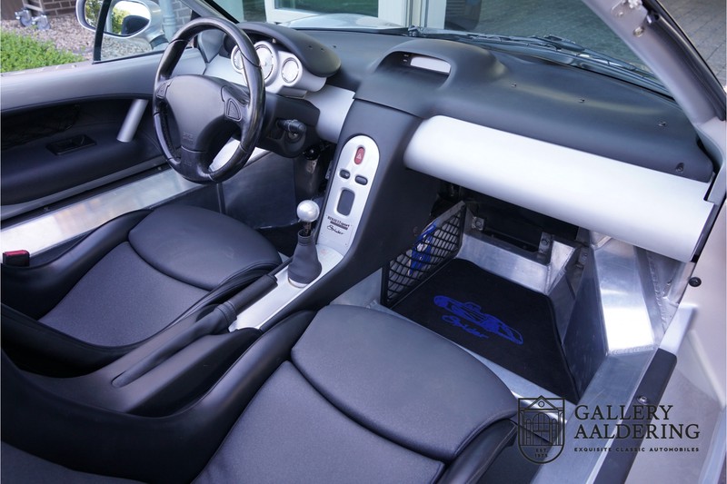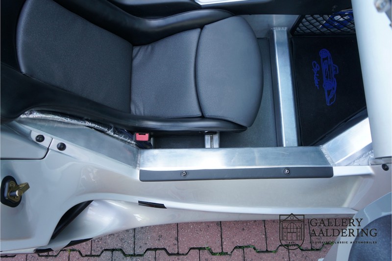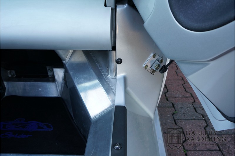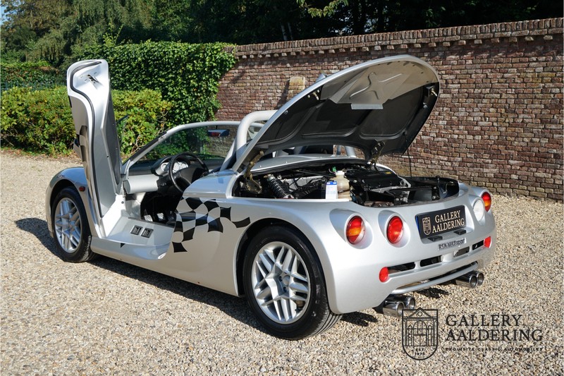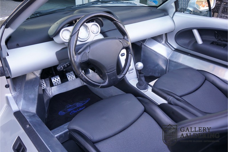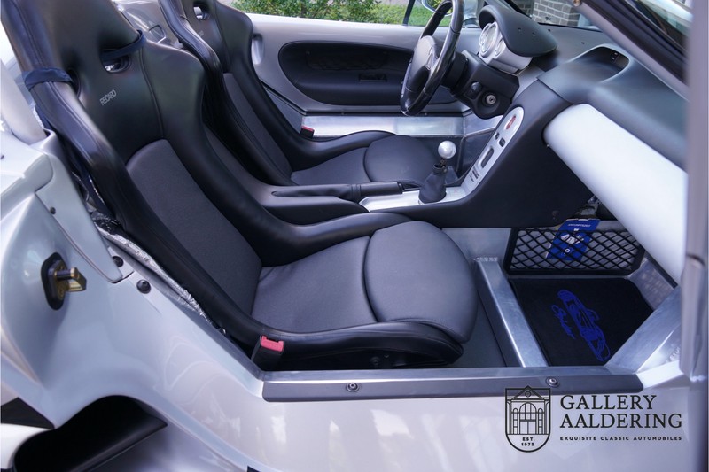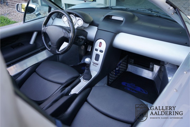 Der Renault Sport Spider wurde ursprünglich als Cup-Spider für den Rennsport konzipiert (Renault Sport Spider Trophy im Vorfeld der Formel 1 und von der Renault Motorsport-Einheit Renault Sport in Dieppe gebaut. So ein Auto wird wahrscheinlich nie mehr gebaut und erst lange nachdem der Produktion eingestellt wurde, hat man das Auto richtig verstanden und den Reiz des Fahrzeugs erkennt. Mit den heutigen Sicherheitsvorschriften kann das Auto nicht mehr gebaut werden, damals hatte man nur einen Ausgangspunkt und das war Fahrspaß ohne Ende. Eigentlich hatte Renault ein wenig Pech, denn zu gleicher Zeit wurde die Lotus Elise introduziert mit einem Gewicht von nur 752 Kilo. Der Renault hatte einen Gewicht von 938 Kilo und das im Vergleich zu der Elise war das etwas zu viel. Der Renault hatte aber auch einige Vorteile, der Sport Spider war ein echter offener Zweisitzer ohne Windschutzscheibe, der Kofferraum war wesentlich besser zu benutzen und wurde nicht so warm, die Sitzposition war besser und vor allem war der Motor viel stärker. Auch ist der Sport Spider viel seltener als die 1e Generation der Lotus Elise. So letztendlich hat alles doch noch geklappt mit dem Sport Spider, auch für die Käufer die sich damals eine Renault Sport Spider bestellt hatten. Nach 20 Jahren ist der Sport Spider einen stabilen Wert in der Leichtgewicht Sportwagen Klasse. Die Wertstabilität war schon immer gut, aber in den letzten Jahren gehen die Preise hoch. Renault hatte vor 2000 Exemplare zu produzieren, aber es wurde eine Stückzahl von 1725 Exemplaren erreicht, wovon 80 Exemplare benutzt wurden für eine spezielle Rennklasse. In der Zeit von Frühjahr 1995 bis Herbst 1999 wurde der Spider auch als Straßenversion mit Windabweiser oder mit einer beheizbaren Windschutzscheibe hergestellt, dieses Exemplar hatte so eine Windschutzscheibe und ein Raid-Airbag-Lenkrad. Man konnte bei Renault noch andere Optionen (die Broschüre ist vorhanden) dazu bestellen und dieses Exemplar hat die schöne 16 Zoll Räder, eine Elia Sportauspuffanlage, ein vollwertiges Verdeck und einen Persenning. Nicht nur die Optionen machen das Auto attraktiv, auch der Zustand des Fahrzeugs sorgt dafür. Die originale und komplette Bordmappe und der zweite Schlüssel sind vorhanden. Das Fahrzeug hatte seine Erstzulassung in 1999 in Deutschland und es ist also eins der letzten Exemplaren. Der Sport Spider befindet sich in einem außergewöhnlich guten und schönen Zustand, die “Gris-Titane“ Lackierung sieht sehr schön aus und die Kunststoff Karosserie befindet sich in einem Topzustand, es gibt keine Beschädigungen und die Passungen sind korrekt. Die nach oben aufschwenkende Scherentüren funktionieren einwandfrei und das Interieur befindet sich in einem sehr guten Zustand. Die Recaro Sportsitze sind wie neu und alle Instrumente funktionieren einwandfrei. Der originale und flache Unterboden befindet sich in makellosen Zustand. Der Motor und das Getriebe sind wie zu erwarten knochentrocken. Die geringe Laufleistung und die sorgfältige Wartungen sind natürlich dafür verantwortlich. Der 2.0 Liter F7R 16v Motor und das Schaltgetriebe kommen aus einer anderen Ikone, nämlich der Renault Clio Wiliams. Die 90er waren ein gutes Jahrzehnt für Renault. Der Motor funktioniert ausgezeichnet und hat einen fantastischen Sound und auch das Getriebe