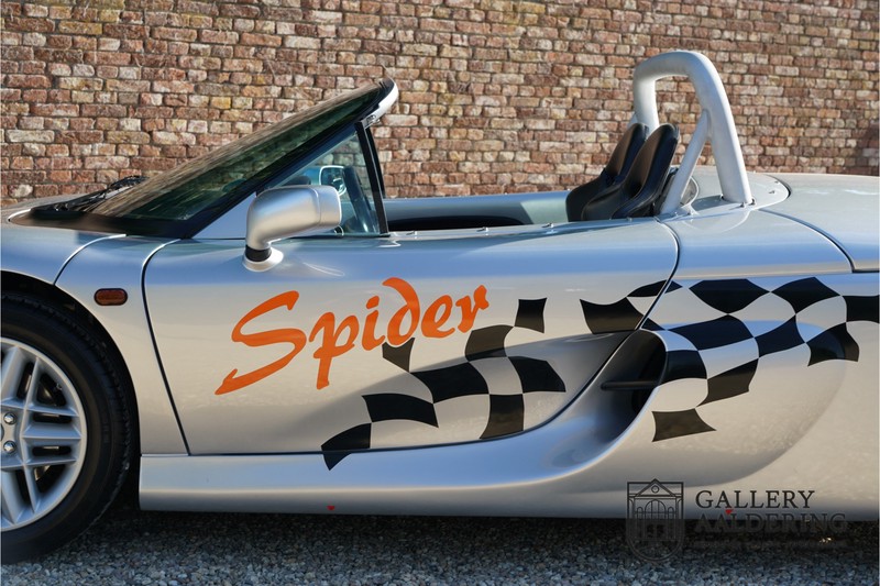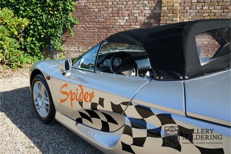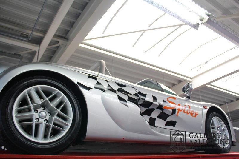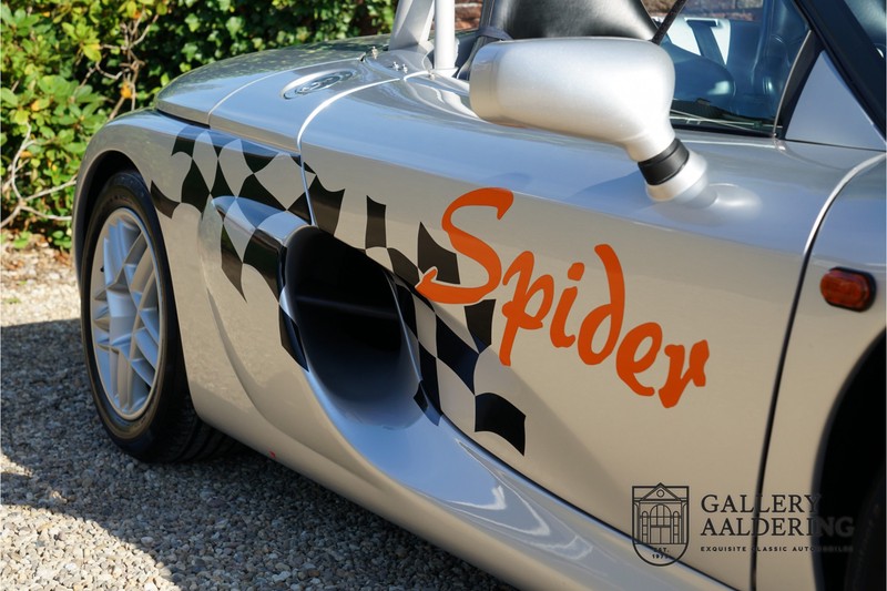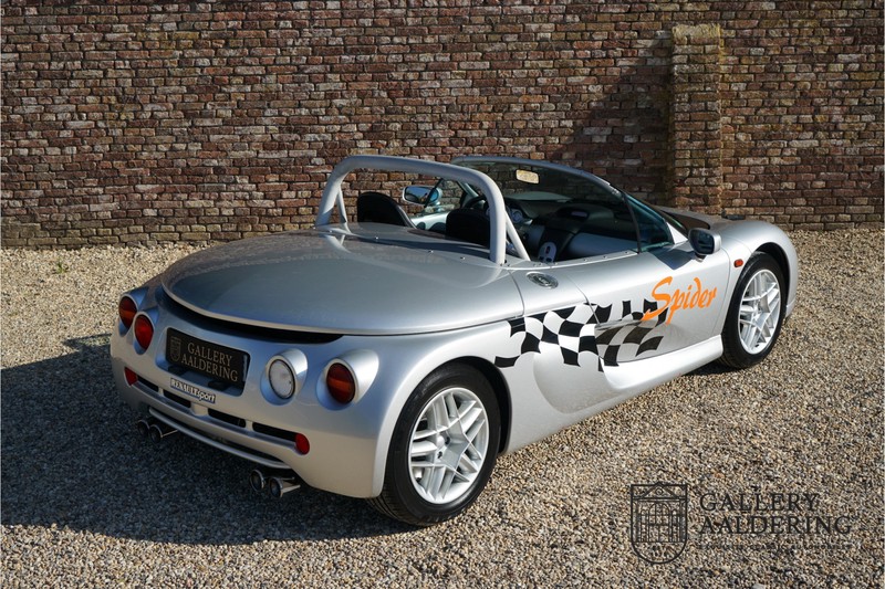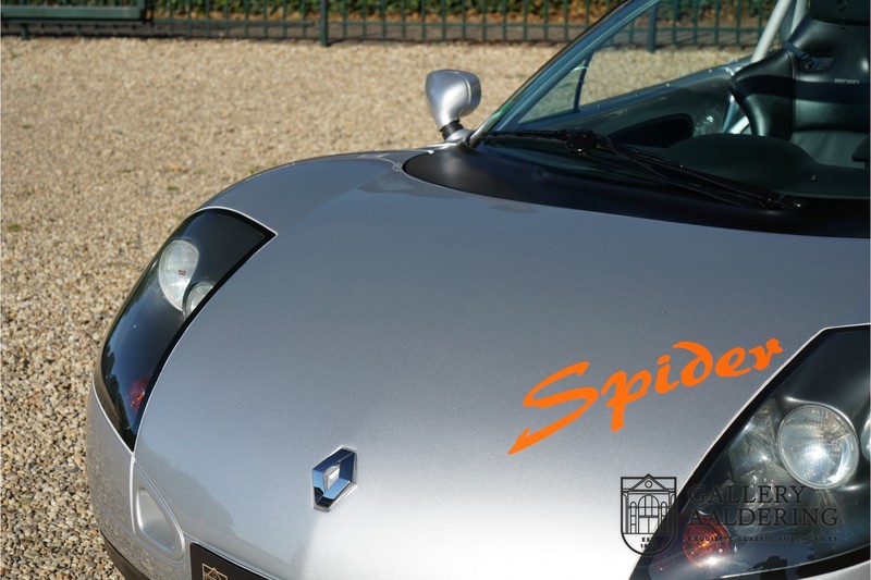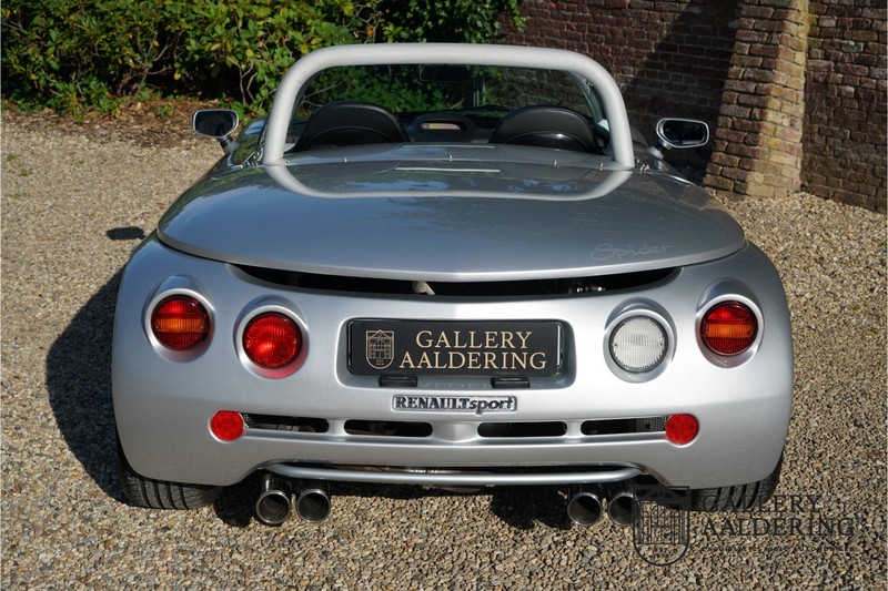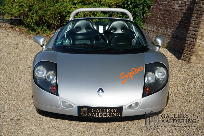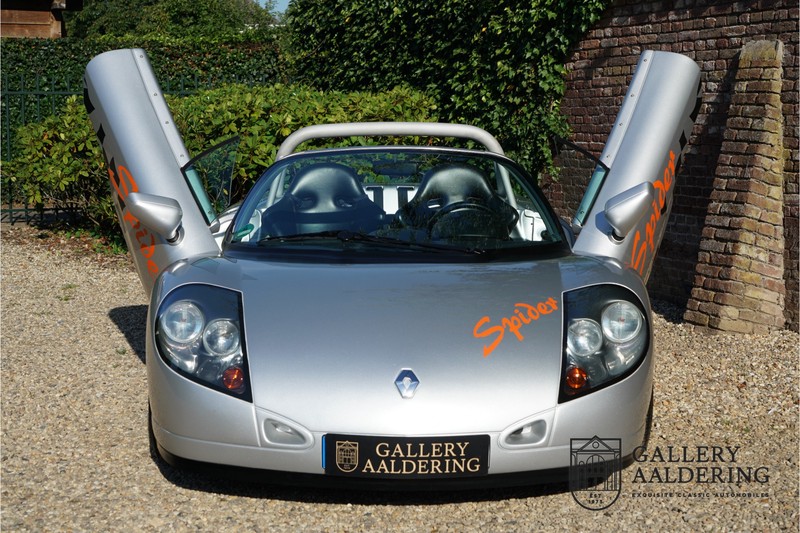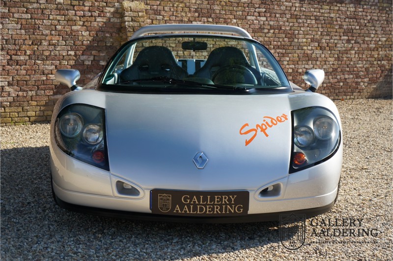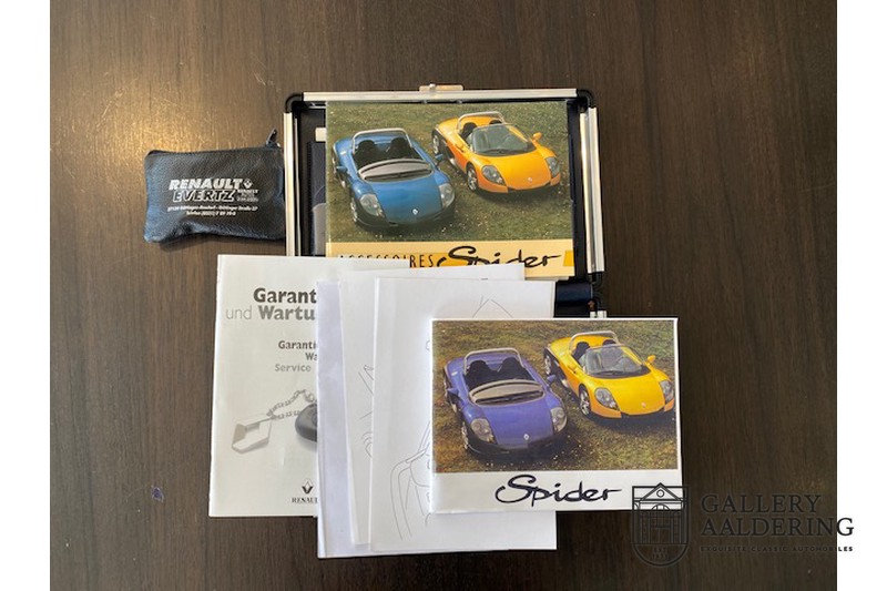 De Renault Sport Spider, typisch zo’n auto die nooit meer zal worden herhaald en ook typisch een auto die pas ver nadat de productie was gestaakt écht werd begrepen. In de jaren ’90 kon het voor autofabrikanten nog uit om een auto te ontwikkelen met maar één doel: rijplezier. Met de huidige strenge eisen aan uitstoot en voetgangersveiligheid is één ding zeker: een pure sportauto zoals de Renault Sport Spider zal in deze tijden nooit meer op de markt komen. Laten we er maar niet omheen draaien. Renault had stomme pech met de introductie van de Sport Spider. Vrijwel tegelijk werd de eerste generatie van de Lotus Elise geïntroduceerd die in de meest lichte configuratie slechts 752 kilo in de schaal legde. De 938 kilo lichte Renault leek daarom een beetje zwaarlijvig. Toch had de Renault Sport Spider een aantal absolute voordelen ten opzichte van de Lotus. Je kon de Spider bestellen zonder voorruit, het is een échte open tweezitter, de bagageruimte is een stuk beter toegankelijk en wordt minder warm, de zitpositie is prettiger en bovenal: de motor in de Renault Sport Spider is oneindig veel sterker dan de K-series van Rover in de Lotus. Een ander bijkomend voordeel is tegenwoordig dat de Renault Sport Spider een stuk zeldzamer is dan de eerste generatie van de Lotus Elise. We kunnen dus wel stellen dat het achteraf helemaal goed is gekomen met de mensen die dapper genoeg waren om in de jaren ’90 een Renault Sport Spider te bestellen. Want inmiddels zijn er ruim 20 jaren verstreken en is de Renault Sport Spider een vaste waarde in de lichtgewicht sportauto klasse. De waardes zijn nooit écht laag geweest maar stijgen de afgelopen jaar gestaag. Renault was voornemens om er 2.000 stuks van te bouwen. De teller bleef echter steken op 1.725 waarvan er 80 werden gebruikt voor een speciale raceklasse. Deze Renault Sport Spider is full-options. In “Renault-Sport-Spider-land” wil dat zoveel zeggen als: een voorruit en een stuur met airbag. Renault had een vrij uitgebreid programma met fabrieks-accessoires voor de Spider. Deze auto is ondermeer uitgerust met de optionele 16 inch accessoire wielen, zelfs de folder met accessoires is bij de auto aanwezig! Daarnaast heeft de vorige eigenaar deze auto verder aangekleed met een aantal overige accessoires zoals een Elia sportuitlaat, een volwaardige cabriolet kapt, een decal set geïnspireerd op de Spider Trophy en een tonneau cover. Het zijn niet alleen de accessoires die dit tot een leuke auto maken maar ook de staat waarin ze verkeert en het feit dat de originele boordmap bewaard is gebleven inclusief handleiding en onderhoudsboekje. Vanzelfsprekend is ook de reservesleutel aanwezig. Deze Renault Sport Spider werd voor het eerst toegelaten tot het verkeer in Duitsland in 1999. Het betreft hier dus één van de allerlaatste Renault Sport Spiders. De auto verkeert in een uitzonderlijk fraaie staat. De “Gris Titane”-lak is in zeer goede conditie en ook de kunststof carrosserie verkeert in uitzonderlijk fraaie staat. De body is nergens beschadigd en de passingen zijn correct.Ook de omhoog bewegende deuren laten zich makkelijk bedienen en sluiten perfect. Het interieur verkeert ook in zeer goede staat. De Recaro-sportstoelen zijn in nieuwstaat en ook alle interieur-panelen zijn zeer goed verzorgd en alle instrumenten functioneren zoals verwacht. De auto is aan der onderzijde ook in zeer goede staat. De vlakke bodem is vrij van beschadigingen en in originele staat. De motor en versnellingsbak zijn zoals mag worden verwacht: kurkdroog. De combinatie van de lage kilometerstand van slechts 29.934 en de zeer goede staat van onderhoud maken dat de Renault Sport Spider technisch ook in top staat verkeert. De 2.0 F7R 16V motor en de handgeschakelde transmissie zijn rechtstreeks afkomstig uit de iconische Renault Clio Williams, achteraf kunnen we stellen dat de jaren ’90 een zeer goede periode was voor Renault. De motor loopt perfect en klinkt fantastisch. De transmissie laat zich soepel en eenvoudig bedienen en schakelt trefzeker. De 2.0 16V-motor levert 150 pk en zorgt voor een sprint van 0-100 in 6.9 seconden. De topsnelheid ligt op 215 kilometer per uur. De motorruimte is een lust voor het oog, ook hier komt de uitzonderlijke conditie van dit exemplaar weer naar voren. Kortom: met recht een top exemplaar van de Renault Sport Spider met een prachtige lage kilometerstand in een uitzonderlijke staat. De volledige historie is aanwezig en er mankeert werkelijk niets aan de auto. Een zeer interessante auto voor de serieuze verzamelaar of een perfecte auto voor iemand die op zoek is naar één van de beste Renault Sport Spiders op de markt.