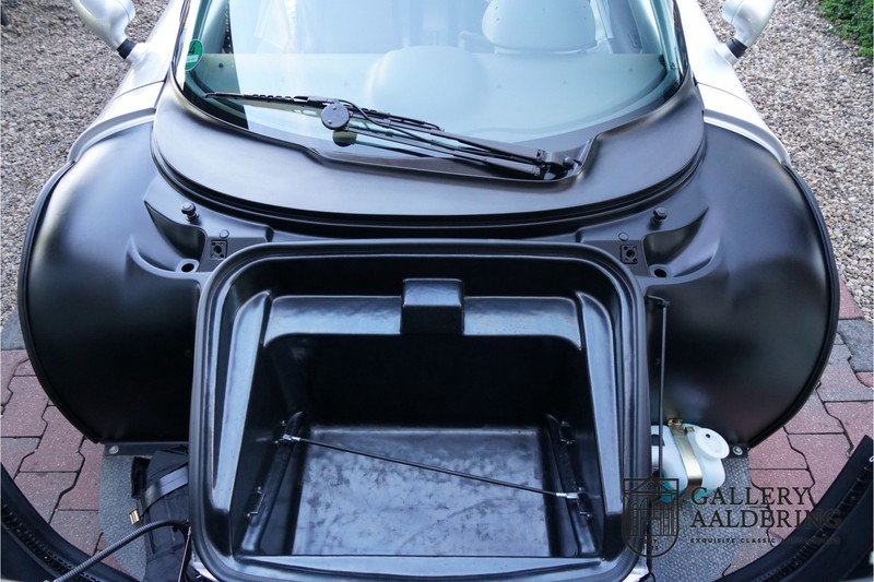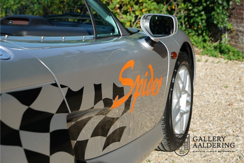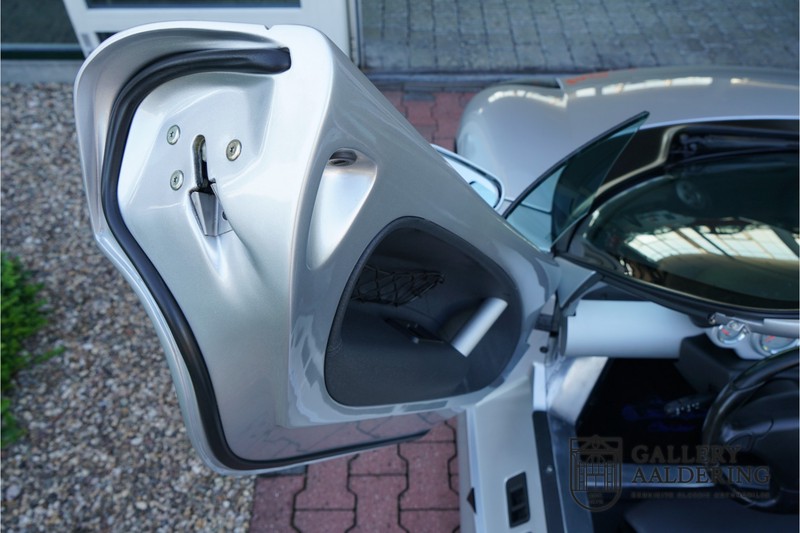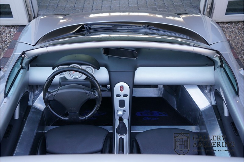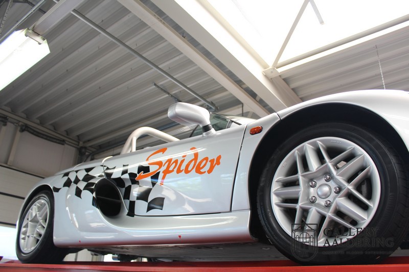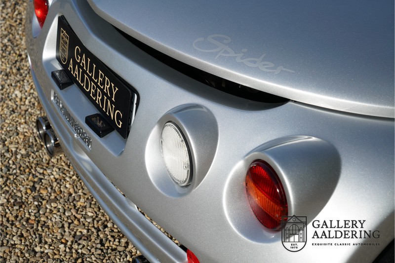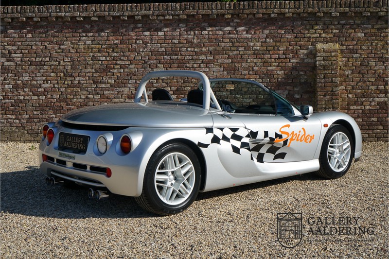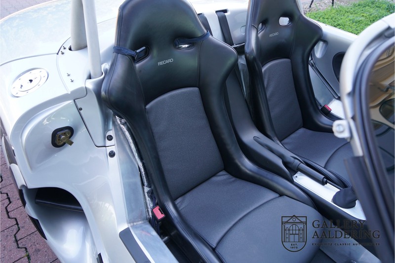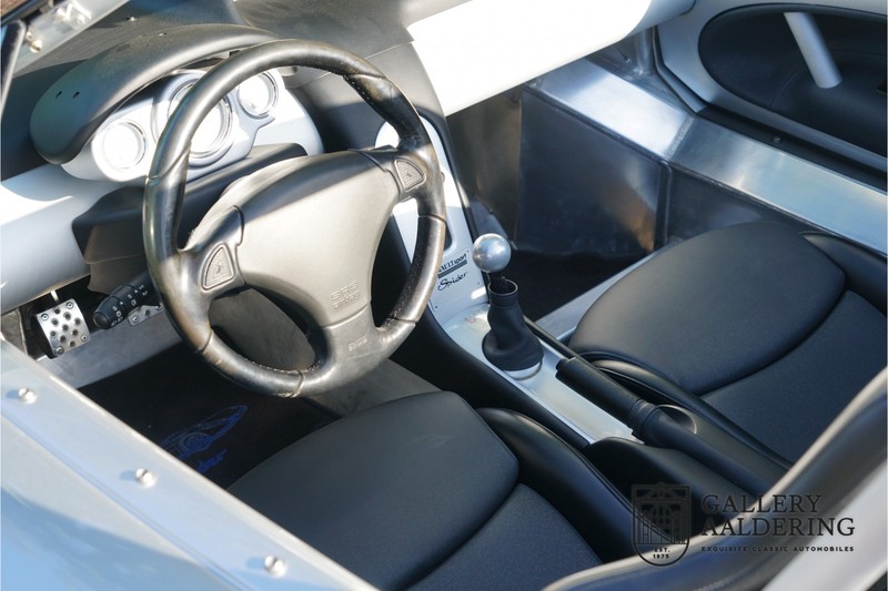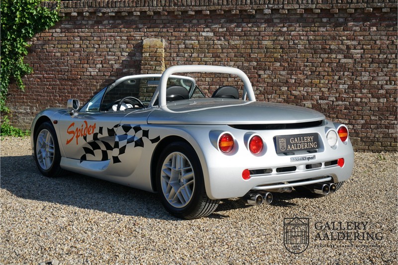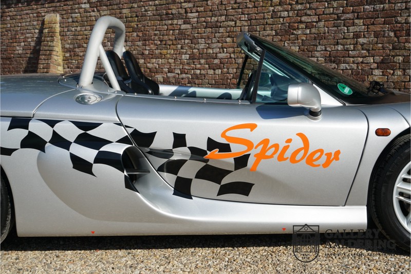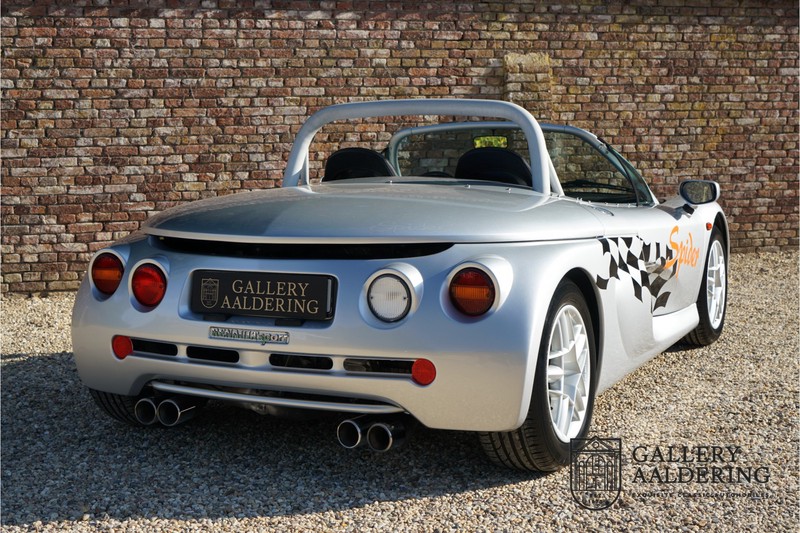 De Renault Sport Spider, typisch zo’n auto die nooit meer zal worden herhaald en ook typisch een auto die pas ver nadat de productie was gestaakt écht werd begrepen. In de jaren ’90 kon het voor autofabrikanten nog uit om een auto te ontwikkelen met maar één doel: rijplezier. Met de huidige strenge eisen aan uitstoot en voetgangersveiligheid is één ding zeker: een pure sportauto zoals de Renault Sport Spider zal in deze tijden nooit meer op de markt komen. Laten we er maar niet omheen draaien. Renault had stomme pech met de introductie van de Sport Spider. Vrijwel tegelijk werd de eerste generatie van de Lotus Elise geïntroduceerd die in de meest lichte configuratie slechts 752 kilo in de schaal legde. De 938 kilo lichte Renault leek daarom een beetje zwaarlijvig. Toch had de Renault Sport Spider een aantal absolute voordelen ten opzichte van de Lotus. Je kon de Spider bestellen zonder voorruit, het is een échte open tweezitter, de bagageruimte is een stuk beter toegankelijk en wordt minder warm, de zitpositie is prettiger en bovenal: de motor in de Renault Sport Spider is oneindig veel sterker dan de K-series van Rover in de Lotus. Een ander bijkomend voordeel is tegenwoordig dat de Renault Sport Spider een stuk zeldzamer is dan de eerste generatie van de Lotus Elise. We kunnen dus wel stellen dat het achteraf helemaal goed is gekomen met de mensen die dapper genoeg waren om in de jaren ’90 een Renault Sport Spider te bestellen. Want inmiddels zijn er ruim 20 jaren verstreken en is de Renault Sport Spider een vaste waarde in de lichtgewicht sportauto klasse. De waardes zijn nooit écht laag geweest maar stijgen de afgelopen jaar gestaag. Renault was voornemens om er 2.000 stuks van te bouwen. De teller bleef echter steken op 1.725 waarvan er 80 werden gebruikt voor een speciale raceklasse. Deze Renault Sport Spider is full-options. In “Renault-Sport-Spider-land” wil dat zoveel zeggen als: een voorruit en een stuur met airbag. Renault had een vrij uitgebreid programma met fabrieks-accessoires voor de Spider. Deze auto is ondermeer uitgerust met de optionele 16 inch accessoire wielen, zelfs de folder met accessoires is bij de auto aanwezig! Daarnaast heeft de vorige eigenaar deze auto verder aangekleed met een aantal overige accessoires zoals een Elia sportuitlaat, een volwaardige cabriolet kapt, een decal set geïnspireerd op de Spider Trophy en een tonneau cover. Het zijn niet alleen de accessoires die dit tot een leuke auto maken maar ook de staat waarin ze verkeert en het feit dat de originele boordmap bewaard is gebleven inclusief handleiding en onderhoudsboekje. Vanzelfsprekend is ook de reservesleutel aanwezig. Deze Renault Sport Spider werd voor het eerst toegelaten tot het verkeer in Duitsland in 1999. Het betreft hier dus één van de allerlaatste Renault Sport Spiders. De auto verkeert in een uitzonderlijk fraaie staat. De “Gris Titane”-lak is in zeer goede conditie en ook de kunststof carrosserie verkeert in uitzonderlijk fraaie staat. De body is nergens beschadigd en de passingen zijn correct.Ook de omhoog bewegende deuren laten zich makkelijk bedienen en sluiten perfect. Het interieur verkeert ook in zeer goede staat. De Recaro-sportstoelen zijn in nieuwstaat en ook alle interieur-panelen zijn zeer goed verzorgd en alle instrumenten functioneren zoals verwacht. De auto is aan der onderzijde ook in zeer goede staat. De vlakke bodem is vrij van beschadigingen en in originele staat. De motor en versnellingsbak zijn zoals mag worden verwacht: kurkdroog. De combinatie van de lage kilometerstand van slechts 29.934 en de zeer goede staat van onderhoud maken dat de Renault Sport Spider technisch ook in top staat verkeert. De 2.0 F7R 16V motor en de handgeschakelde transmissie zijn rechtstreeks afkomstig uit de iconische Renault Clio Williams, achteraf kunnen we stellen dat de jaren ’90 een zeer goede periode was voor Renault. De motor loopt perfect en klinkt fantastisch. De transmissie laat zich soepel en eenvoudig bedienen en schakelt trefzeker. De 2.0 16V-motor levert 150 pk en zorgt voor een sprint van 0-100 in 6.9 seconden. De topsnelheid ligt op 215 kilometer per uur. De motorruimte is een lust voor het oog, ook hier komt de uitzonderlijke conditie van dit exemplaar weer naar voren. Kortom: met recht een top exemplaar van de Renault Sport Spider met een prachtige lage kilometerstand in een uitzonderlijke staat. De volledige historie is aanwezig en er mankeert werkelijk niets aan de auto. Een zeer interessante auto voor de serieuze verzamelaar of een perfecte auto voor iemand die op zoek is naar één van de beste Renault Sport Spiders op de markt.
