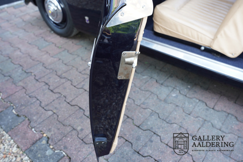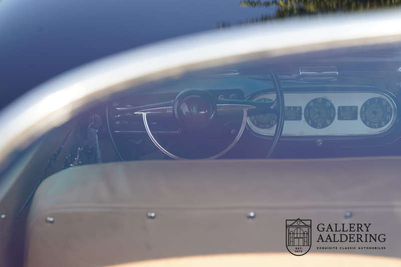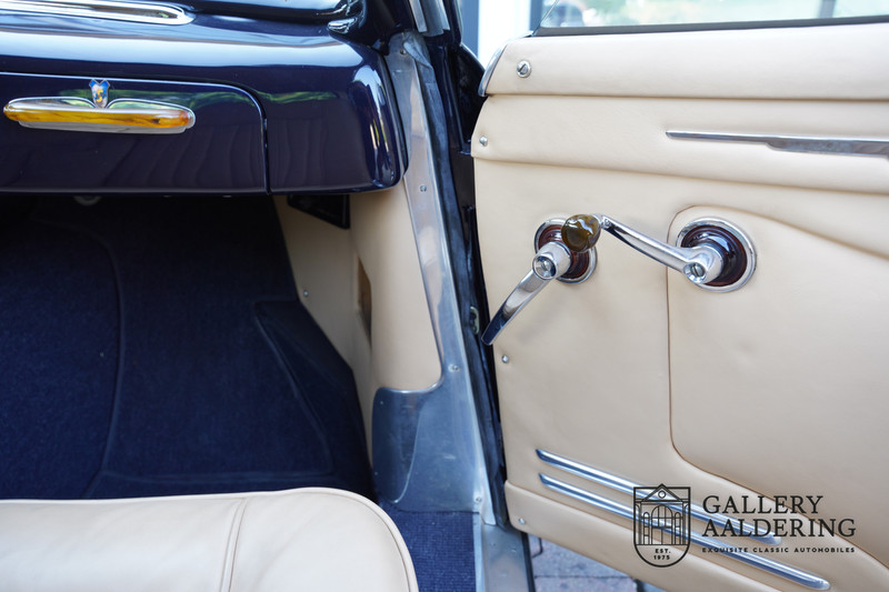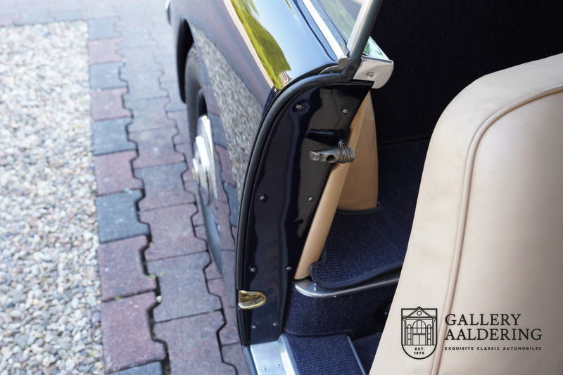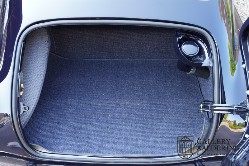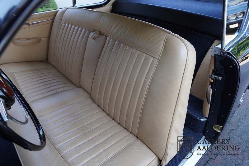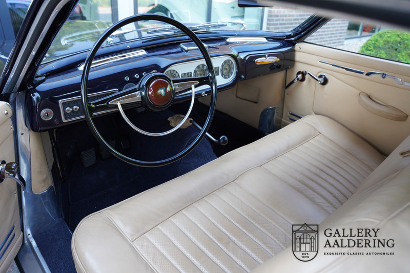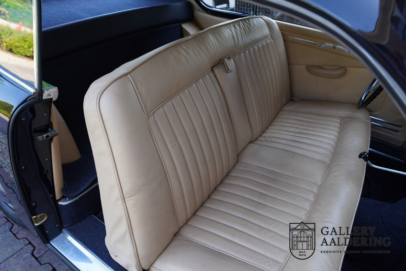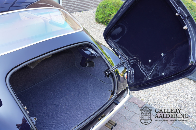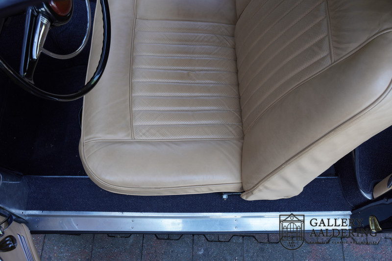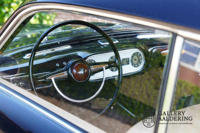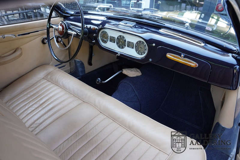 Die Karosserie wurde vollständig in den Concours-Zustand restauriert und bringt das Auto vollständig zur Geltung. Die Karosserie ist unglaublich schlank und schön und die Lackierung wurde eindeutig von echten Profis durchgeführt. Die gesamten Chromarbeiten sind wunderschön, ebenso wie die Stahlräder, die in Wagenfarbe lackiert sind und schöne, dezente Radkappen haben. Das Innere passt zum Äußeren. Wunderschön restauriert und renoviert und in hervorragendem Zustand. Das beige Leder harmoniert wunderbar mit der dunkelblauen Lackierung.