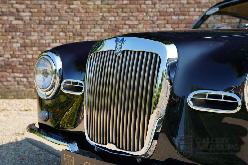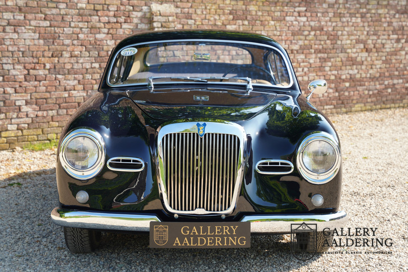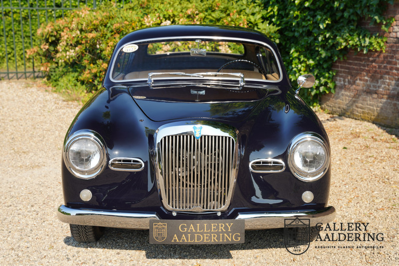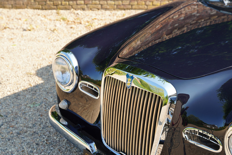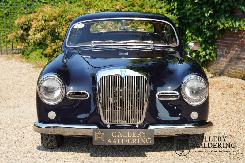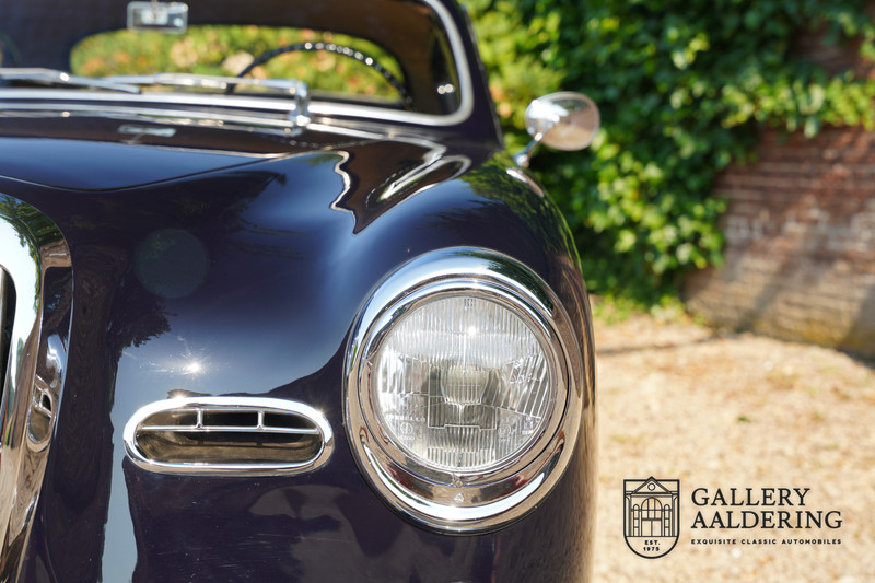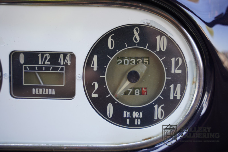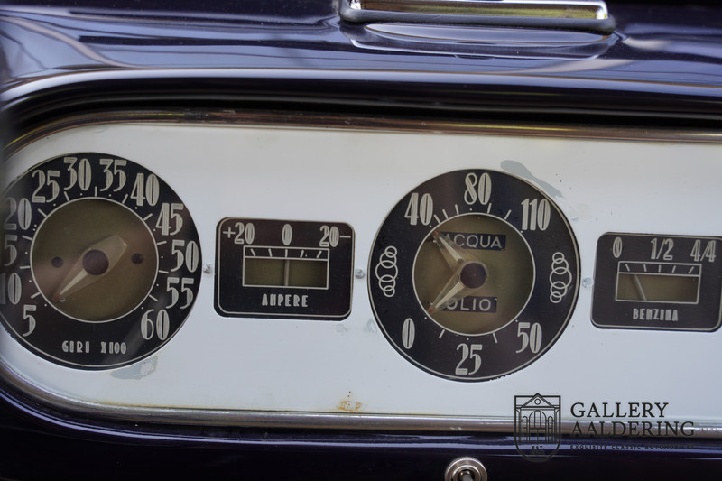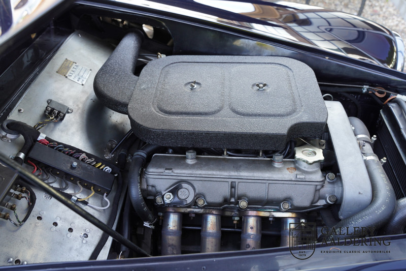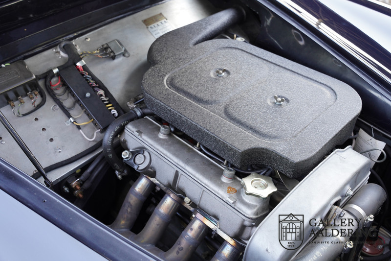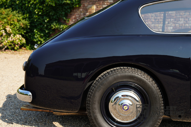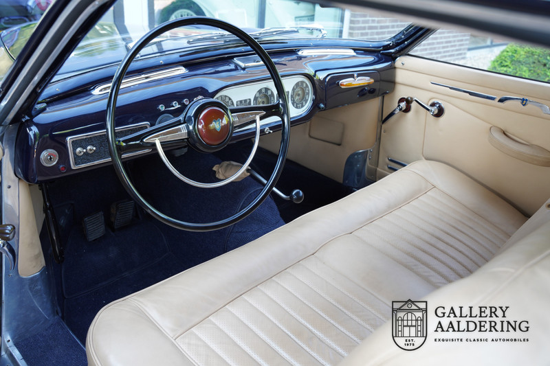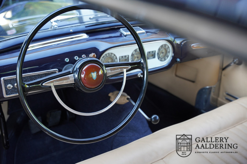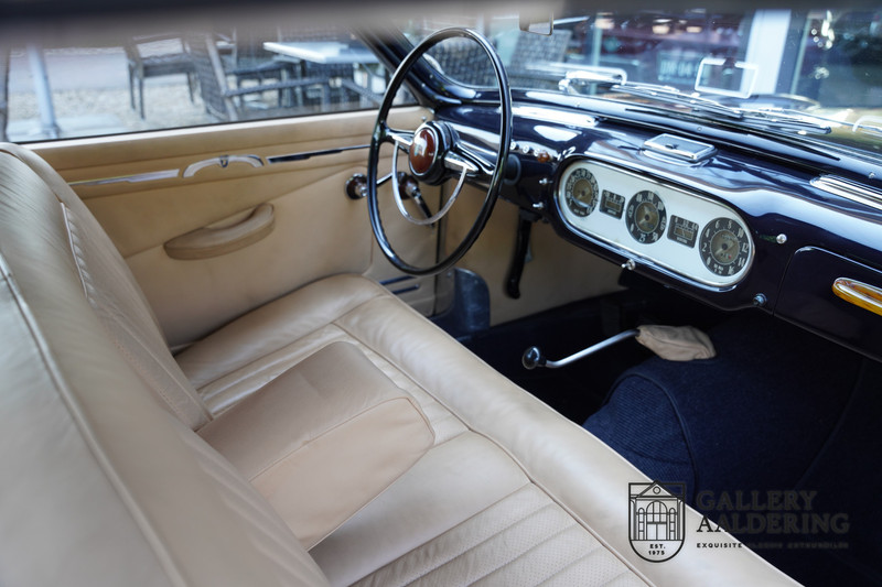 Eén van die 20 auto’s is dus de Daina die u hier te koop aangeboden ziet. Het koetswerk komt van Stabilimenti Farina. De coupé, met onafhankelijke voorwielophanging en een starre achteras lijkt op de foto’s misschien zwart, in werkelijkheid is de auto zeer donkerblauw. Bijzonder stijlvol!