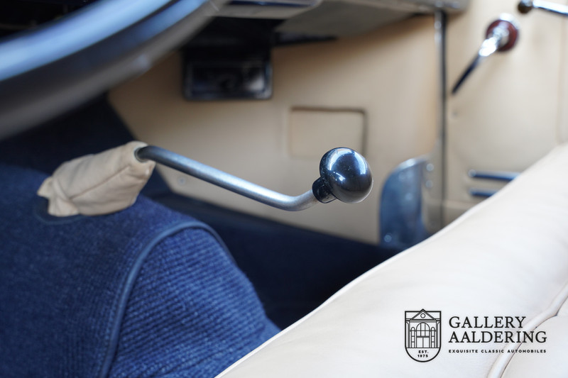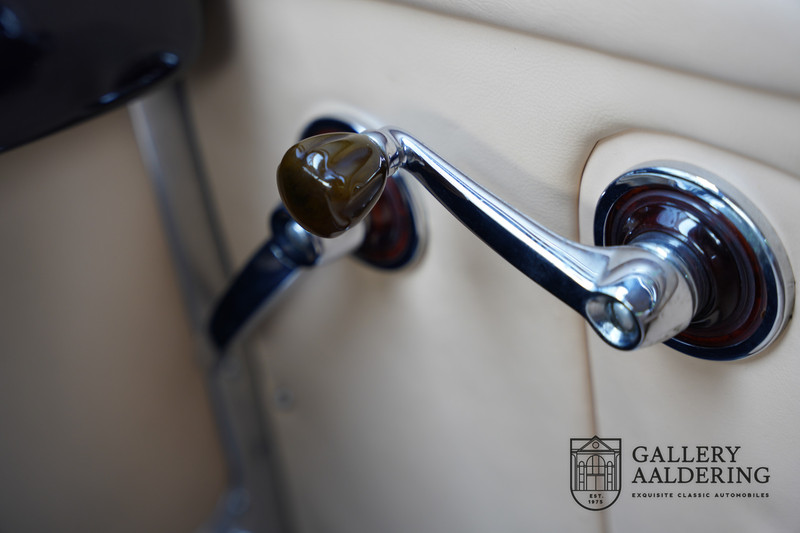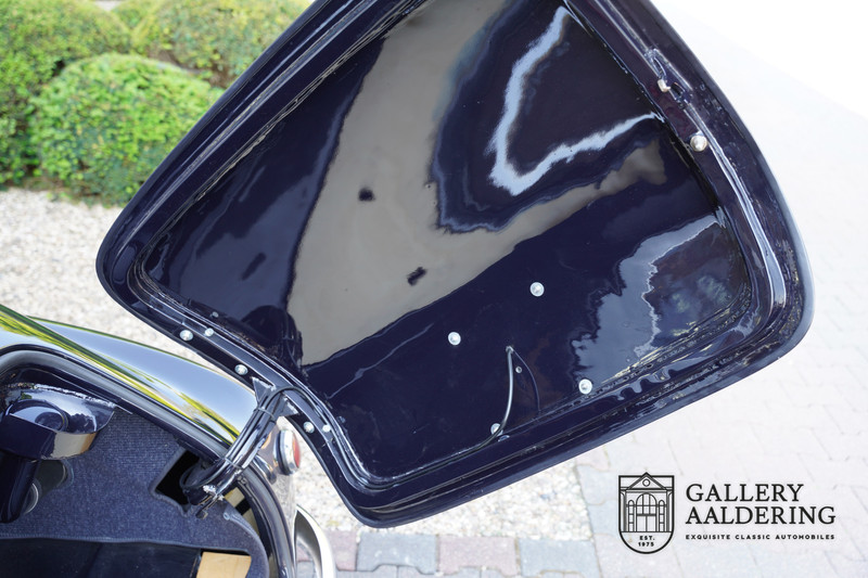 De carrosserie is volledig gerestaureerd tot concoursstaat en dat straat volledig van de auto af. De carrosserie is waanzinnig strak en mooi en het lakwerk is duidelijk door échte professionals gedaan. Al het chroomwerk is prachtig, evenals de stalen wielen die in carrosseriekleur zijn uitgevoerd en mooie, subtiele wieldeksels hebben. Het interieur is bijpassend bij de buitenzijde. Prachtig gerestaureerd en gerenoveerd en in een schitterende conditie. Het beige leder kleurt prachtig bij de donkere marineblauwe lak.