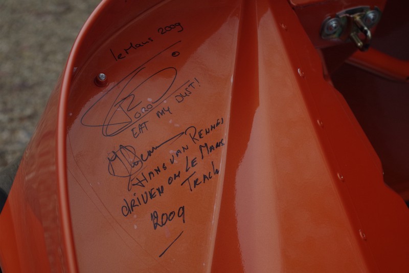 Dat deze auto dus perfect is gedocumenteerd en is voorzien van alle zaken die het bezit van een Spyker tot een unieke beleving moesten maken, mag dus een understatement heten. Het zijn niet alleen de polo’s petten en overhemden die zijn gesigneerd tijdens de Driver Parade van Le Mans in 2009 maar ook de auto zelf. Maarten de Bruijn en Tom Coronel hebben beide de auto gesigneerd aan de binnenzijde van de neus.