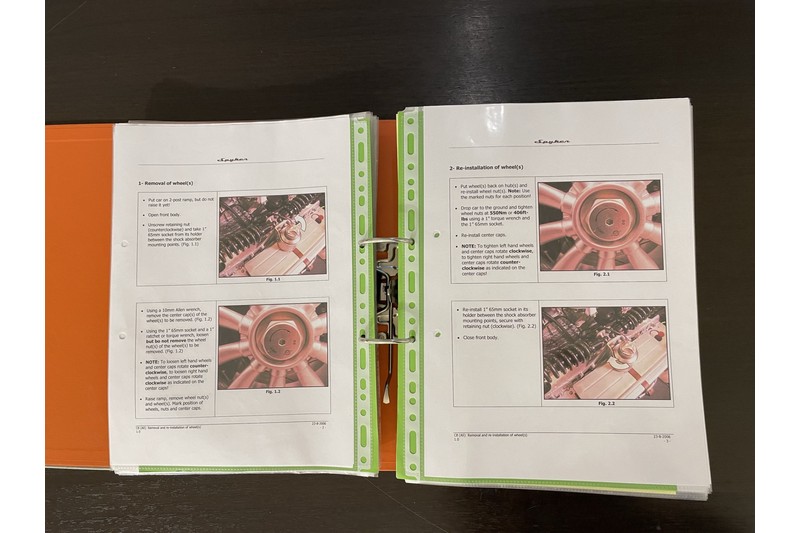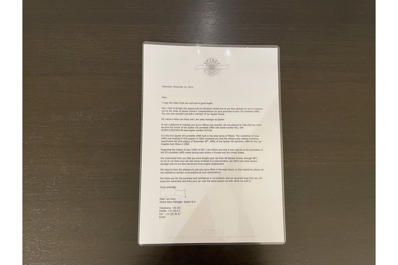 Das Auto wurde einem engen Freund und Geschäftspartner von Victor Muller übergeben: Vladimir Antonov. Das Auto ist sehr gut dokumentiert, die Dokumentation enthält u.a. eine E-Mail von Antonov an einen späteren Besitzer, in der er ihm zum Kauf dieses fantastischen Autos gratuliert. Die Dokumentation des Autos ist eigentlich der beste Ausgangspunkt, denn dieses Exemplar ist wirklich selten und vollständig dokumentiert. So ist die Alu-Bordmappe mit der Bedienungsanleitung selbstverständlich vorhanden und dem Wartungsheft sowie einer Reihe von Visitenkarten von Personen, die Sie nicht mehr erreichen können. Das Handbuch ist auch vom Designer des Autos signiert: Maarten de Bruijn. Darüber hinaus sind Unterlagen vorhanden, die die Originalität des Autos bestätigen. Es gibt auch ein voller Ordner mit einem Mechaniker-Handbuch und zum Schluss gibt es noch verschiedene Fotoserien des Autos. Schließlich gibt es Fotos des Autos, die während der Paraderunde in Le Mans vor dem Rennen 2009 aufgenommen wurden. Dieser Text wäre viel zu lang, um die vollständige Dokumentation und die damit verbundenen Randthemen zu beschreiben, daher hier eine Liste der Sachen, die mit dem Auto geliefert werden: