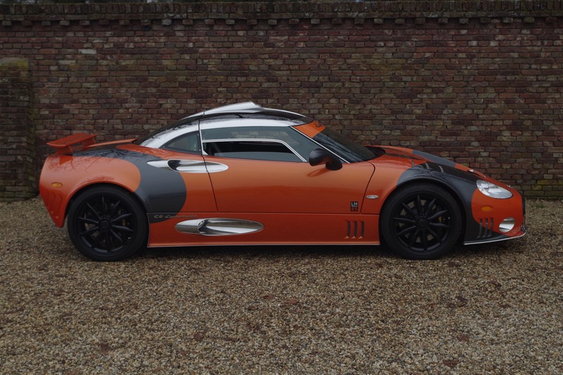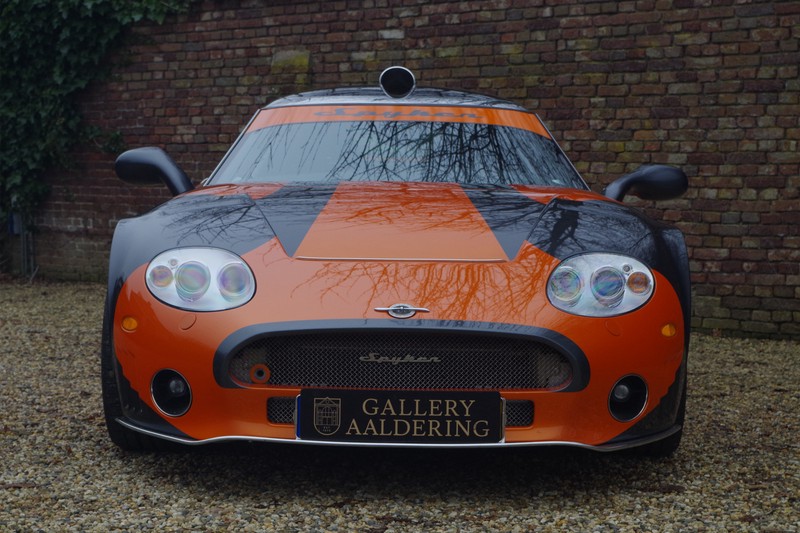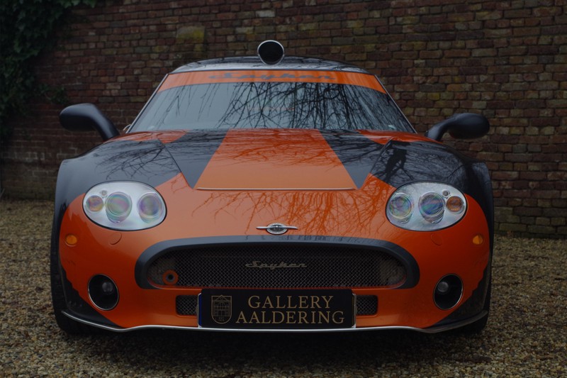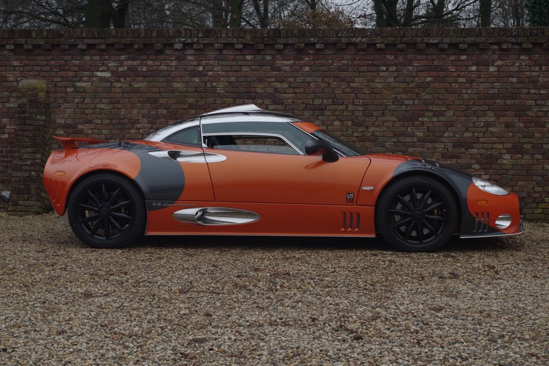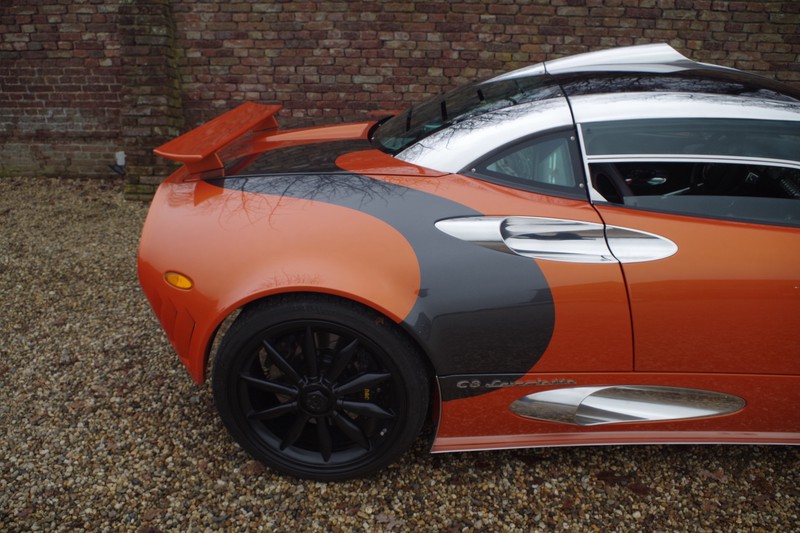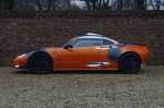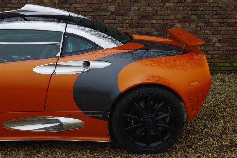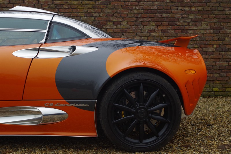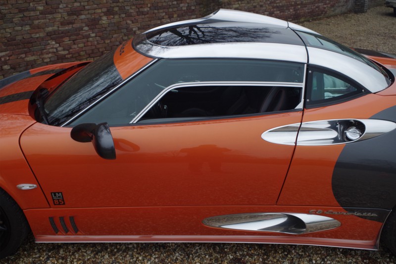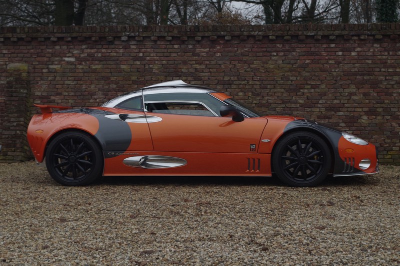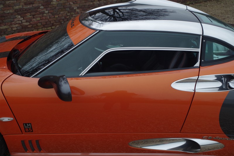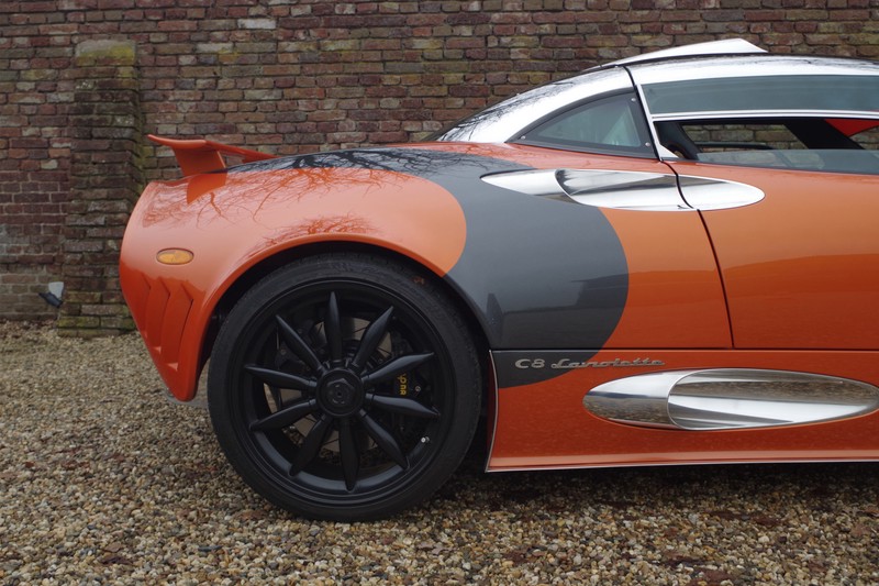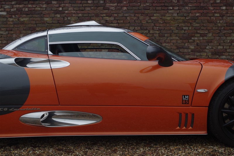 Vanzelfsprekend is deze Spyker C8 Laviolette LM85 volledig schadevrij. Sinds 2009 is er slechts 7.651 kilometer met de auto gereden. De conditie van de auto liegt er dan ook niet om. Die laat zich niet anders omschrijven dan onberispelijk. De auto is vanzelfsprekend 100 procent origineel en staat tevens volledig in de eerste lak. Bij het openen van één van de naar boven scharnierende portieren is direct duidelijk dat de Spyker destijds naar een zeer hoge kwaliteitsstandaard werd gebouwd. De deuren gaan zeer precies naar boven en vrijwel zonder moeite. Ook de neus van de auto laat zich eenvoudig naar voren klappen en geeft dan een prachtige aluminium voorwielophanging weer die tevens onderdak biedt aan verschillende aanbouwdelen uit de stal van Audi. De Spyker LM85 staat op prachtige 19 inch “Aeroblade” wielen met een centerlock. De wielen worden prachtig gevuld door een paar uiterst krachtige AP Remmen met 6 zuigers aan de voorzijde en 4 zuigers voor de achterwielen. De ophanging bestaat uit volledig instelbare Koni dempers die rondom zijn bevestigd aan dubbele wishbones. De lak heeft de prachtige naam “Burned Almond Orange” en is in dit geval voorzien van diverse Gunmetal accenten. Daarnaast is de auto voorzien van een intake op het dak die is gemaakt van gepolijst aluminium. Het gepolijste aluminium komt vaker terug op de carrosserie en vormt een prachtig contrast met de oranje lak. De uitlaat is voorzien van aangepaste eindstukken ten opzichte van “gewone” Spykers. Tot slot is de LM85 te herkennen aan een kleine achterspoiler, oranje raamband, grote diffuser en een splitter aan de voorzijde.