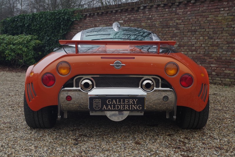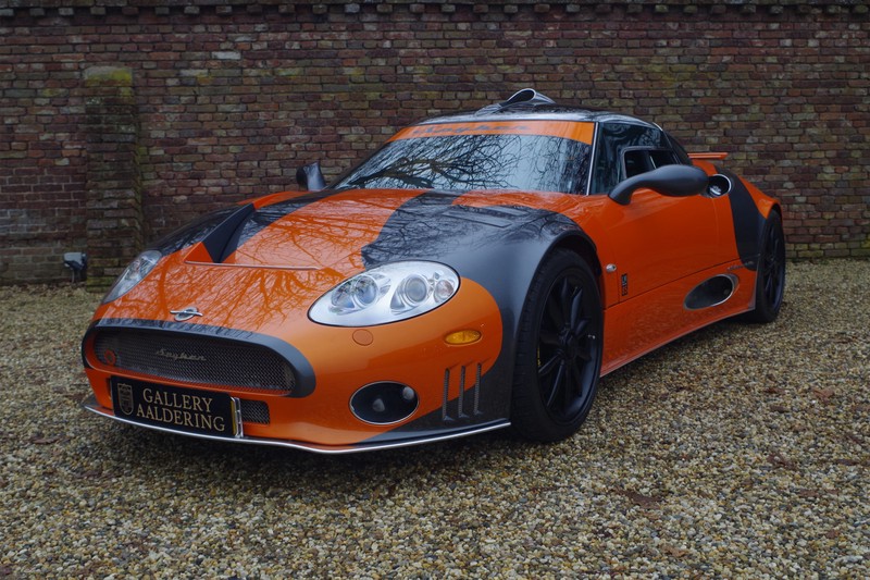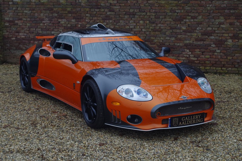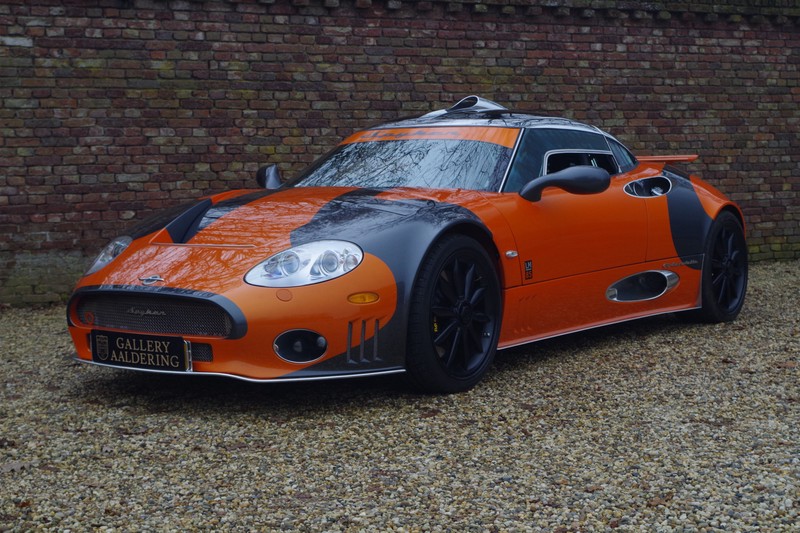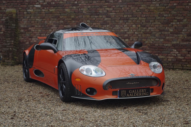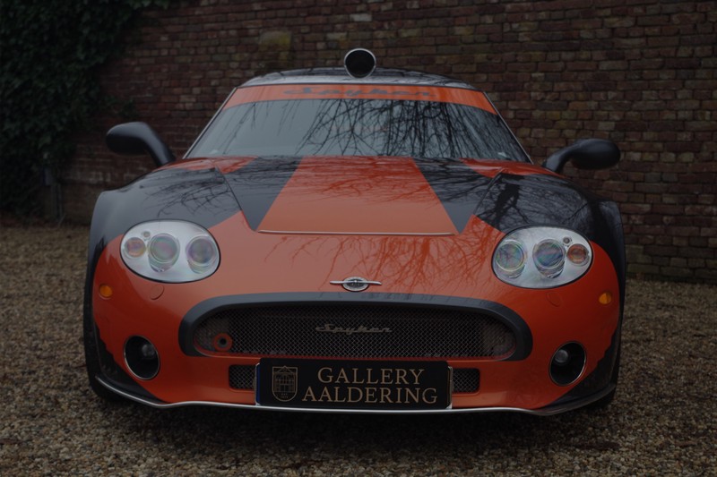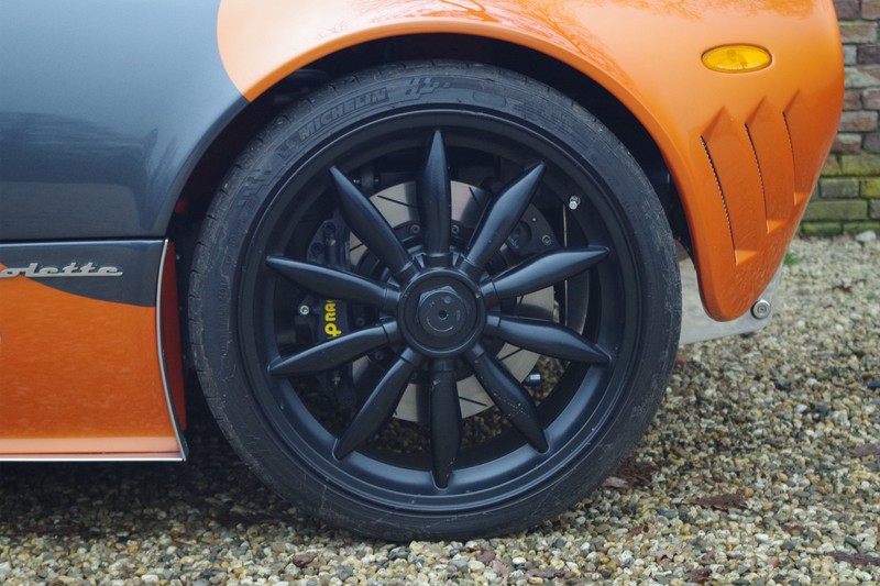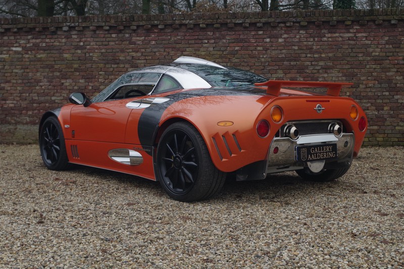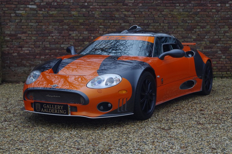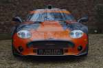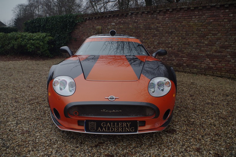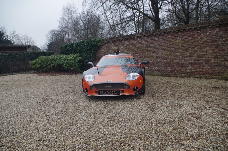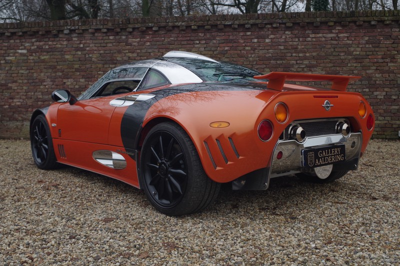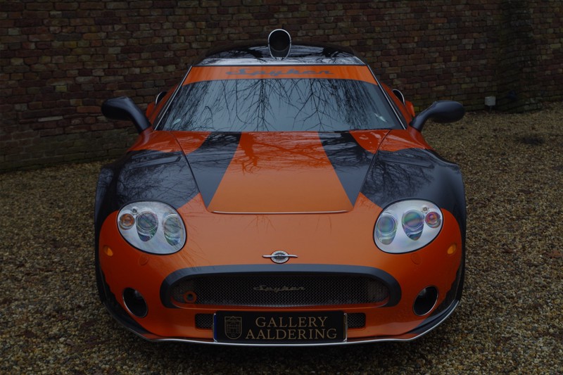 Vanzelfsprekend is deze Spyker C8 Laviolette LM85 volledig schadevrij. Sinds 2009 is er slechts 7.651 kilometer met de auto gereden. De conditie van de auto liegt er dan ook niet om. Die laat zich niet anders omschrijven dan onberispelijk. De auto is vanzelfsprekend 100 procent origineel en staat tevens volledig in de eerste lak. Bij het openen van één van de naar boven scharnierende portieren is direct duidelijk dat de Spyker destijds naar een zeer hoge kwaliteitsstandaard werd gebouwd. De deuren gaan zeer precies naar boven en vrijwel zonder moeite. Ook de neus van de auto laat zich eenvoudig naar voren klappen en geeft dan een prachtige aluminium voorwielophanging weer die tevens onderdak biedt aan verschillende aanbouwdelen uit de stal van Audi. De Spyker LM85 staat op prachtige 19 inch “Aeroblade” wielen met een centerlock. De wielen worden prachtig gevuld door een paar uiterst krachtige AP Remmen met 6 zuigers aan de voorzijde en 4 zuigers voor de achterwielen. De ophanging bestaat uit volledig instelbare Koni dempers die rondom zijn bevestigd aan dubbele wishbones. De lak heeft de prachtige naam “Burned Almond Orange” en is in dit geval voorzien van diverse Gunmetal accenten. Daarnaast is de auto voorzien van een intake op het dak die is gemaakt van gepolijst aluminium. Het gepolijste aluminium komt vaker terug op de carrosserie en vormt een prachtig contrast met de oranje lak. De uitlaat is voorzien van aangepaste eindstukken ten opzichte van “gewone” Spykers. Tot slot is de LM85 te herkennen aan een kleine achterspoiler, oranje raamband, grote diffuser en een splitter aan de voorzijde.