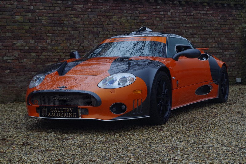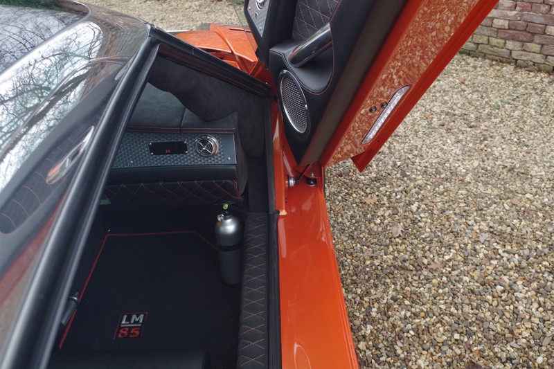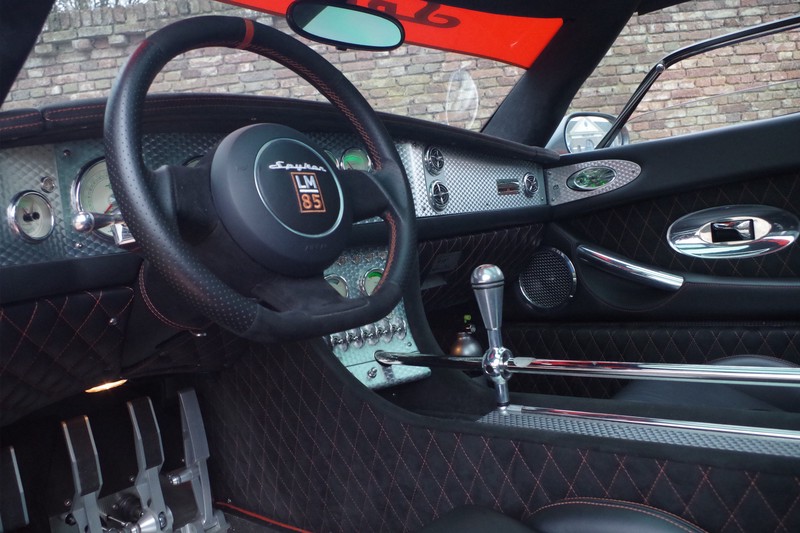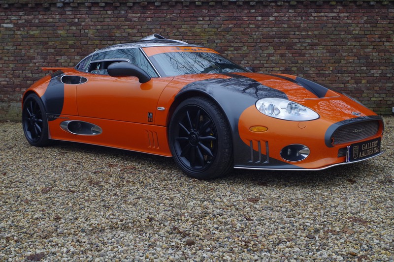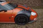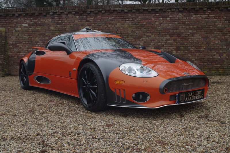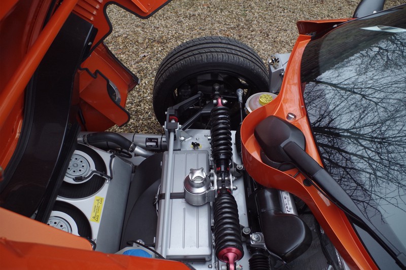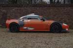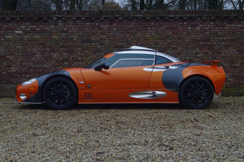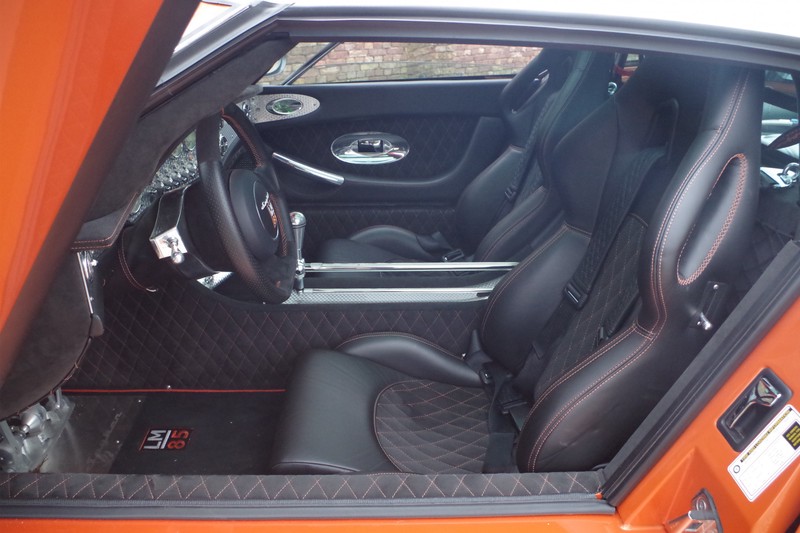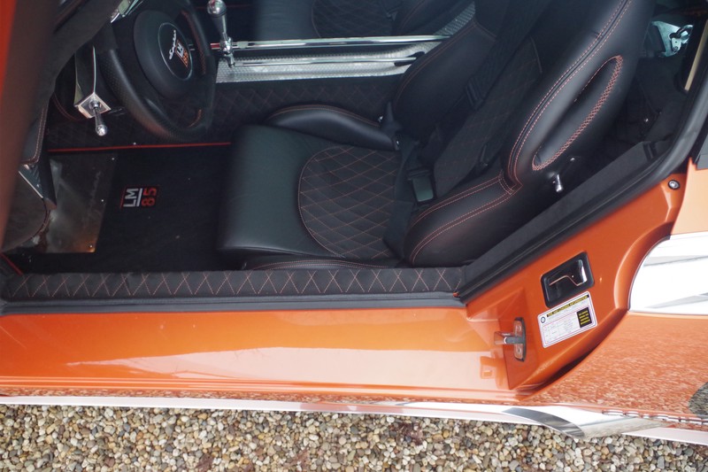 Naturally this Spyker C8 Laviolette LM85 is totally undamaged. Since 2009 the car has only travelled 7,651 kilometres. The car’s condition reflects the low usage, it is nothing less than immaculate. As expected the car has remained totally in an original state, including its paintwork. When opening one of its scissor doors it becomes apparent the Spyker was built to an exacting standard. The doors scissor up precisely with minimal effort. The hood easily pivots forward to reveal a lovely aluminium front suspension housing many add-ons from the Audi stable. The Spyker LM 85 stands proudly on its 19-inch “Aeroblade” wheels with centre-lock. The wheels are beautifully filled in by a pair of extremely powerful AP brakes with 6 front pistons and 4 rear wheel ones. The suspension has fully adjustable Koni’s attached to the double wishbones. The finish sports the wonderful name “Burned Almond Orange” accentuated with Gunmetal elements. The car also has a roof air inlet made of polished aluminium. The polished aluminium is a recurring theme contrasting the orange paintwork. The exhaust is embellished with adapted ends distinguishing it from the “normal” Spykers. The LM 85 is further recognisable by its small rear spoiler, orange window surround, large diffuser and a frontend splitter.