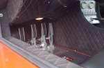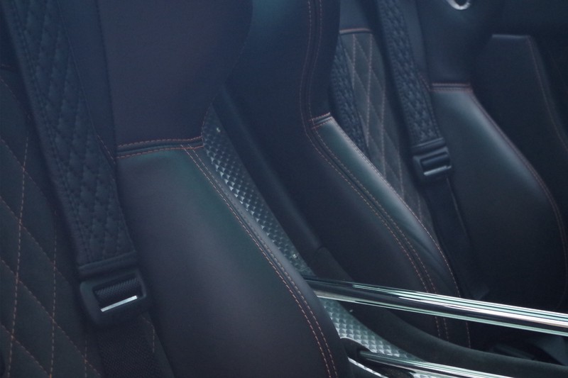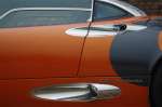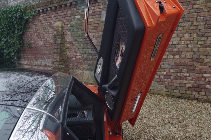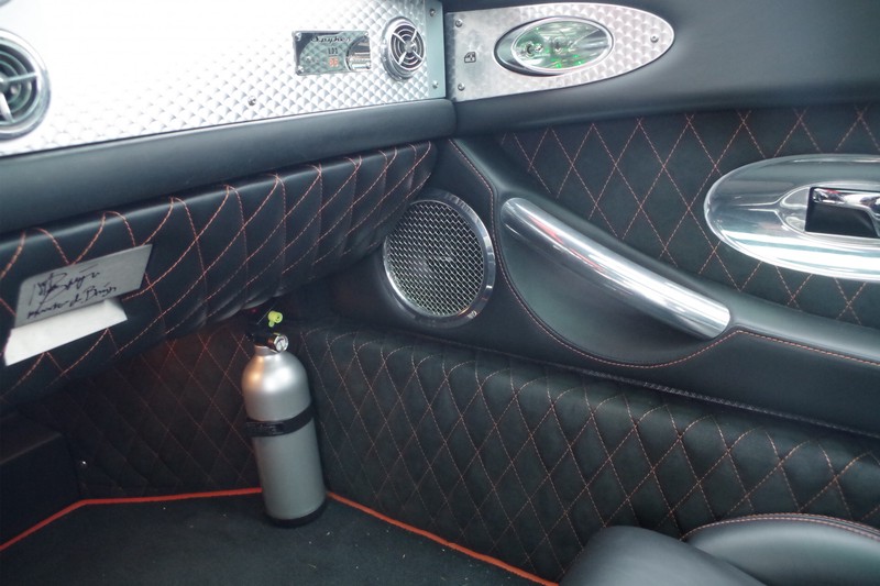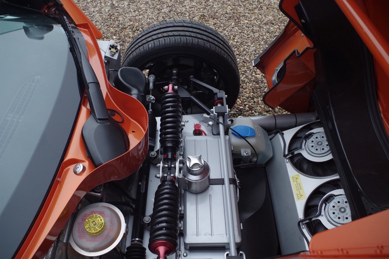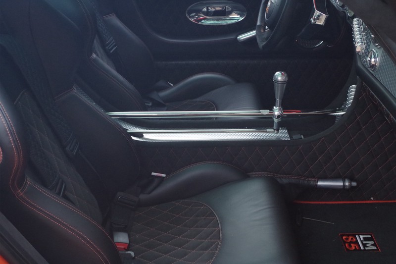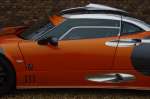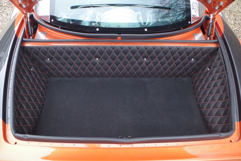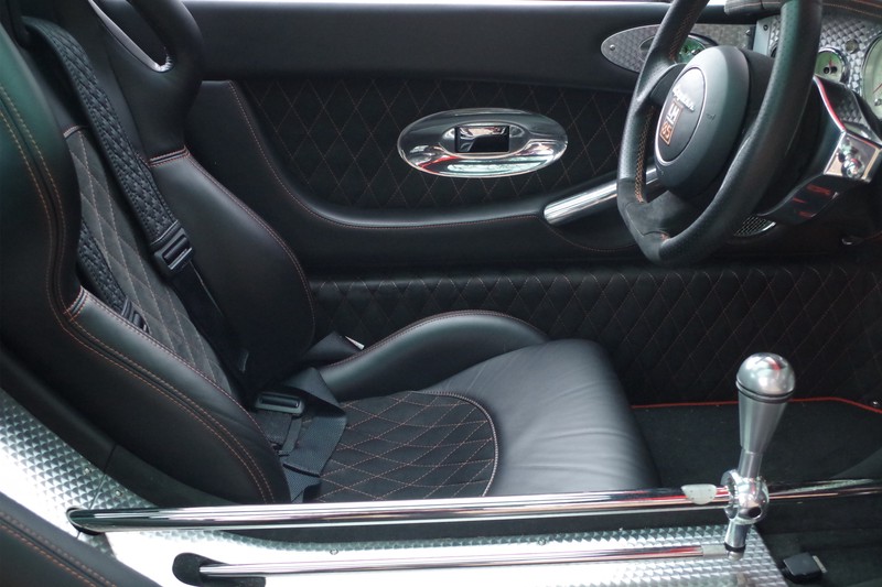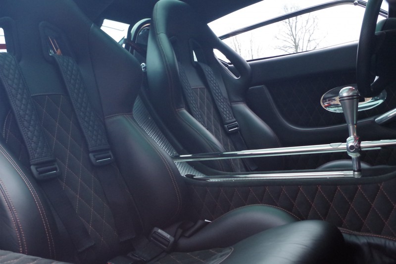 Naturally this Spyker C8 Laviolette LM85 is totally undamaged. Since 2009 the car has only travelled 7,651 kilometres. The car’s condition reflects the low usage, it is nothing less than immaculate. As expected the car has remained totally in an original state, including its paintwork. When opening one of its scissor doors it becomes apparent the Spyker was built to an exacting standard. The doors scissor up precisely with minimal effort. The hood easily pivots forward to reveal a lovely aluminium front suspension housing many add-ons from the Audi stable. The Spyker LM 85 stands proudly on its 19-inch “Aeroblade” wheels with centre-lock. The wheels are beautifully filled in by a pair of extremely powerful AP brakes with 6 front pistons and 4 rear wheel ones. The suspension has fully adjustable Koni’s attached to the double wishbones. The finish sports the wonderful name “Burned Almond Orange” accentuated with Gunmetal elements. The car also has a roof air inlet made of polished aluminium. The polished aluminium is a recurring theme contrasting the orange paintwork. The exhaust is embellished with adapted ends distinguishing it from the “normal” Spykers. The LM 85 is further recognisable by its small rear spoiler, orange window surround, large diffuser and a frontend splitter.