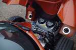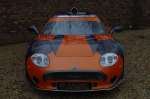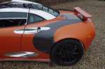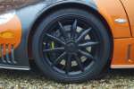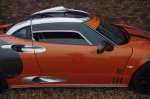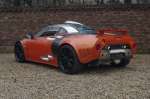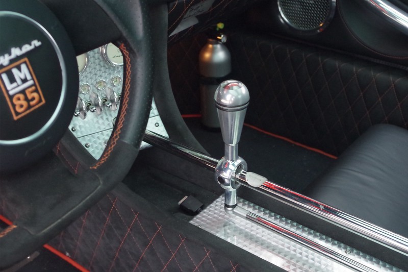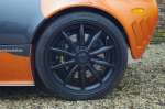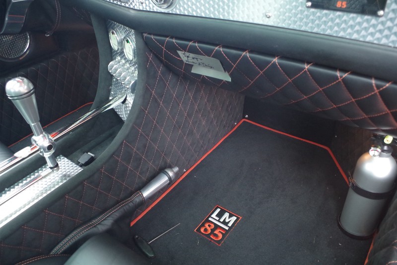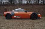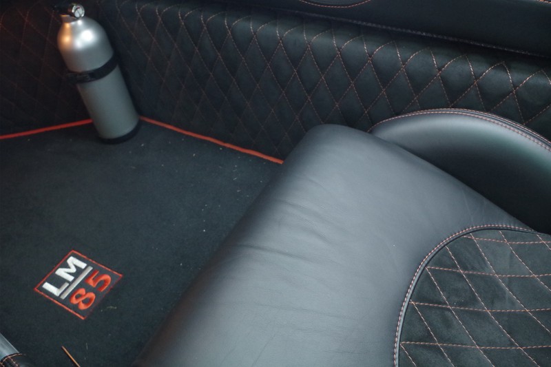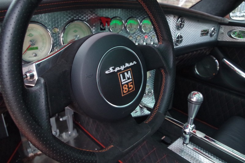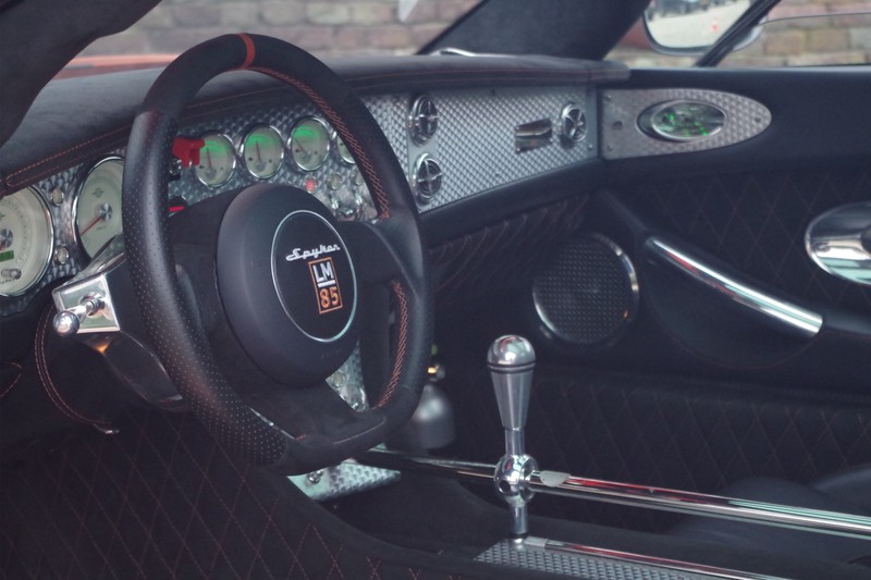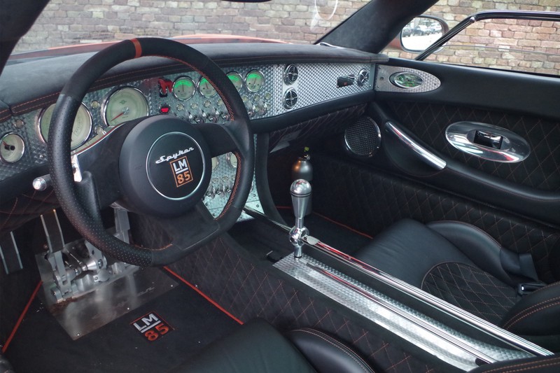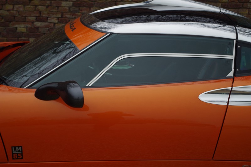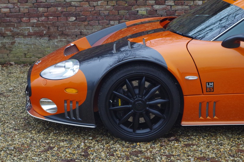 Die Radaufhängung besteht aus voll einstellbaren Koni-Dämpfern, die rundum an Doppelquerlenkern befestigt sind. Die Lackierung trägt den schönen Namen „Burned Almond Orange“ und ist in diesem Fall mit diversen Gunmetal-Akzenten versehen. Darüber hinaus ist das Auto mit einem Lufteinlass auf dem Dach ausgestattet, der aus poliertem Aluminium besteht. Das polierte Aluminium ist an der Karosserie häufiger anzutreffen und bildet einen schönen Kontrast zur orangen Lackierung. Der Auspuff ist mit modifizierten Endstücken gegenüber “normalen” Spykers ausgestattet. Schließlich erkennt man den LM85 an einem kleinen Heckspoiler, orangefarbenem Fensterband, großem Diffusor und einem Splitter vorn.