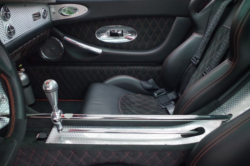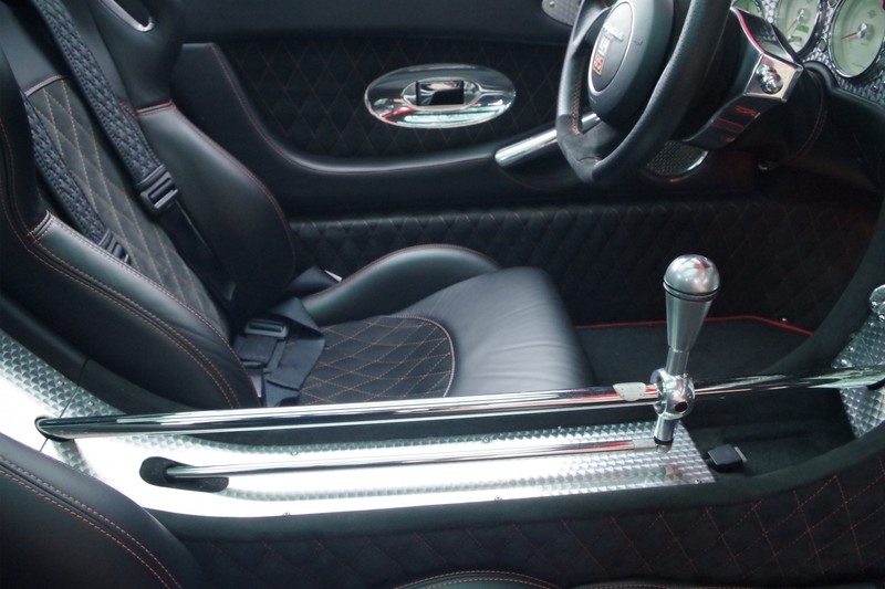 Auch das Interieur ist ein Kunstwerk und befindet sich natürlich in einem fast neuwertigen Zustand. Das Lenkrad ist mit einem Airbag ausgestattet und stammt von Lamborghini, da Spyker aufgrund von Typgenehmigungen das schöne Airbag-lose Lenkrad mit den charakteristischen vier Speichen nicht mehr montieren durfte. Die Instrumente haben alle einen schönen Spyker-Schriftzug und informieren Sie während der Fahrt über die lebenswichtigen Funktionen des Autos, die Instrumente sind schön grün beleuchtet. Die Sitze sind richtig bequem und sind mit schwarzem Leder an den Seiten und grauem Alcantara in der Mitte mit Diamant-Kedern bezogen. Das Armaturenbrett ist mit gebürstetem Aluminium ausgestattet. Am auffälligsten ist der sichtbare Schaltmechanismus. Als neuer Autohersteller war Spyker dank der Verwendung dieser wunderschön gestalteten Getriebesteuerung sofort so berühmt wie Ferrari. Es sieht nicht nur gut aus, sondern es funktioniert auch einwandfrei. Bei einem reinen Sportwagen nicht unwichtig.