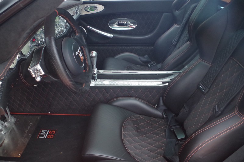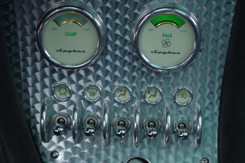 Het interieur is eveneens een kunstwerk en verkeert uiteraard vrijwel in nieuwstaat. Het stuurwiel is voorzien van een airbag en is afkomstig van Lamborghini omdat het voor Spyker in verband met typegoedkeuringen niet langer was toegestaan het schitterende airbag-loze stuurwiel met de kenmerken vier spaken te monteren. De instrumenten zijn allen voorzien van prachtig Spyker opschrift en houden u op de hoogte van de vitale functies van de auto tijdens uw reis. De instrumenten zijn tevens prachtig groen verlicht. De stoelen zitten werkelijk heerlijk en zijn bekleed met zwart leder aan de zijkanten en grijs alcantara in het midden met diamantstiksels. Het dashboard is verder voorzien van geborsteld aluminium. Het meest in het oog springende is nog wel het opengewerkte schakelmechanisme. Spyker was als nieuwe autofabrikant in één klap net zo bekend als Ferrari dankzij het gebruik van dit schitterend ontworpen stuk bakbediening. Het ziet er niet alleen goed uit maar werkt ook feilloos. Niet onbelangrijk in een pure sportauto.