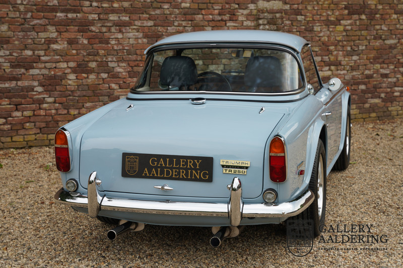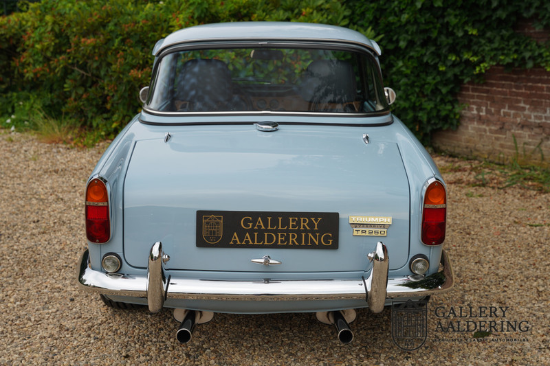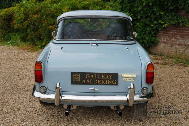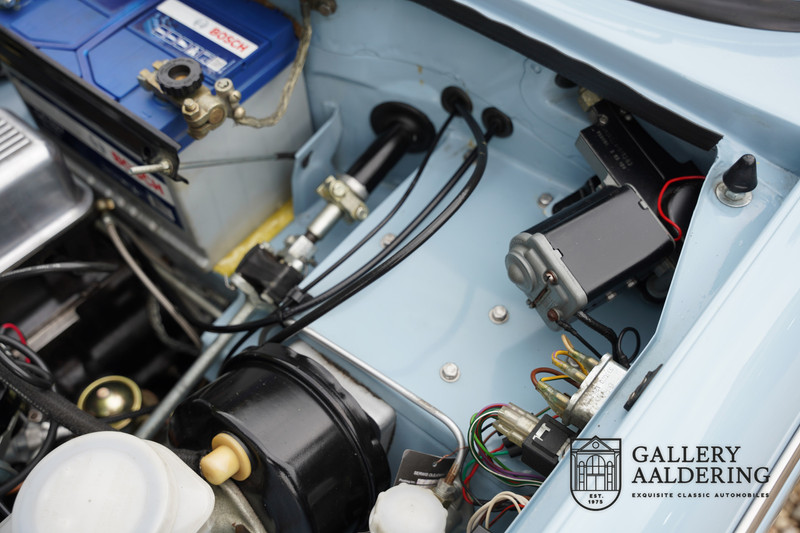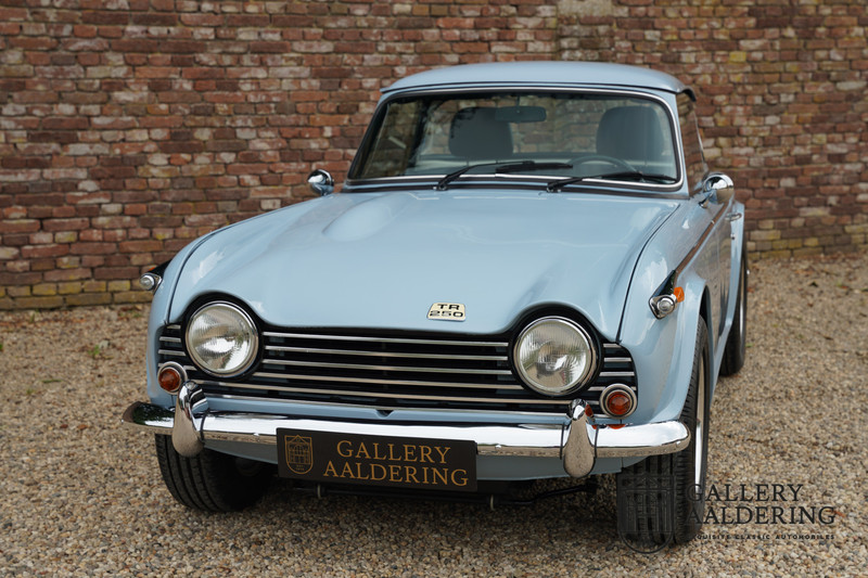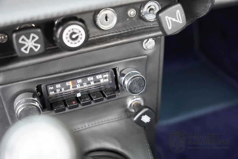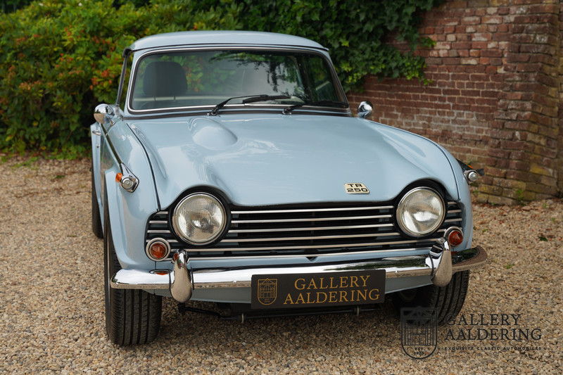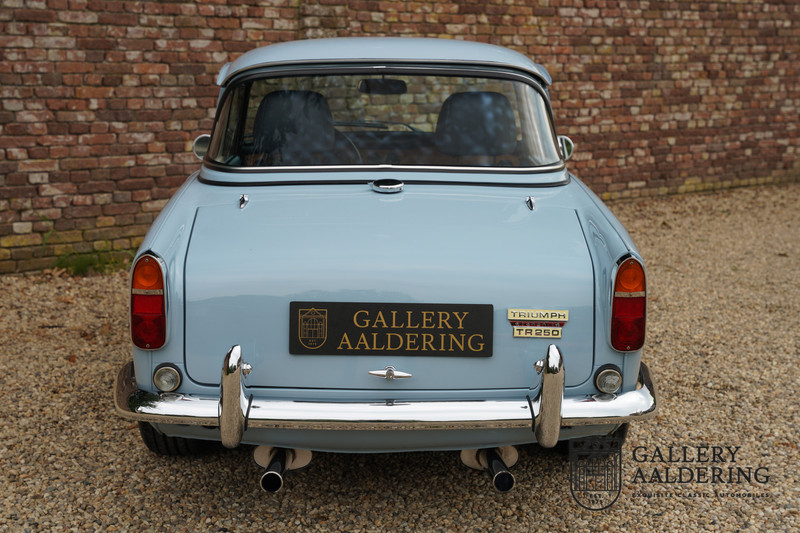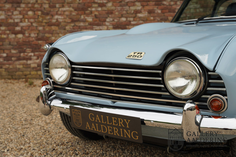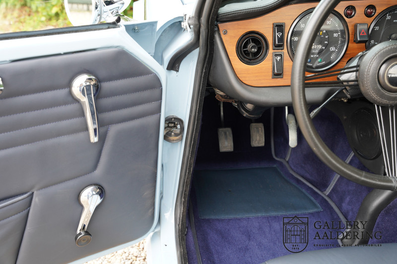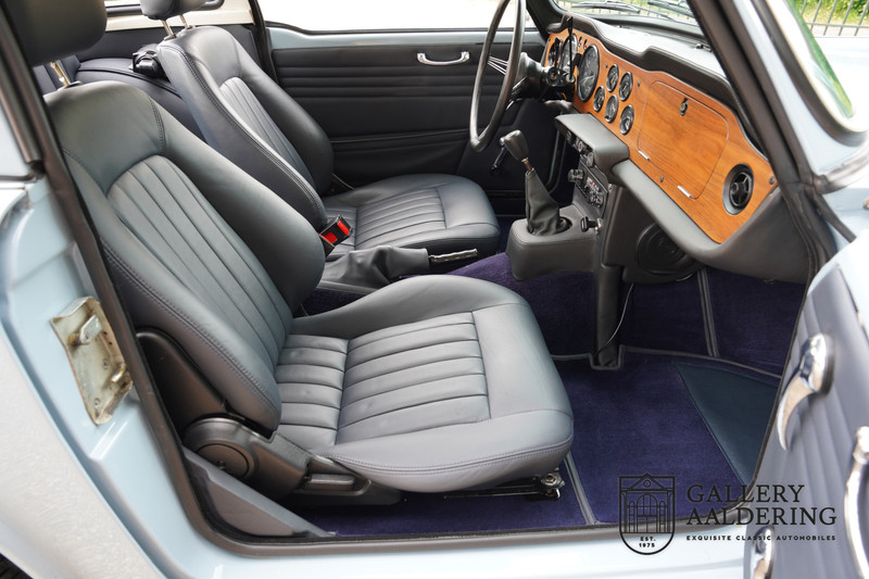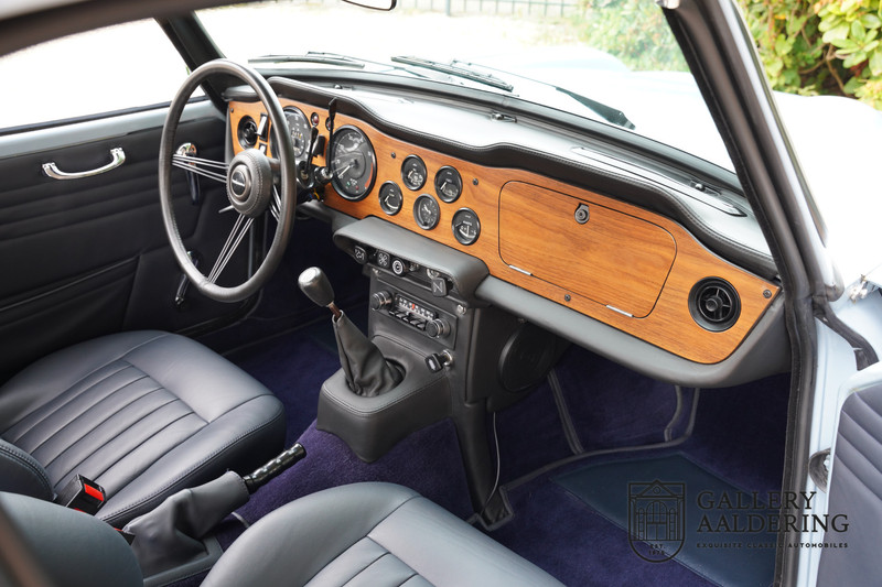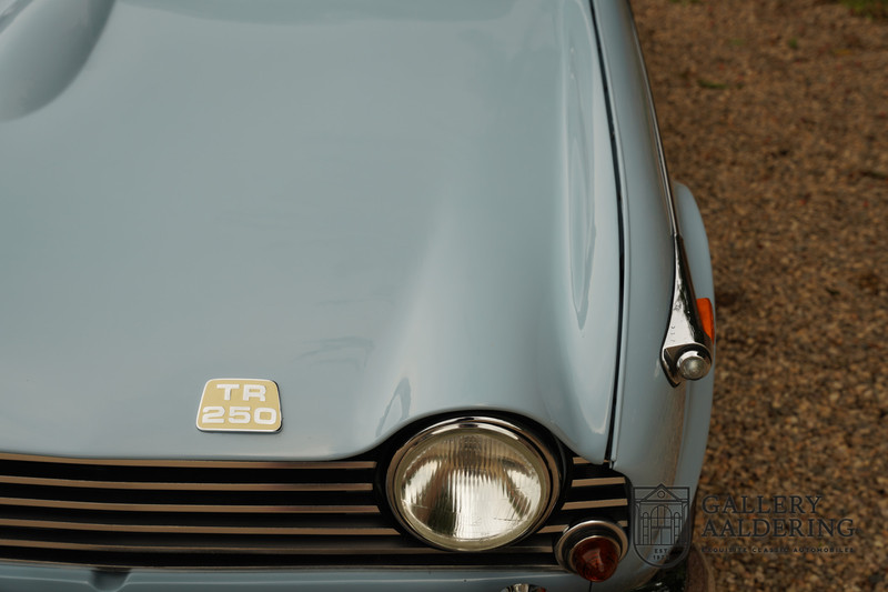 After the restoration, the car was provided with a beautiful coat of paint in the colour Wedgwood Blue, or Gulf Blue as it is also called. Together with the dark blue, almost black leather interior, it is a combination that looks really fantastic. The interior is of course in Concours condition, both in terms of condition and quality. The most beautiful materials were chosen during the restoration and the future buyer will reap the benefits. The seats are extra comfortable and the rare seats in the back are present. The original radio of the TR250 has been completely modified by a specialist, so that the appearance is original but the functionality of this time, with even hands-free possibilities.