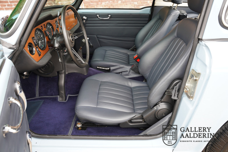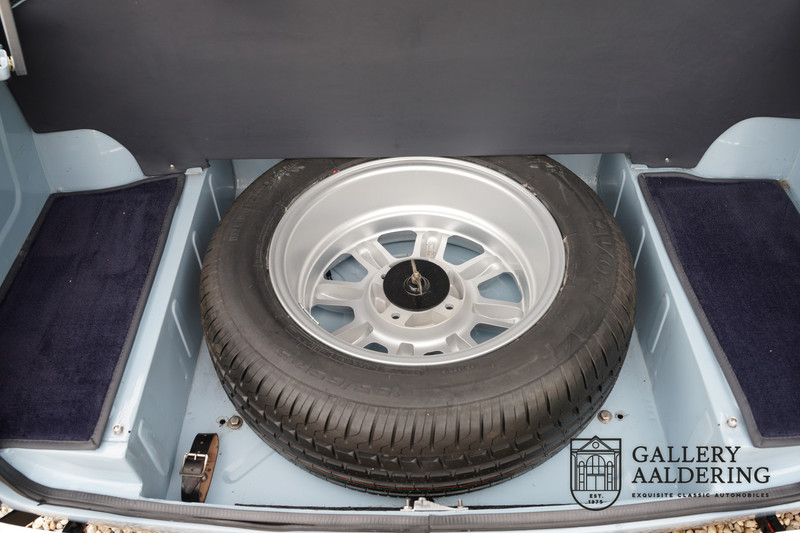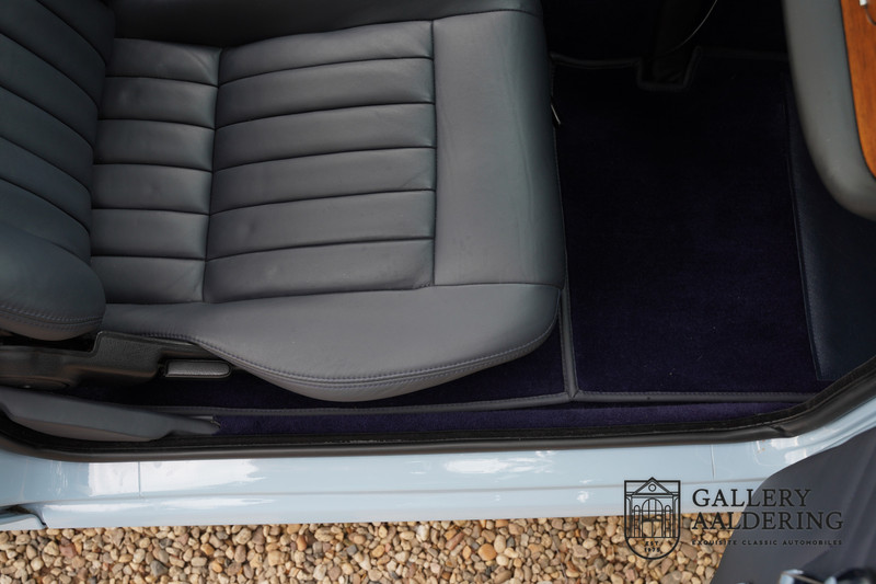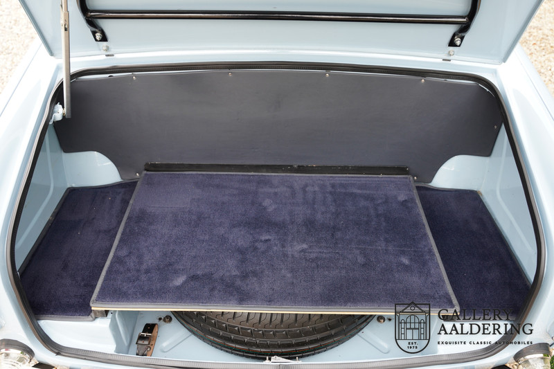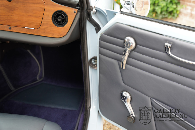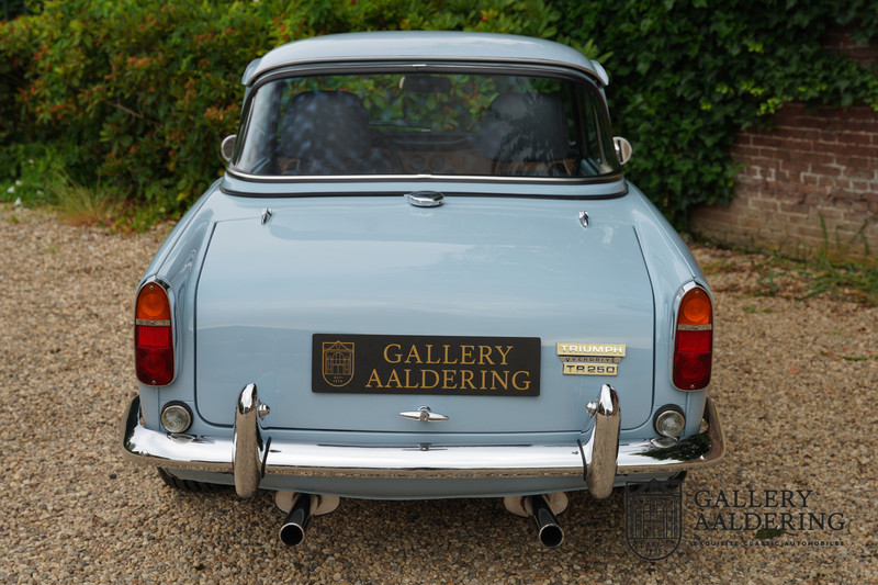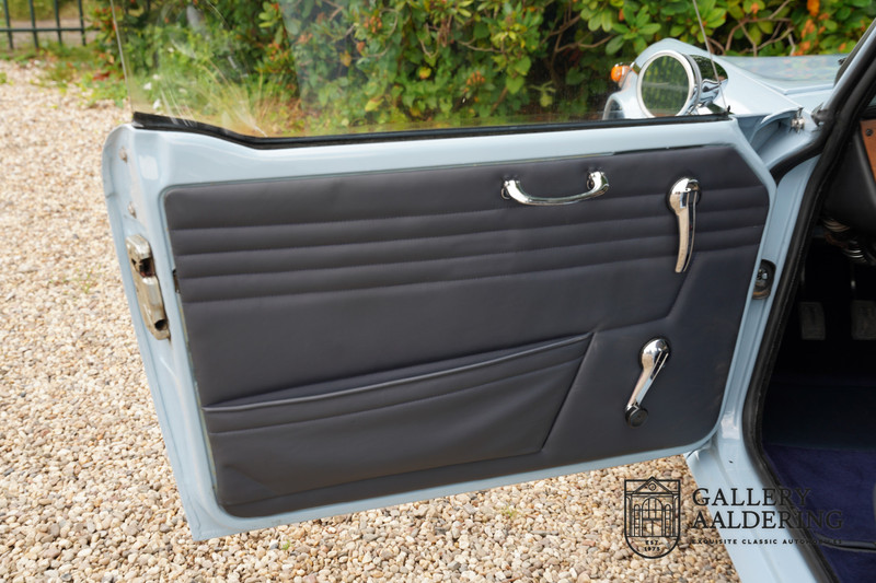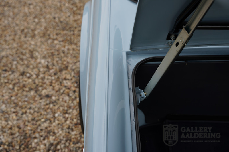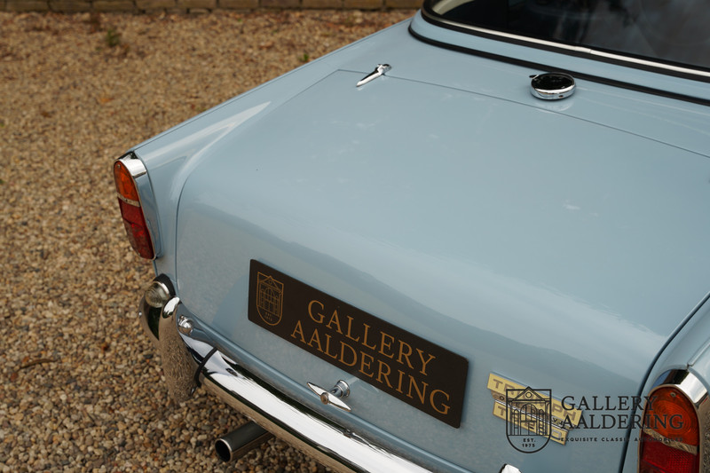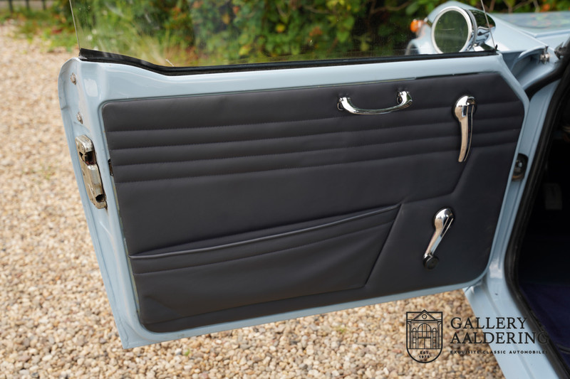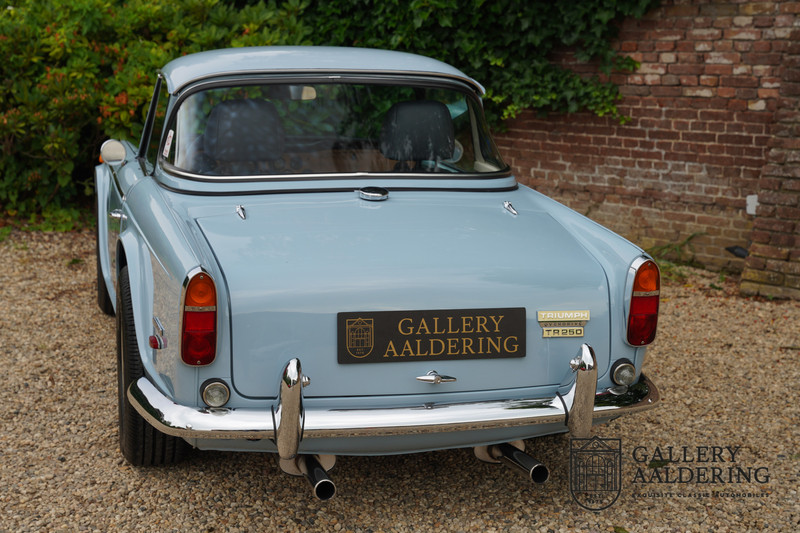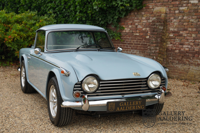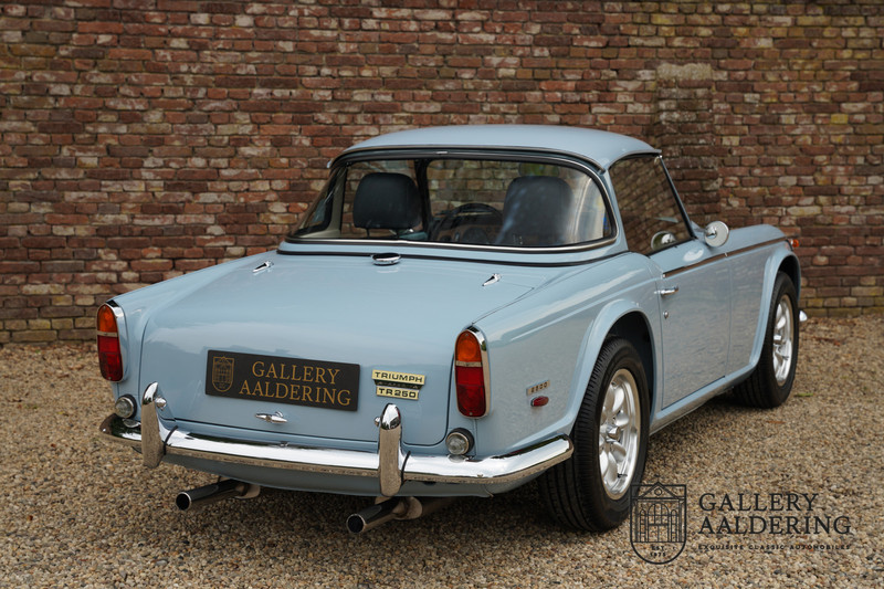 After the restoration, the car was provided with a beautiful coat of paint in the colour Wedgwood Blue, or Gulf Blue as it is also called. Together with the dark blue, almost black leather interior, it is a combination that looks really fantastic. The interior is of course in Concours condition, both in terms of condition and quality. The most beautiful materials were chosen during the restoration and the future buyer will reap the benefits. The seats are extra comfortable and the rare seats in the back are present. The original radio of the TR250 has been completely modified by a specialist, so that the appearance is original but the functionality of this time, with even hands-free possibilities.