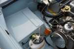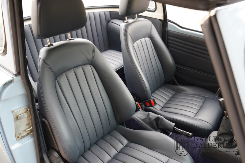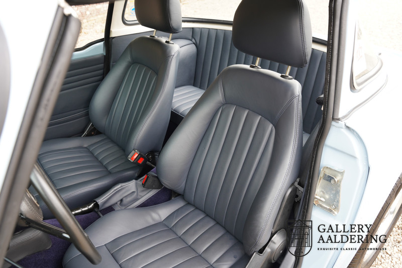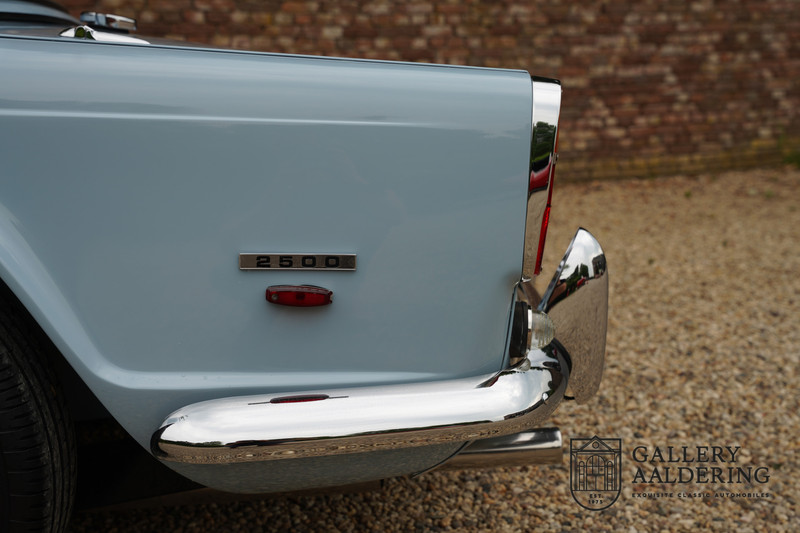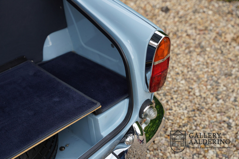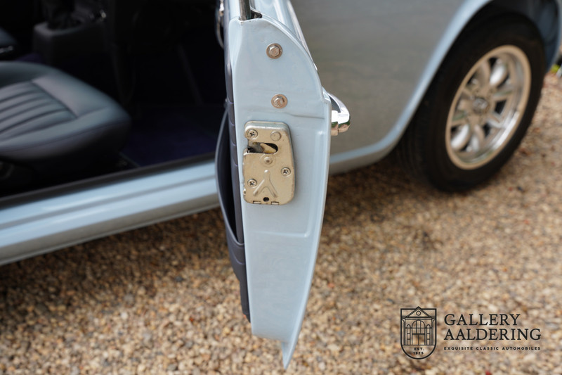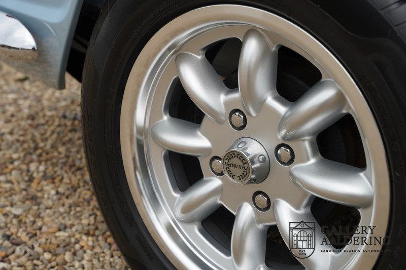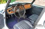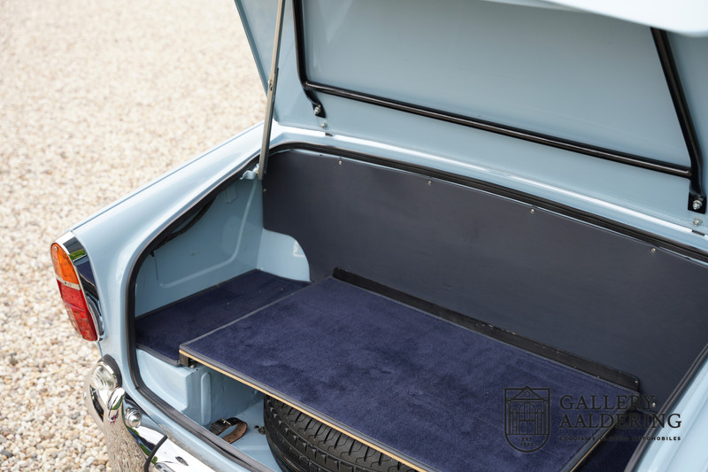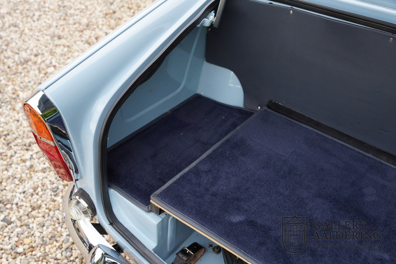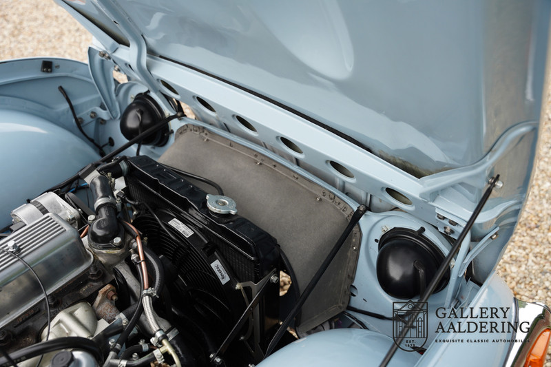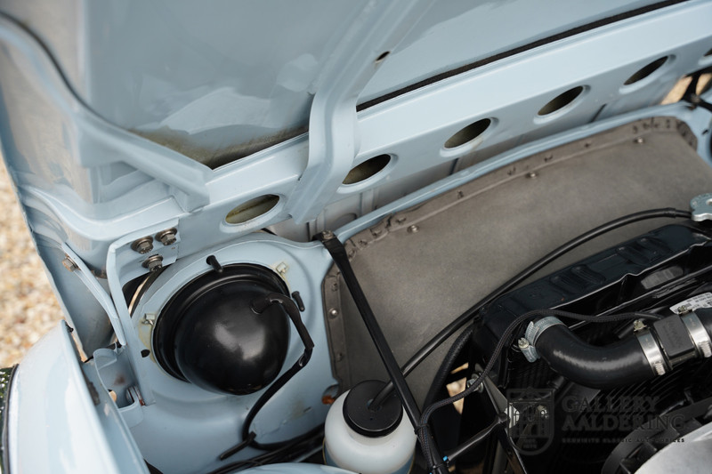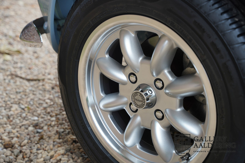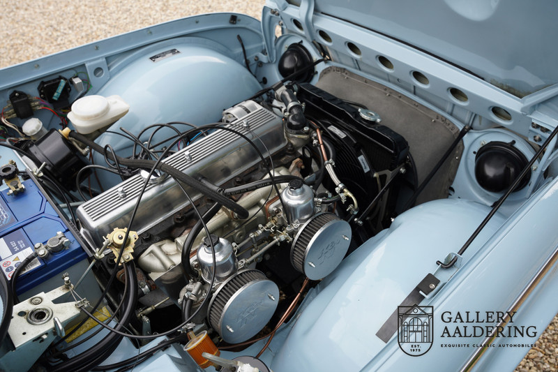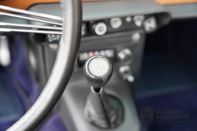 After the restoration, the car was provided with a beautiful coat of paint in the colour Wedgwood Blue, or Gulf Blue as it is also called. Together with the dark blue, almost black leather interior, it is a combination that looks really fantastic. The interior is of course in Concours condition, both in terms of condition and quality. The most beautiful materials were chosen during the restoration and the future buyer will reap the benefits. The seats are extra comfortable and the rare seats in the back are present. The original radio of the TR250 has been completely modified by a specialist, so that the appearance is original but the functionality of this time, with even hands-free possibilities.