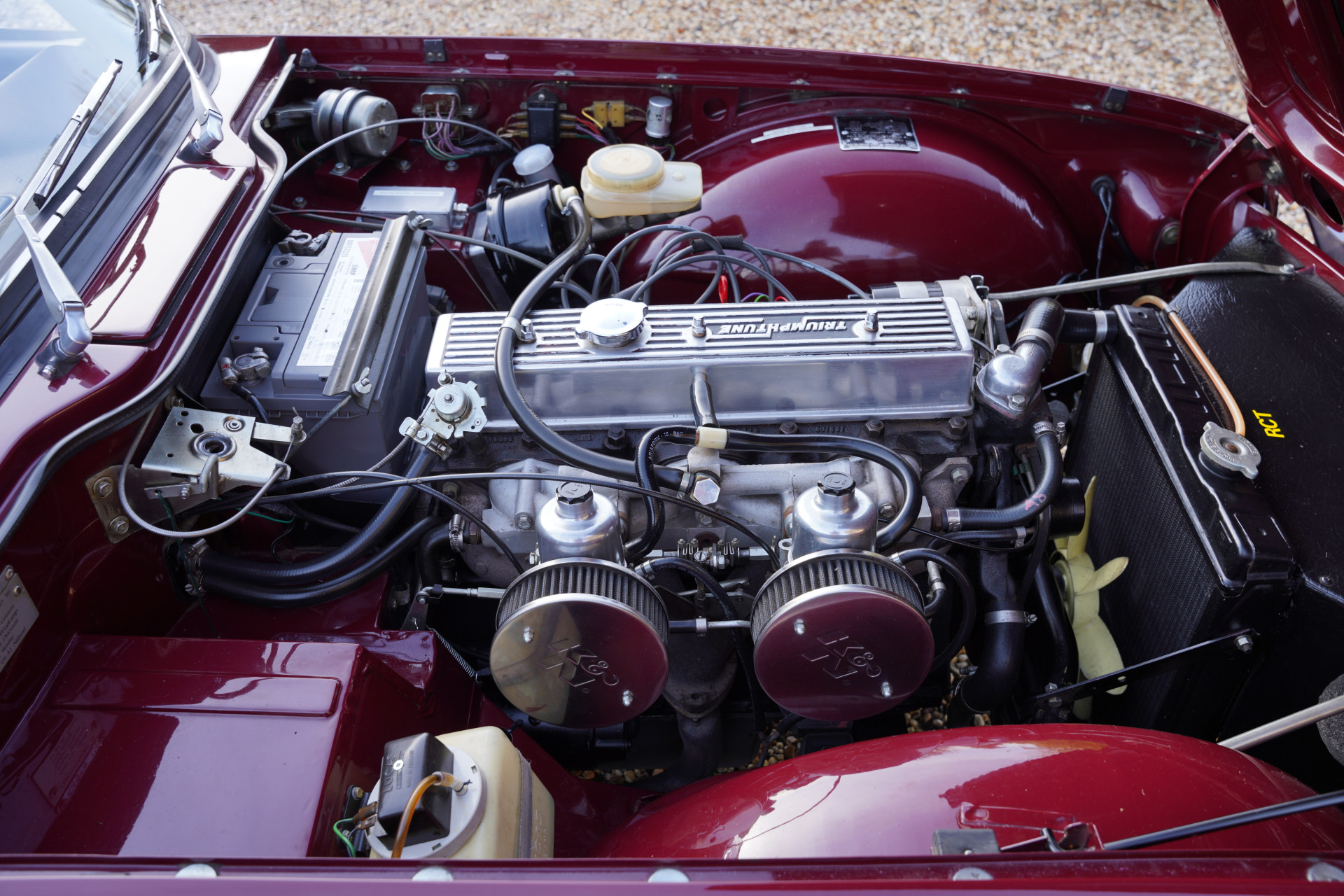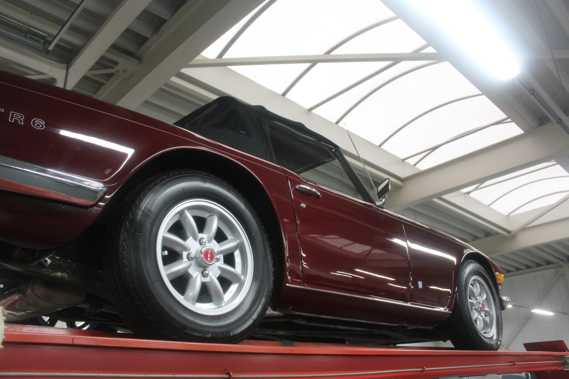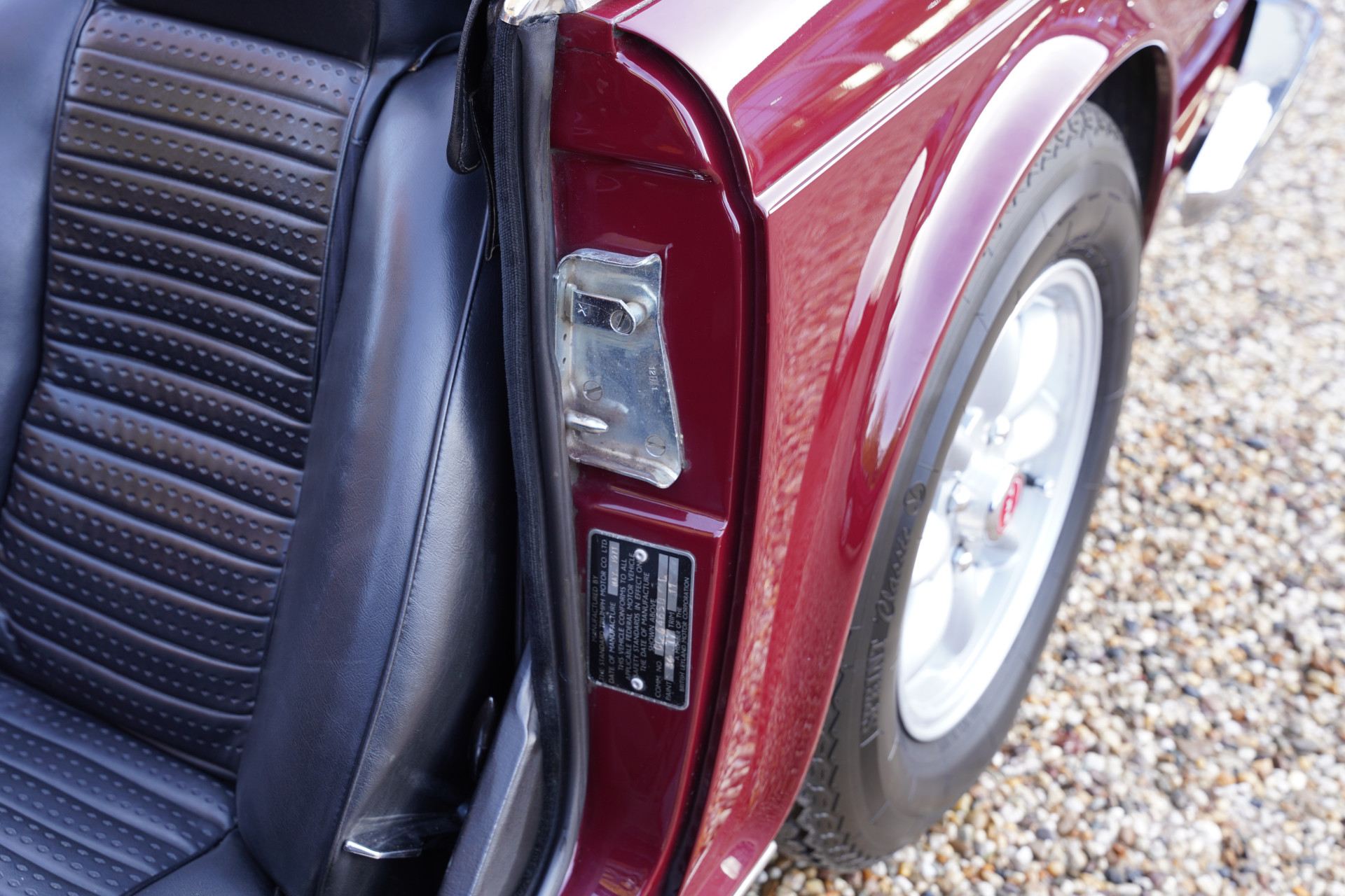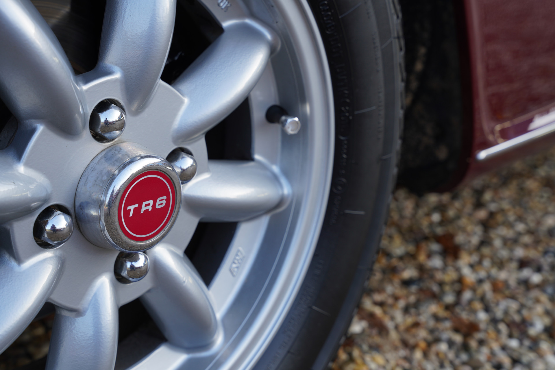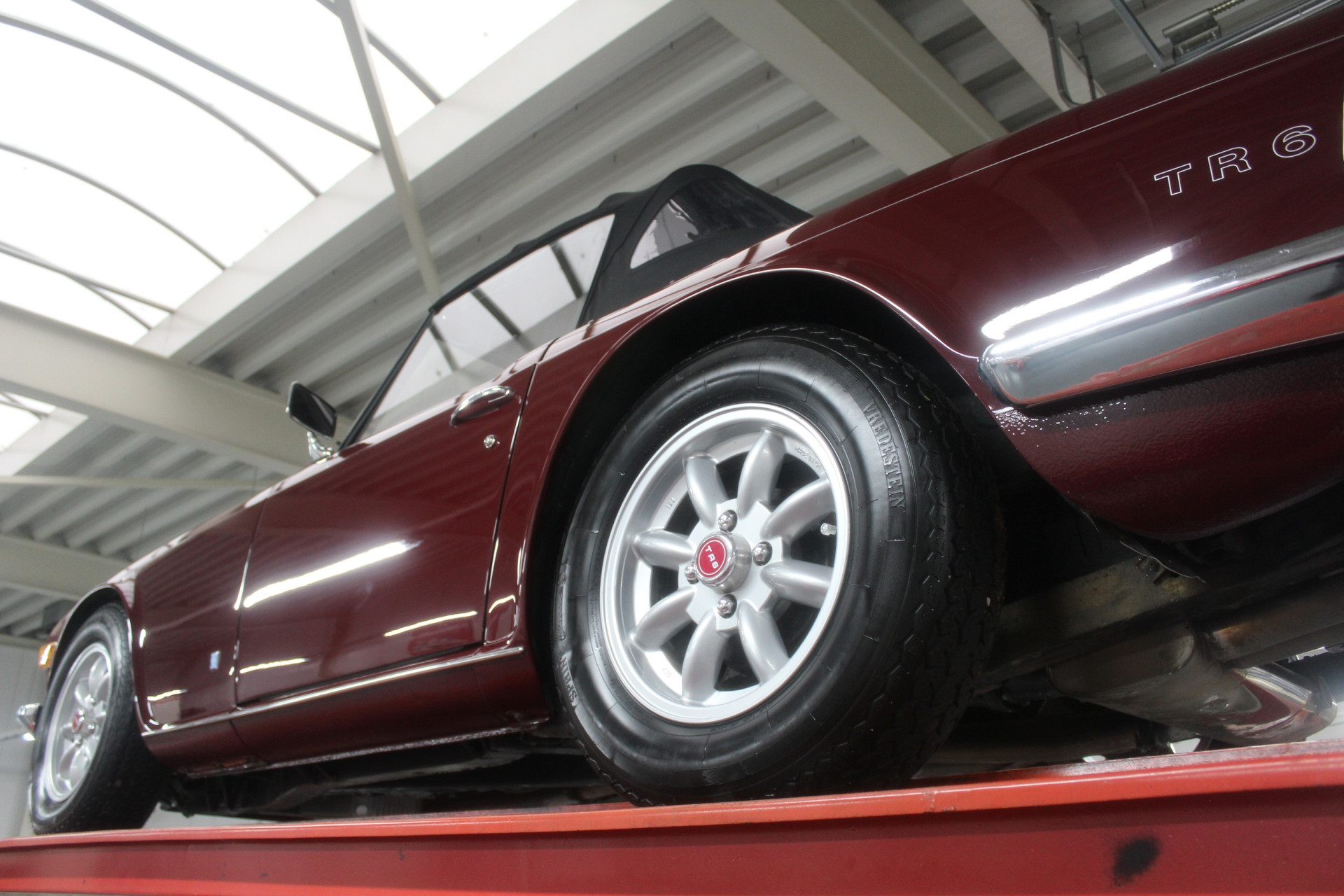 Unser wunderschöner Triumph, ausgeführt in Damson Red mit passender schwarzer Polsterung, ist ein äußerst attraktiver TR6. Er wirkt sportlich, hat aber auch eine stattliche Ausstrahlung, nicht wahr? Sie dürfen es selbst entscheiden, aber lassen Sie uns festhalten, dass die Farbkombination ihm sehr gut steht. Darüber hinaus wurde dieser Triumph einer “Body-off”-Restaurierung unterzogen, und die Technik wurde von Spezialisten überholt. Der Motor ist mit einer Kent Cam TH5 Fast Road Nockenwelle mit entsprechenden Ventilfedern ausgestattet. Zudem wurden verschiedene Modifikationen vorgenommen, wie ein verbessertes Kühlsystem.