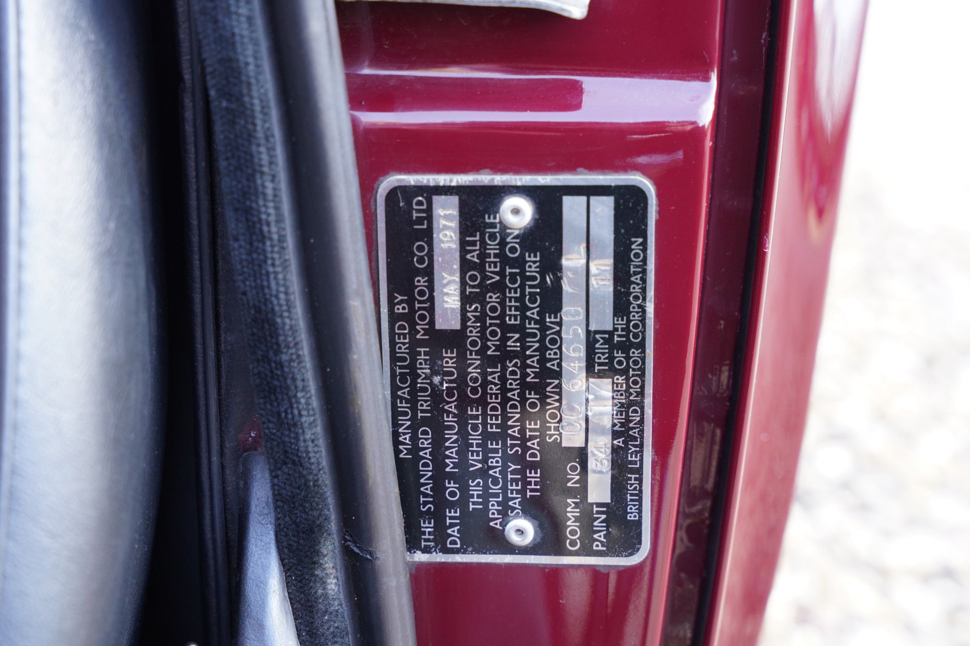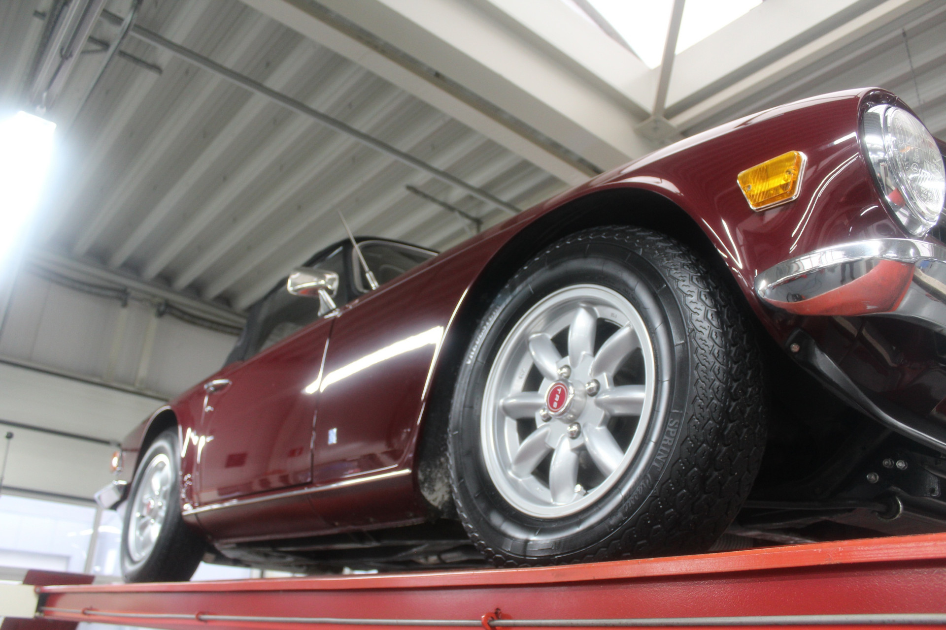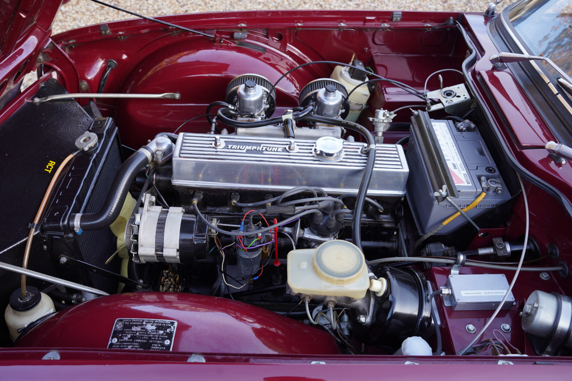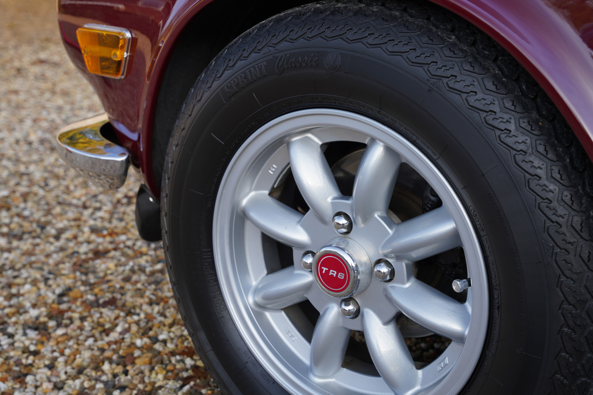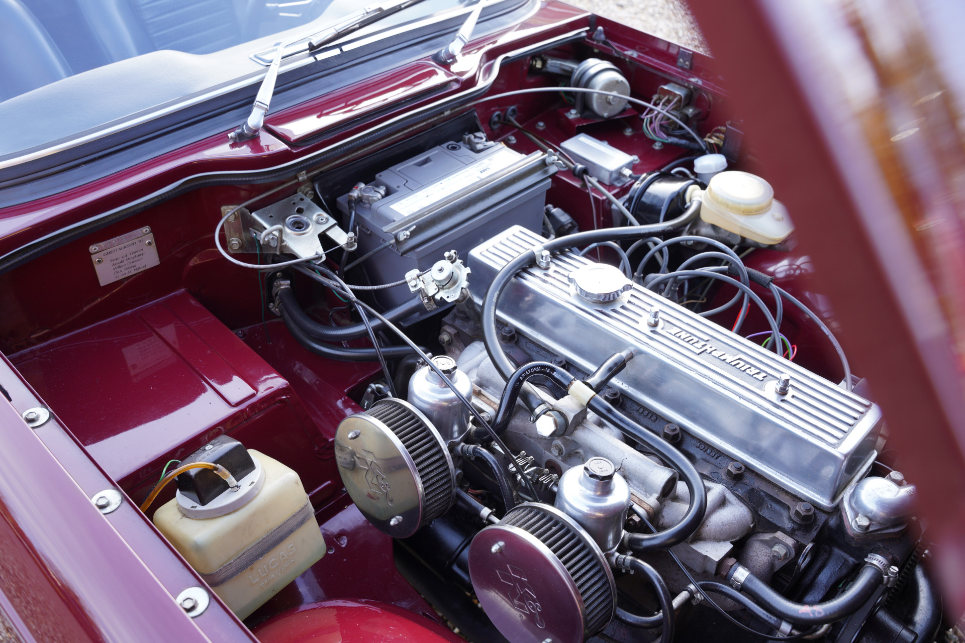 Unser wunderschöner Triumph, ausgeführt in Damson Red mit passender schwarzer Polsterung, ist ein äußerst attraktiver TR6. Er wirkt sportlich, hat aber auch eine stattliche Ausstrahlung, nicht wahr? Sie dürfen es selbst entscheiden, aber lassen Sie uns festhalten, dass die Farbkombination ihm sehr gut steht. Darüber hinaus wurde dieser Triumph einer “Body-off”-Restaurierung unterzogen, und die Technik wurde von Spezialisten überholt. Der Motor ist mit einer Kent Cam TH5 Fast Road Nockenwelle mit entsprechenden Ventilfedern ausgestattet. Zudem wurden verschiedene Modifikationen vorgenommen, wie ein verbessertes Kühlsystem.