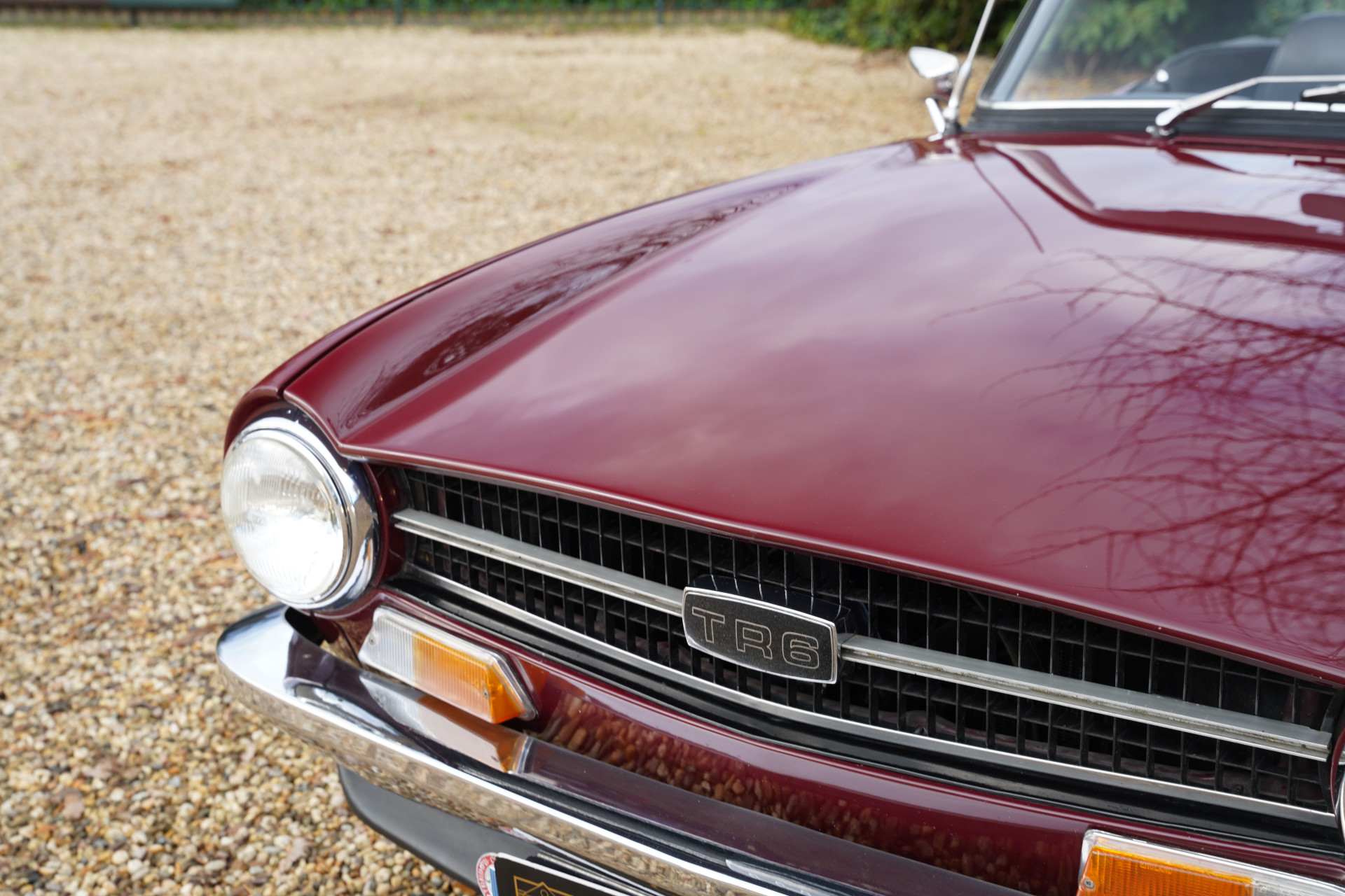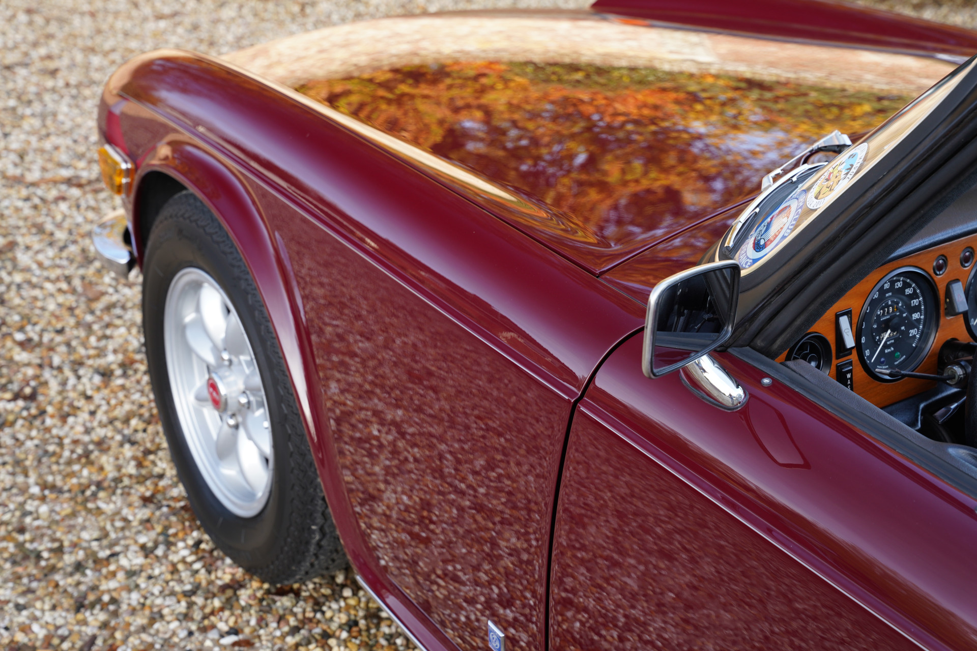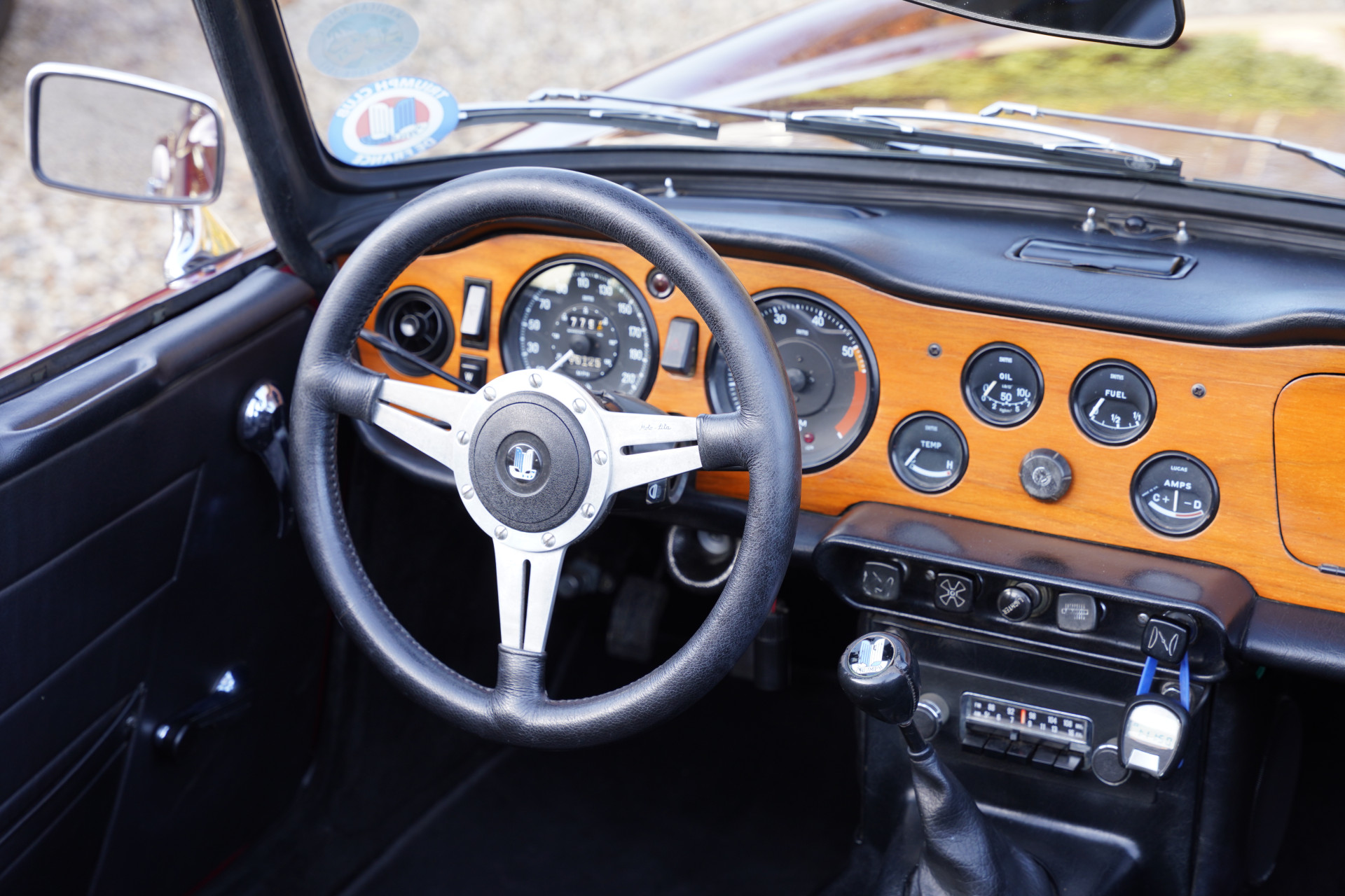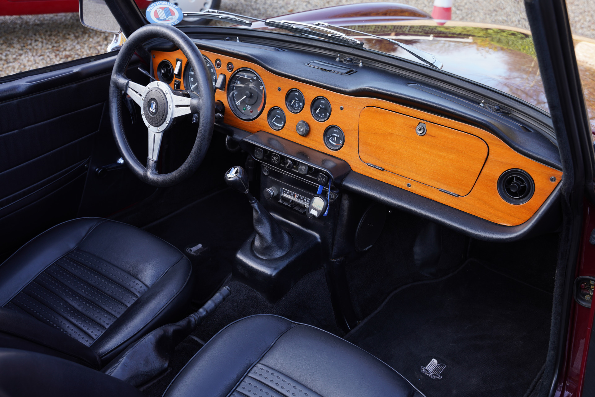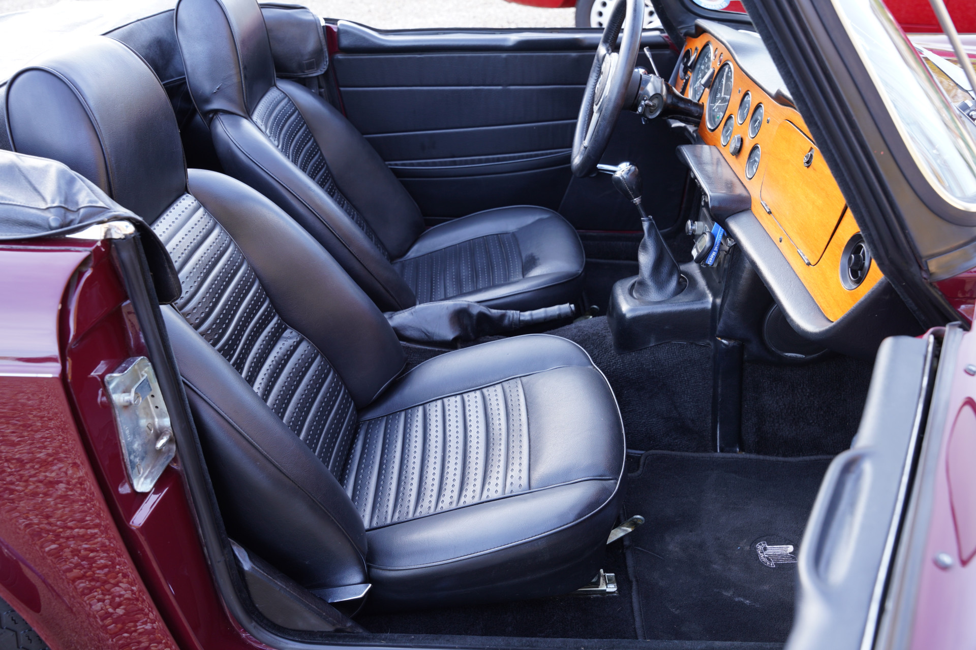 Our stunning Triumph, finished in Damson Red with matching black upholstery, is a very attractive TR6 to behold. It looks sporty yet has a classy appearance, doesn’t it? We’ll let you decide, but let’s agree that the color combination suits it exceptionally well. Moreover, this Triumph has undergone a body-off restoration, and the mechanics have been overhauled by specialists. The engine is equipped with a Kent Cam TH5 Fast Road camshaft with corresponding valve springs. Additionally, various modifications have been made, such as an improved cooling system.
