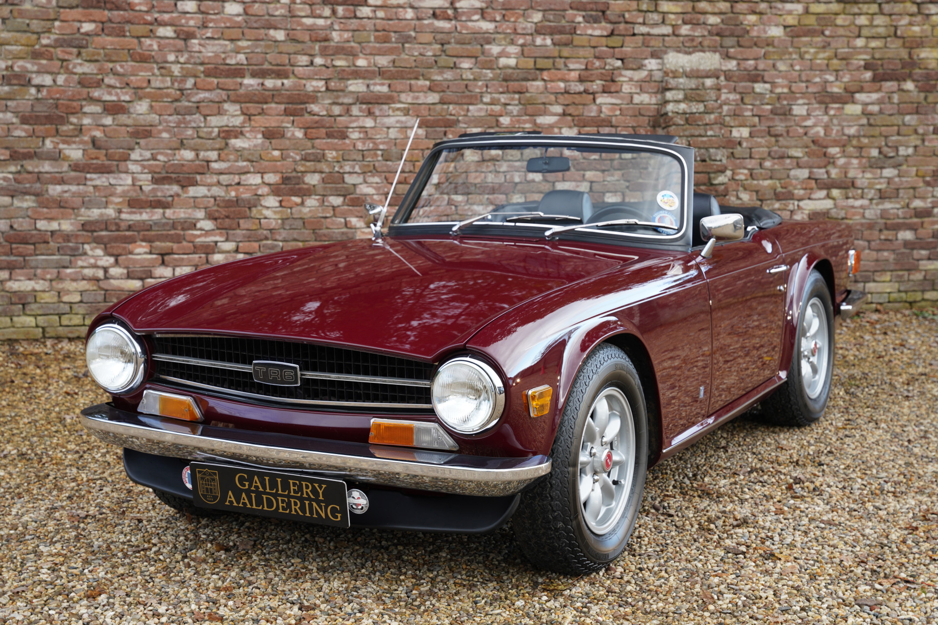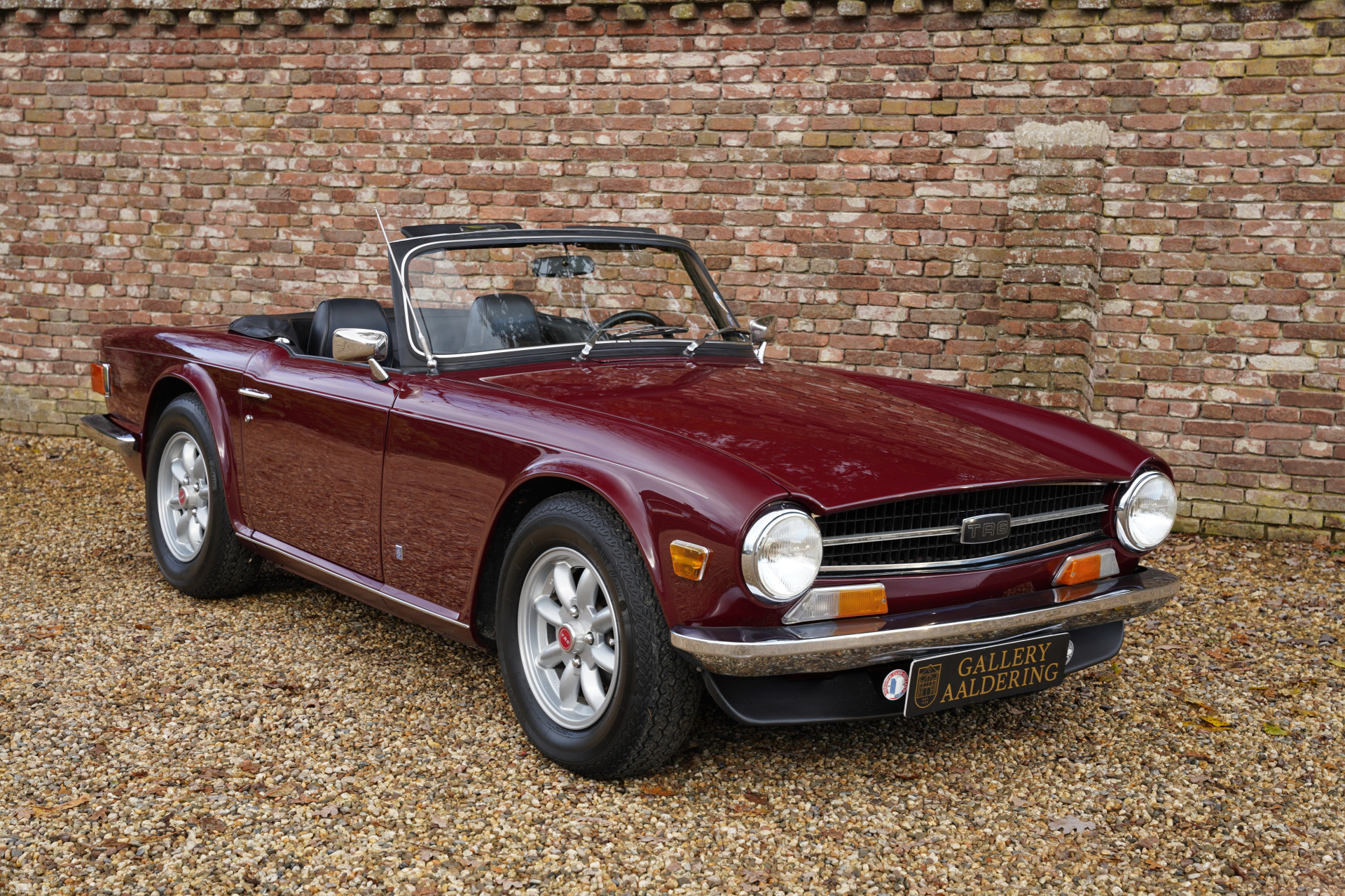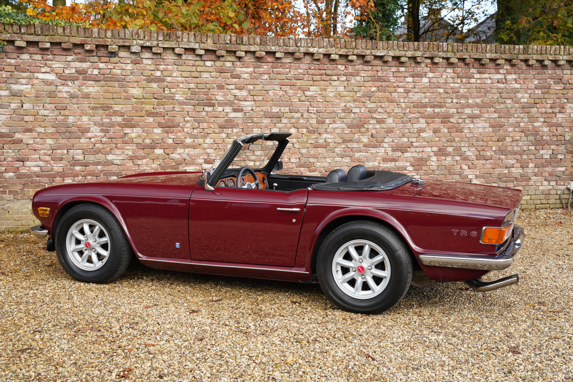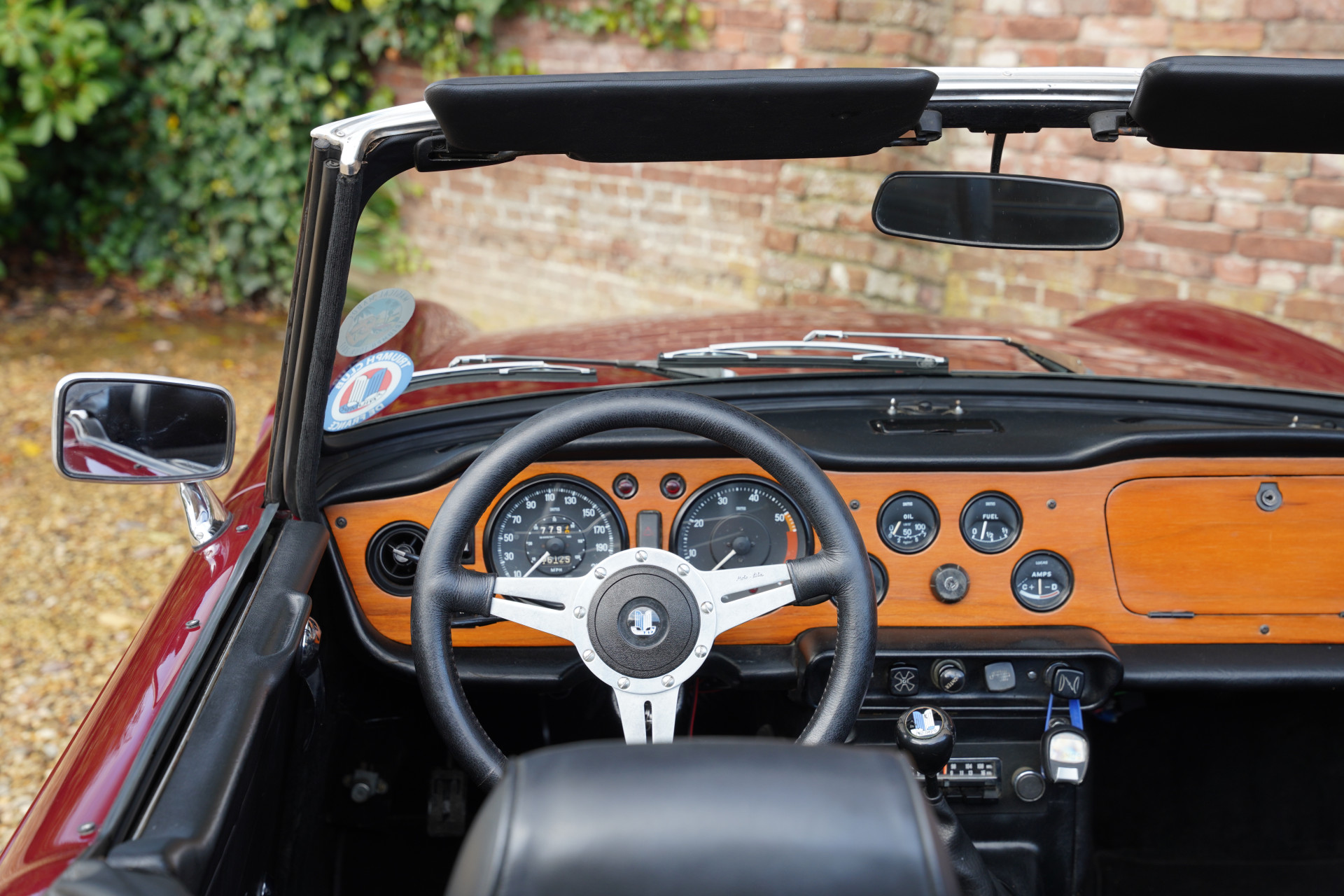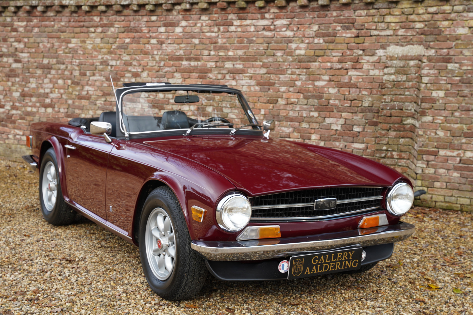 Our stunning Triumph, finished in Damson Red with matching black upholstery, is a very attractive TR6 to behold. It looks sporty yet has a classy appearance, doesn’t it? We’ll let you decide, but let’s agree that the color combination suits it exceptionally well. Moreover, this Triumph has undergone a body-off restoration, and the mechanics have been overhauled by specialists. The engine is equipped with a Kent Cam TH5 Fast Road camshaft with corresponding valve springs. Additionally, various modifications have been made, such as an improved cooling system.