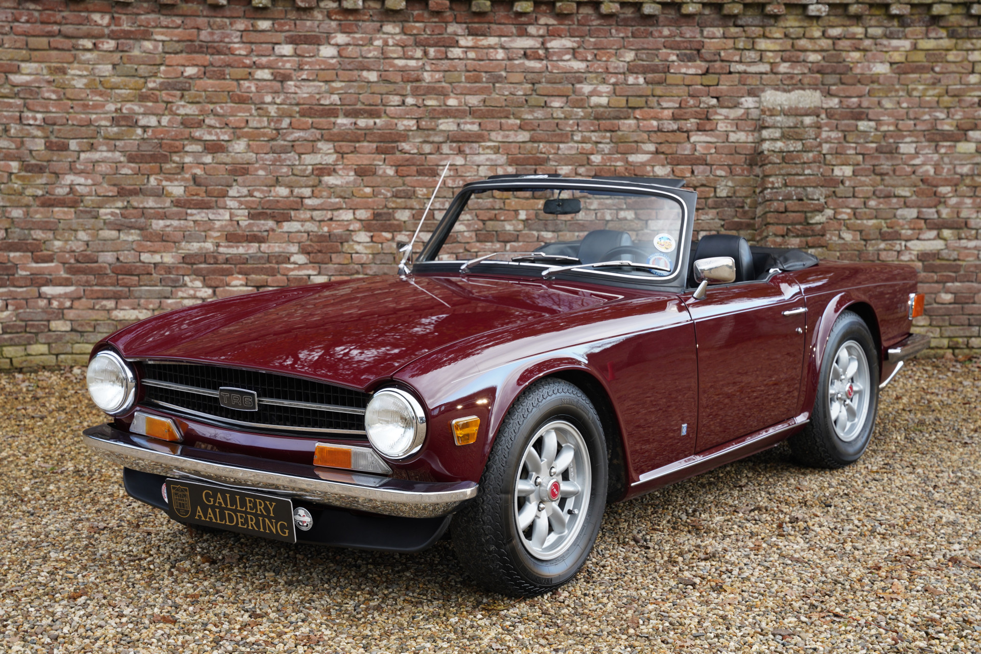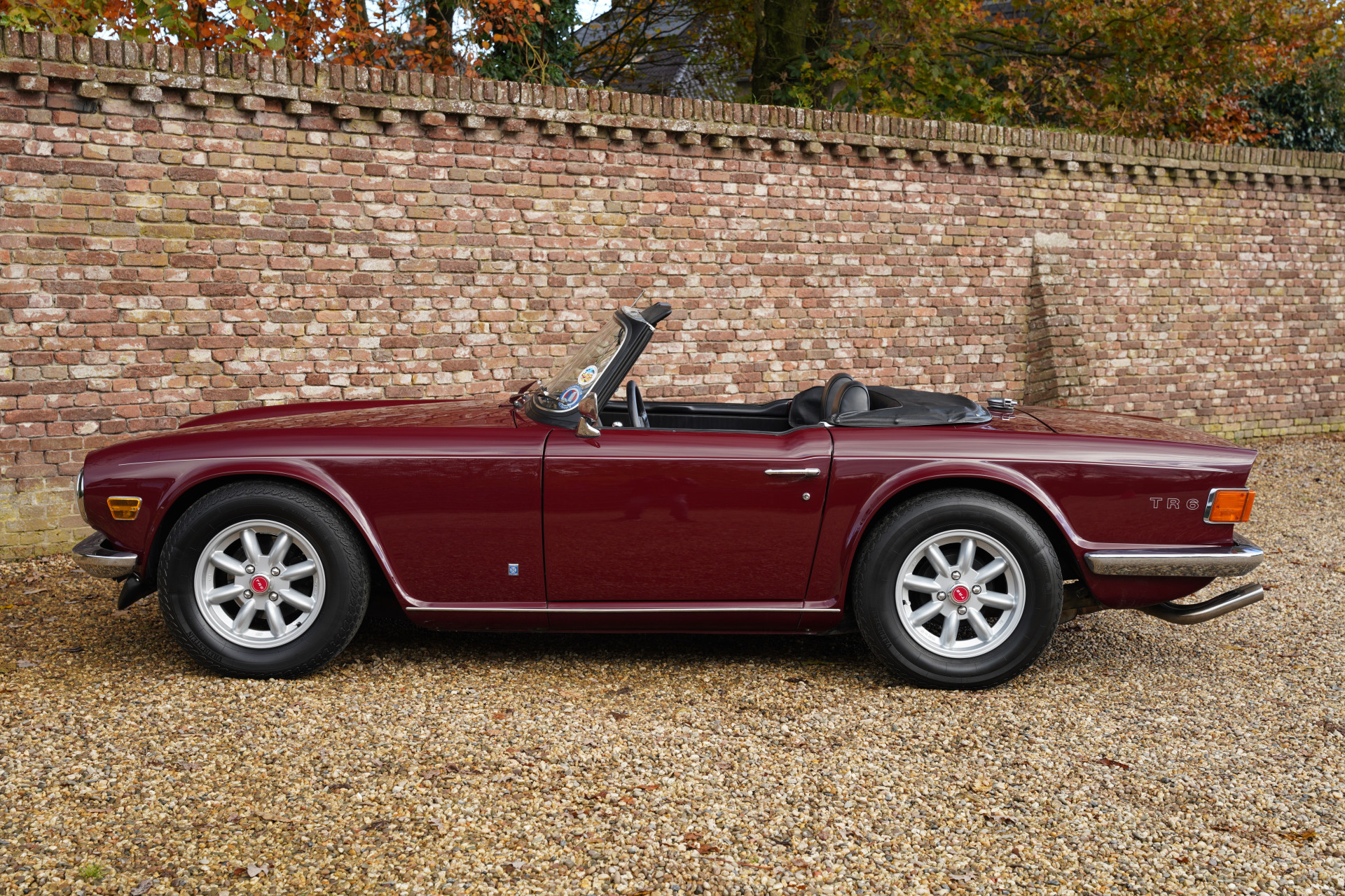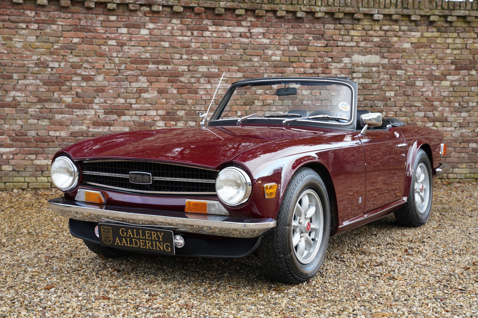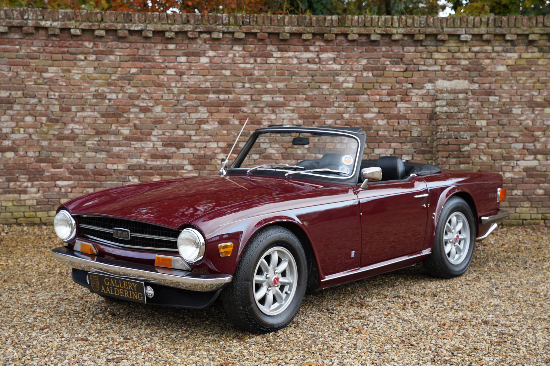 Our stunning Triumph, finished in Damson Red with matching black upholstery, is a very attractive TR6 to behold. It looks sporty yet has a classy appearance, doesn’t it? We’ll let you decide, but let’s agree that the color combination suits it exceptionally well. Moreover, this Triumph has undergone a body-off restoration, and the mechanics have been overhauled by specialists. The engine is equipped with a Kent Cam TH5 Fast Road camshaft with corresponding valve springs. Additionally, various modifications have been made, such as an improved cooling system.
