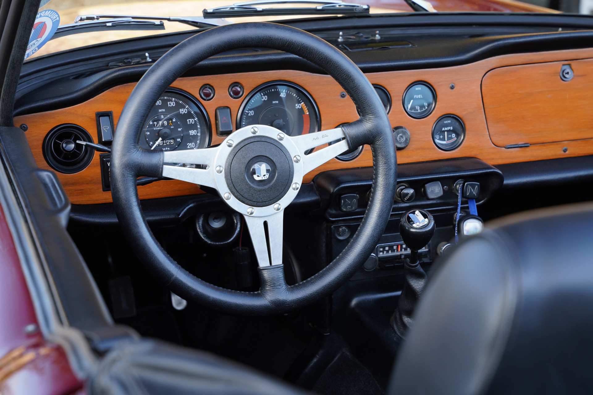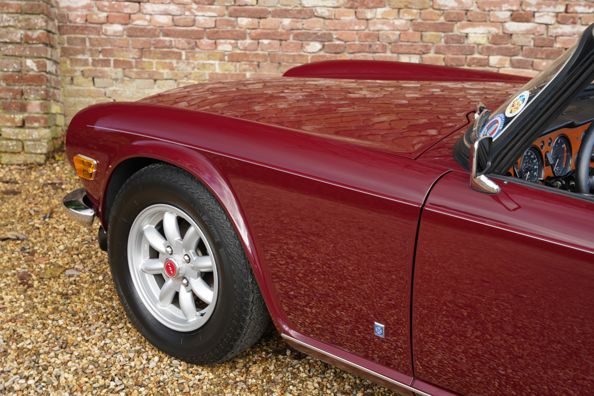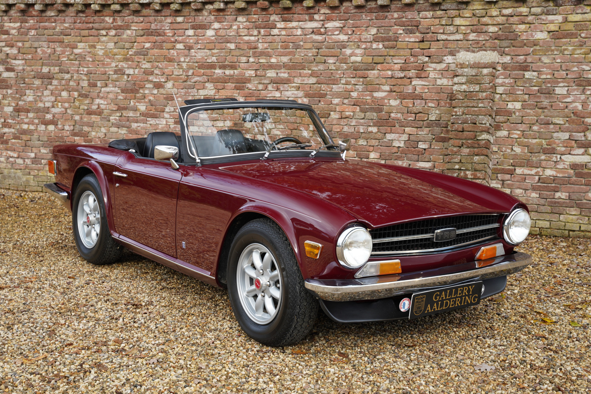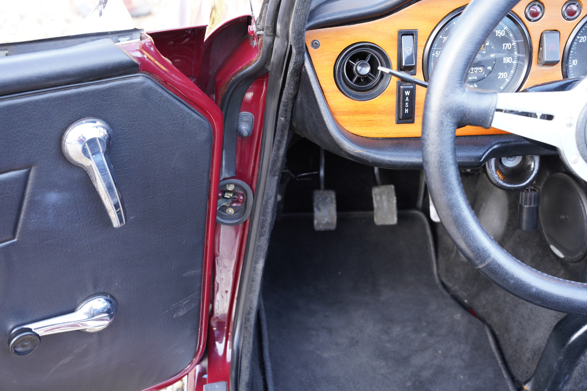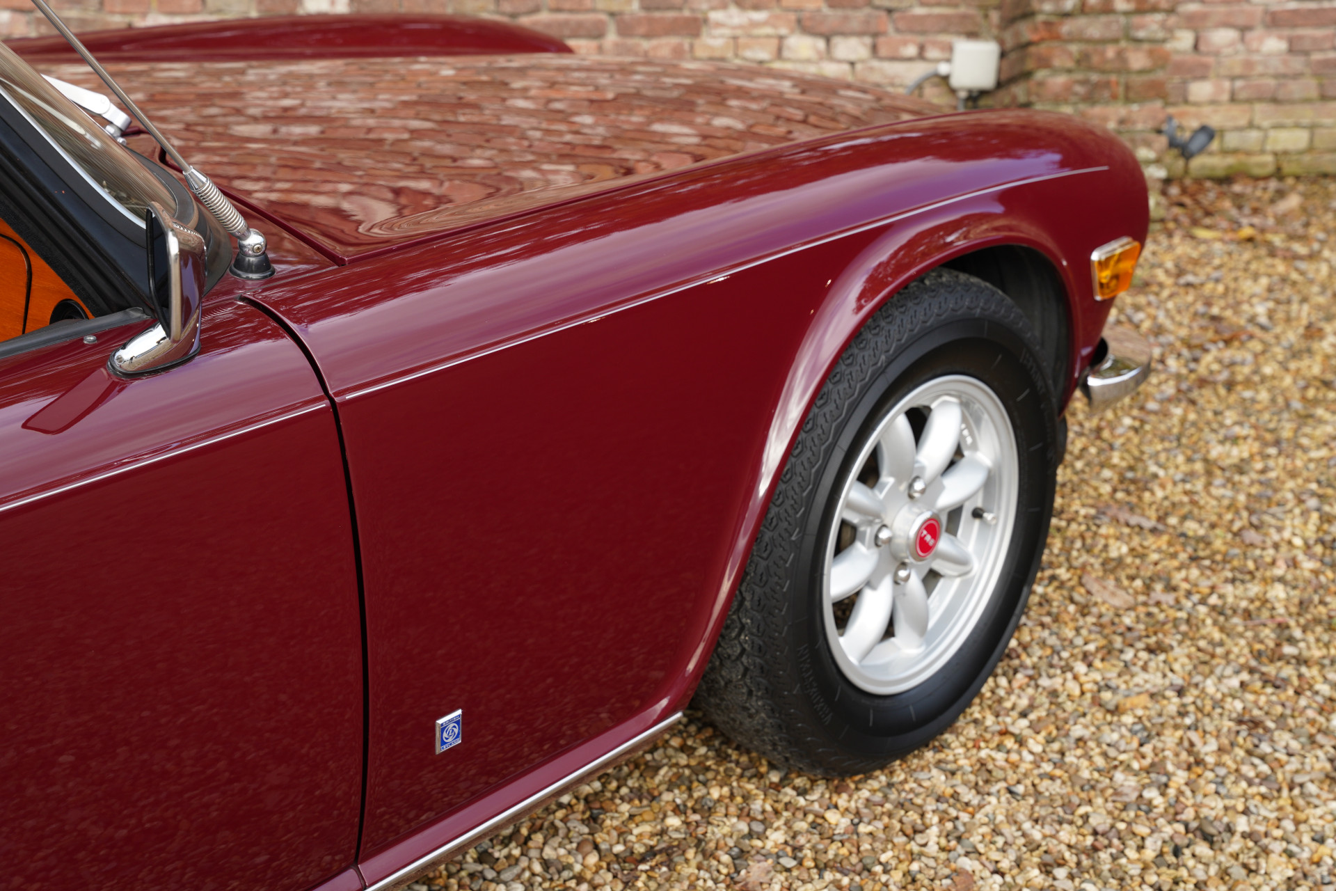 Our stunning Triumph, finished in Damson Red with matching black upholstery, is a very attractive TR6 to behold. It looks sporty yet has a classy appearance, doesn’t it? We’ll let you decide, but let’s agree that the color combination suits it exceptionally well. Moreover, this Triumph has undergone a body-off restoration, and the mechanics have been overhauled by specialists. The engine is equipped with a Kent Cam TH5 Fast Road camshaft with corresponding valve springs. Additionally, various modifications have been made, such as an improved cooling system.