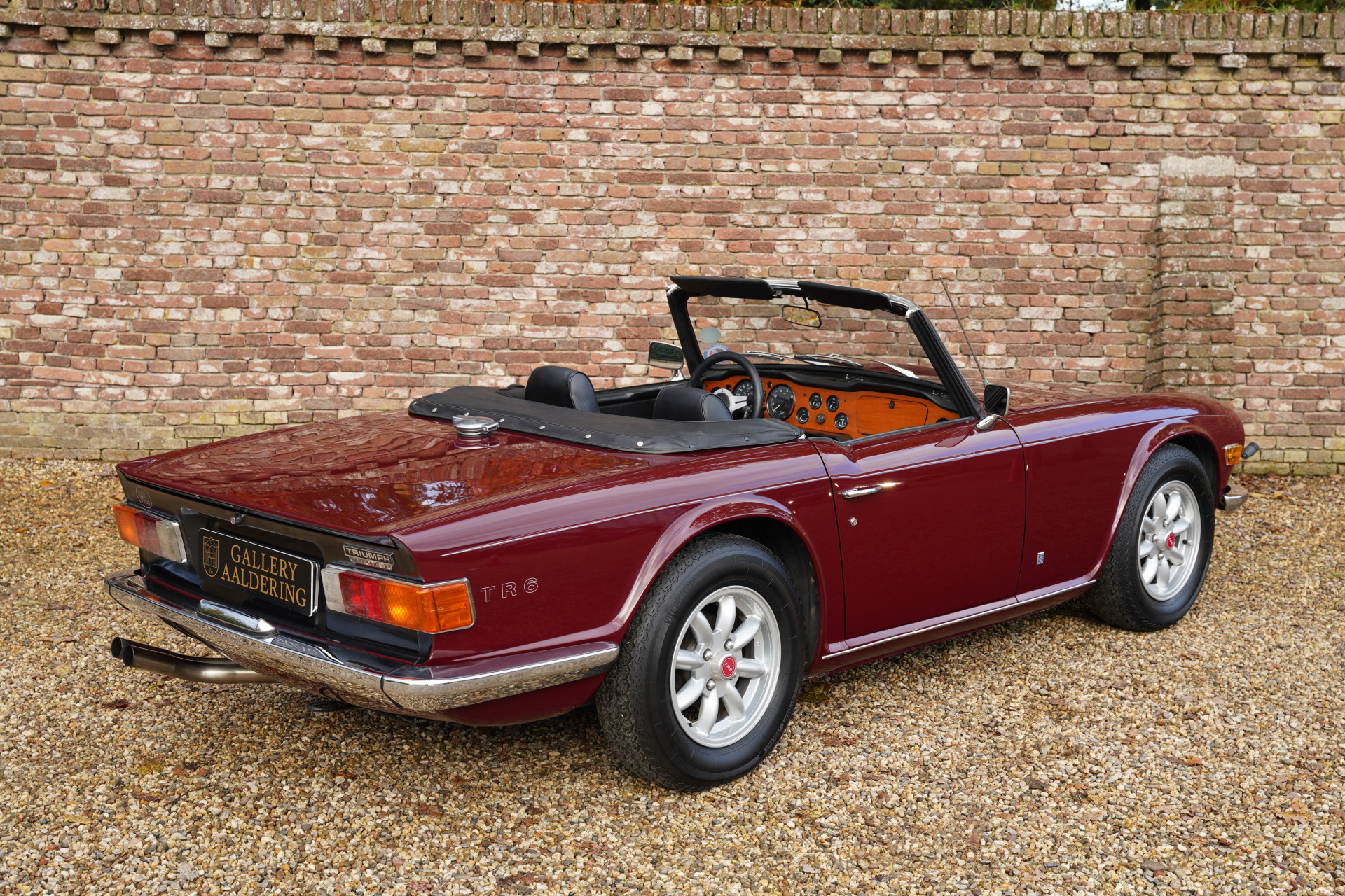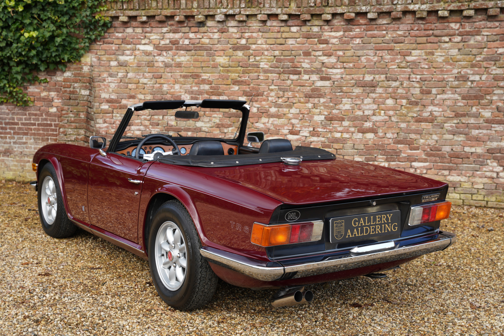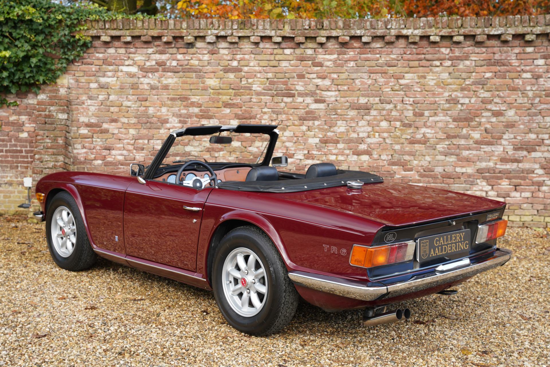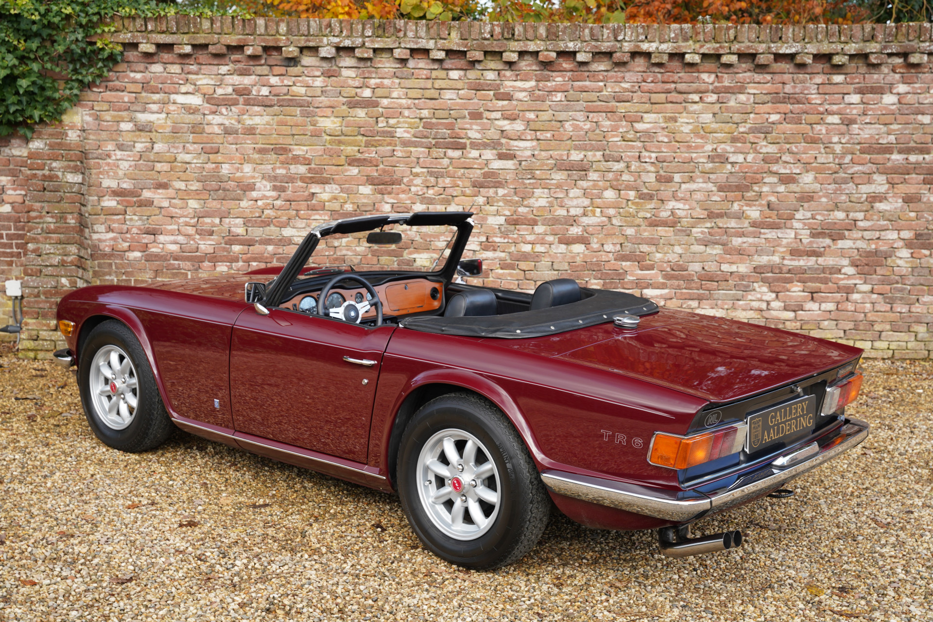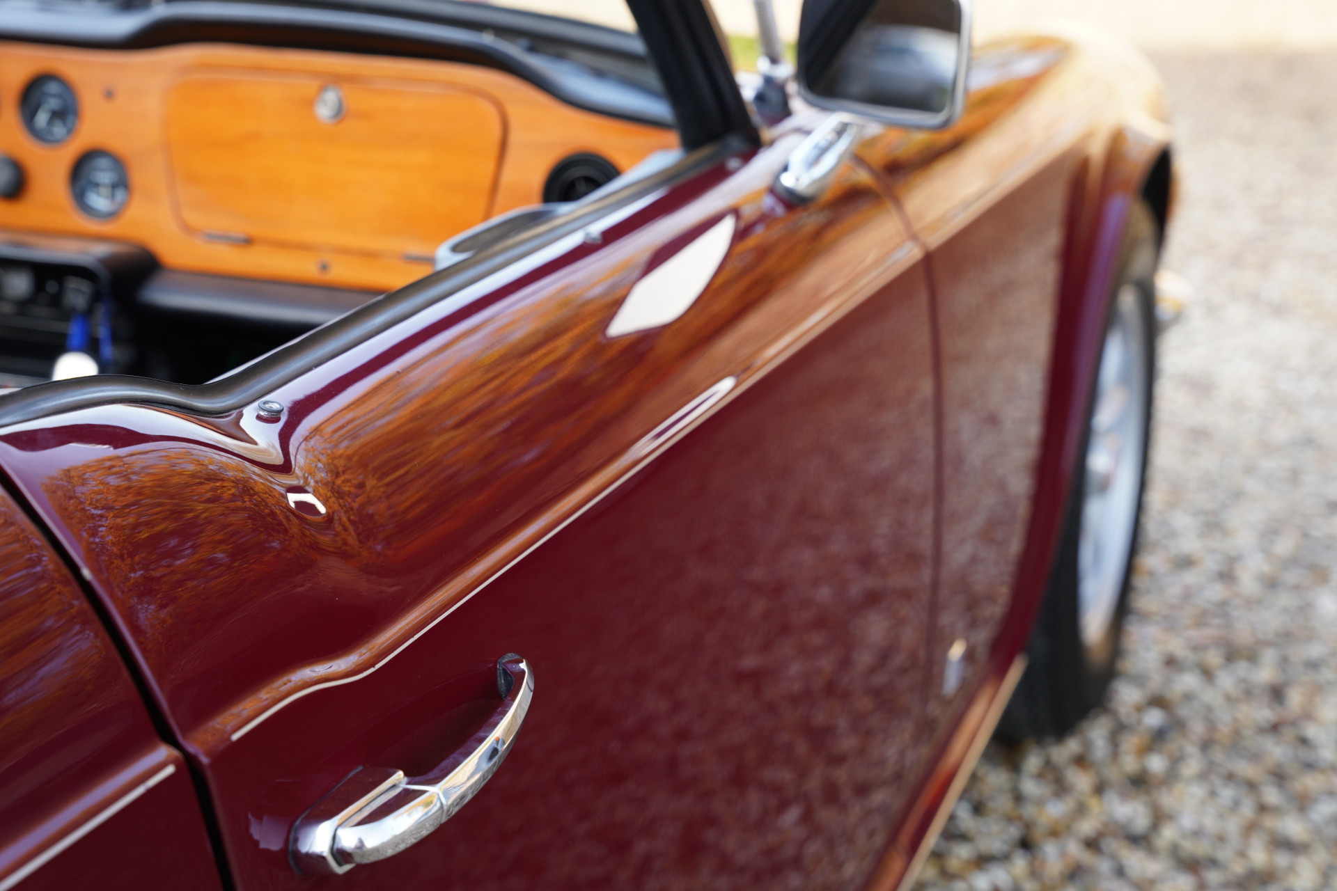 Our stunning Triumph, finished in Damson Red with matching black upholstery, is a very attractive TR6 to behold. It looks sporty yet has a classy appearance, doesn’t it? We’ll let you decide, but let’s agree that the color combination suits it exceptionally well. Moreover, this Triumph has undergone a body-off restoration, and the mechanics have been overhauled by specialists. The engine is equipped with a Kent Cam TH5 Fast Road camshaft with corresponding valve springs. Additionally, various modifications have been made, such as an improved cooling system.