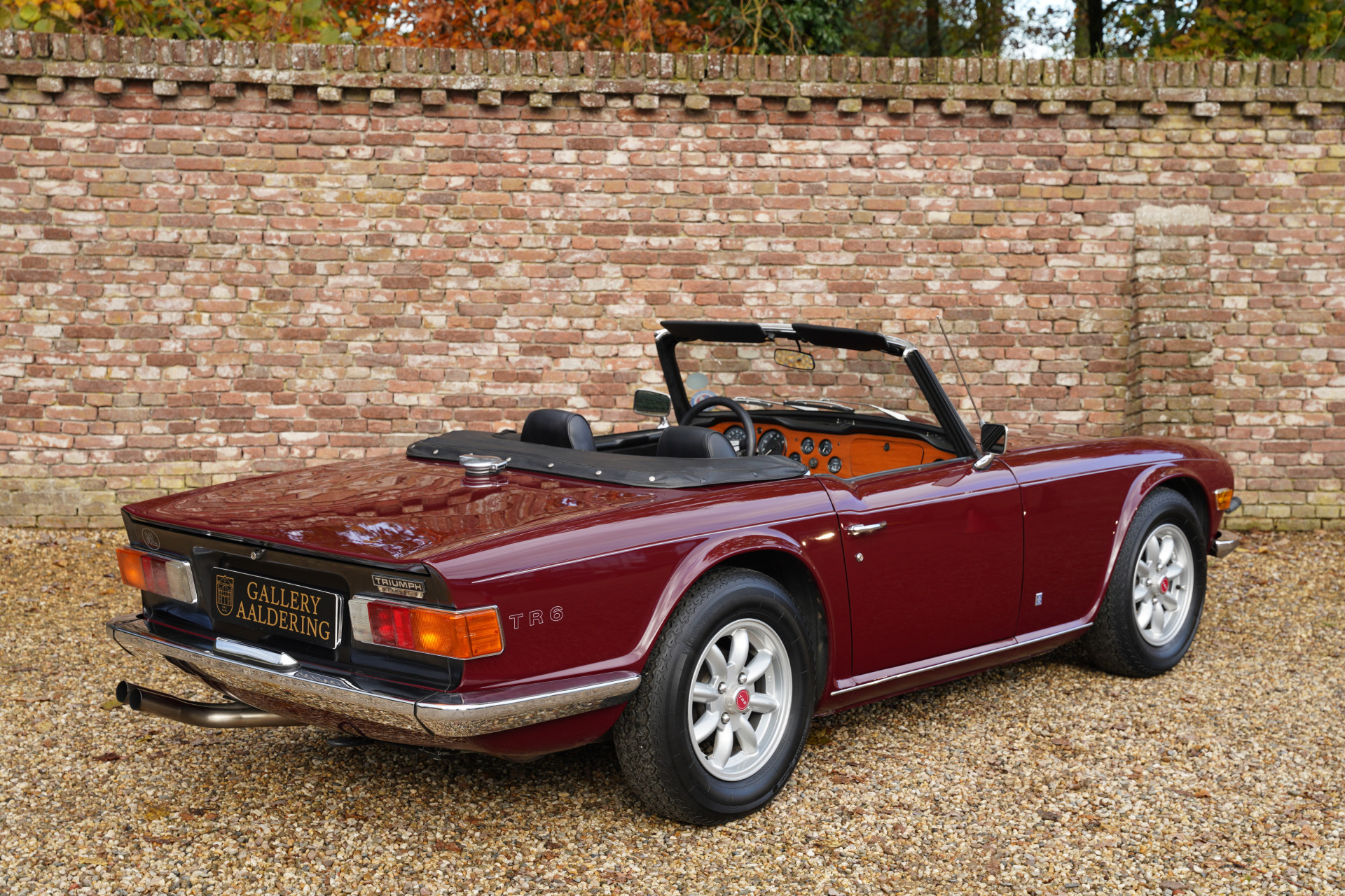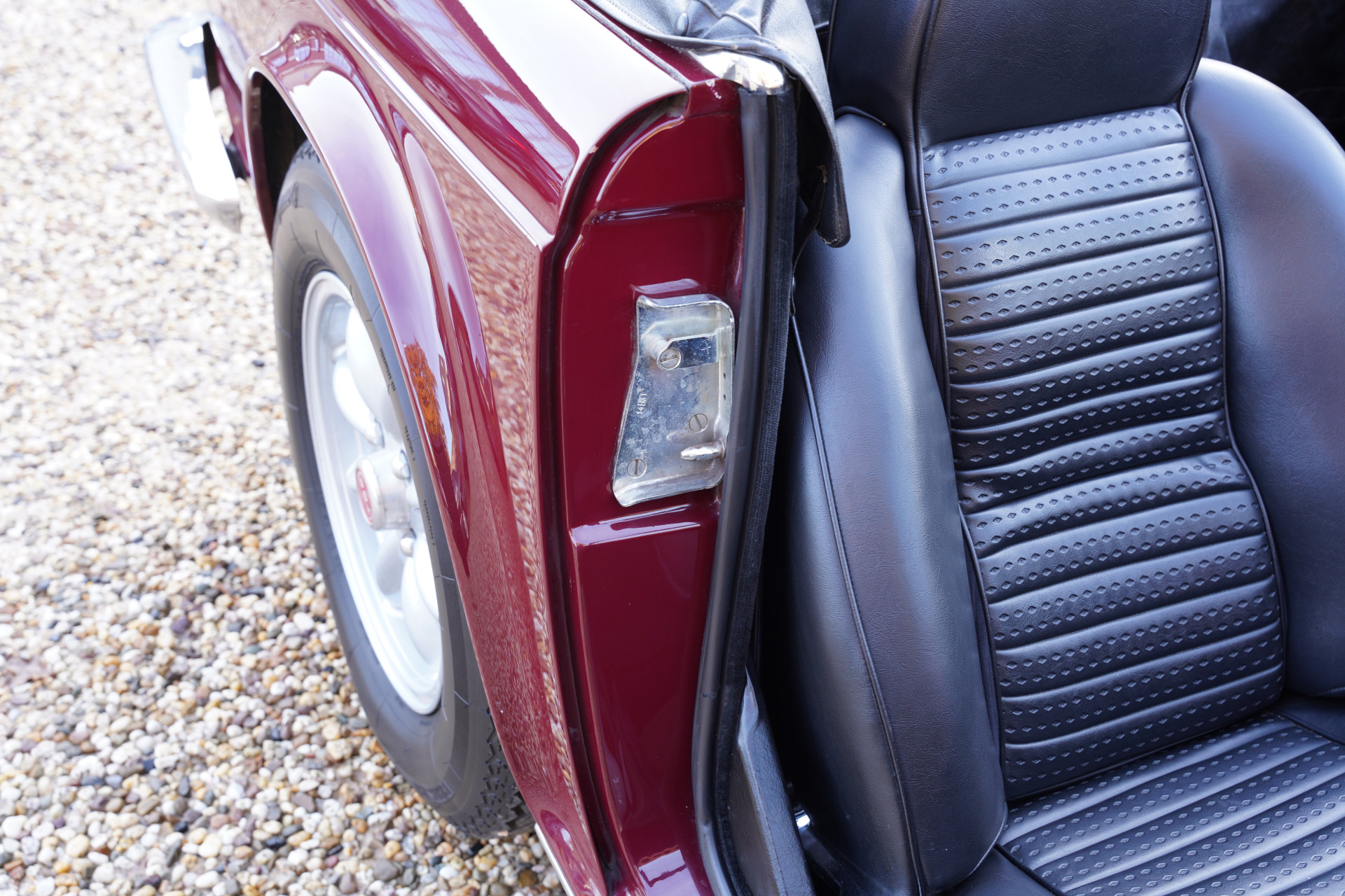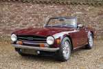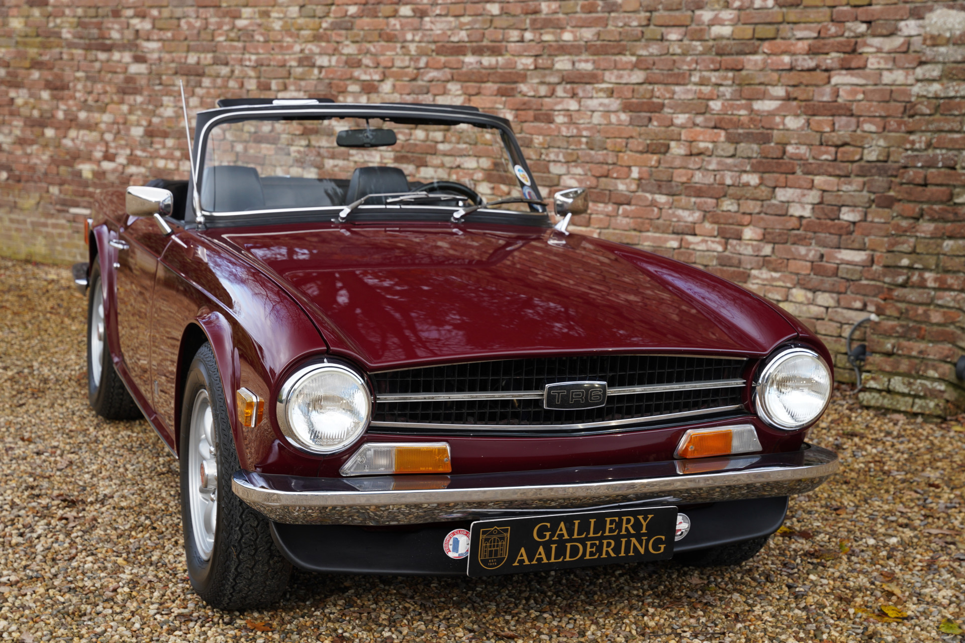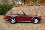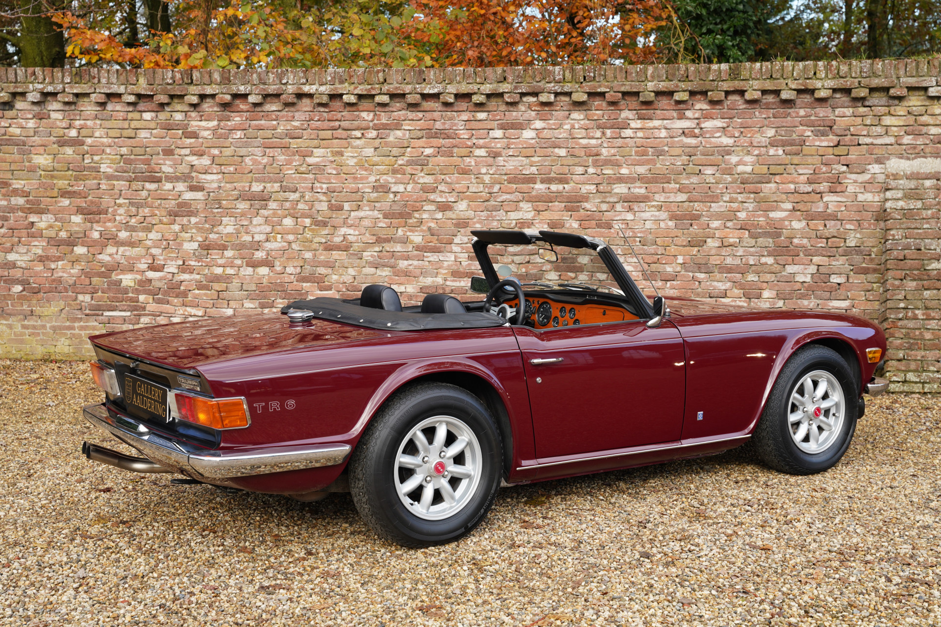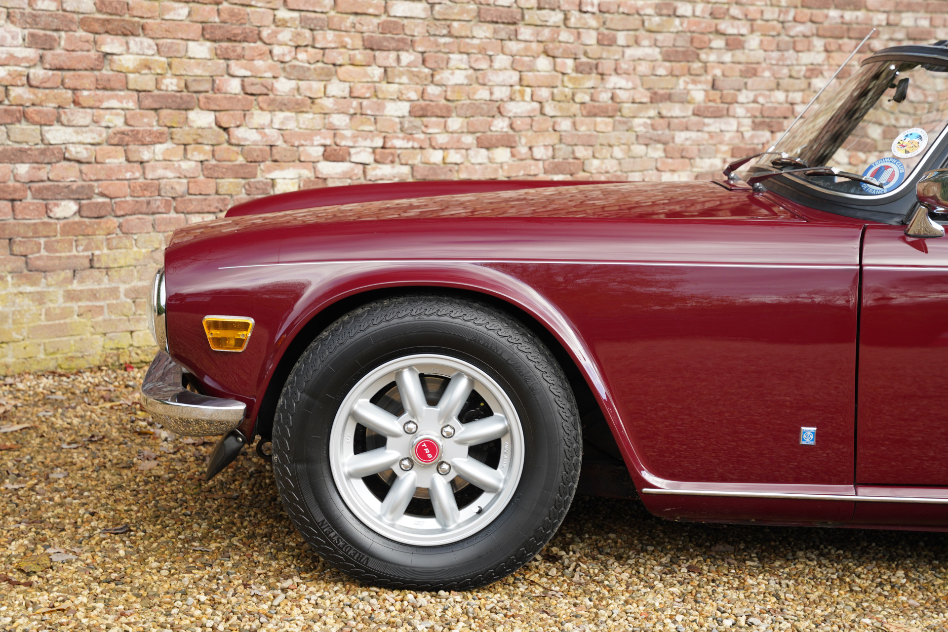 Our stunning Triumph, finished in Damson Red with matching black upholstery, is a very attractive TR6 to behold. It looks sporty yet has a classy appearance, doesn’t it? We’ll let you decide, but let’s agree that the color combination suits it exceptionally well. Moreover, this Triumph has undergone a body-off restoration, and the mechanics have been overhauled by specialists. The engine is equipped with a Kent Cam TH5 Fast Road camshaft with corresponding valve springs. Additionally, various modifications have been made, such as an improved cooling system.