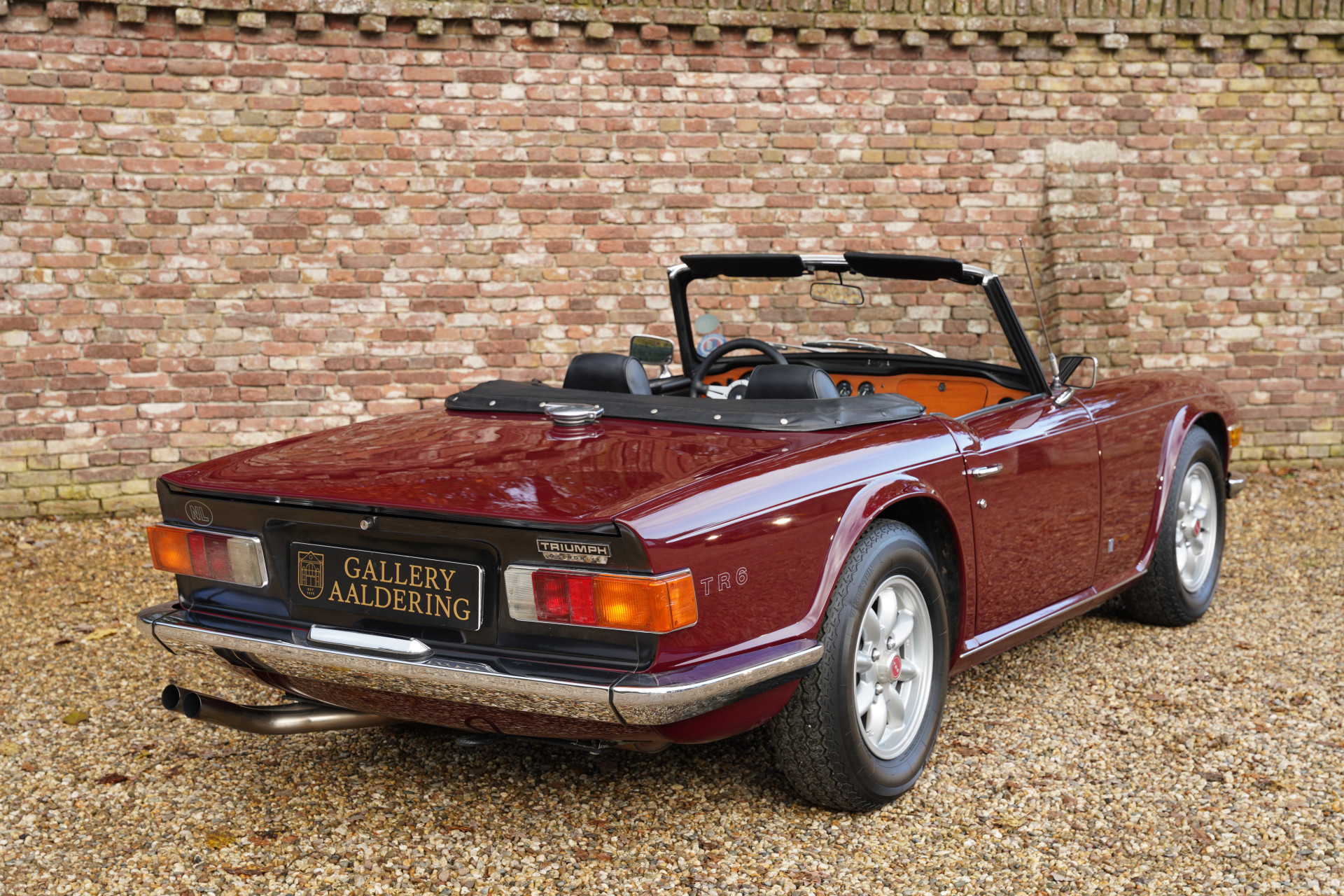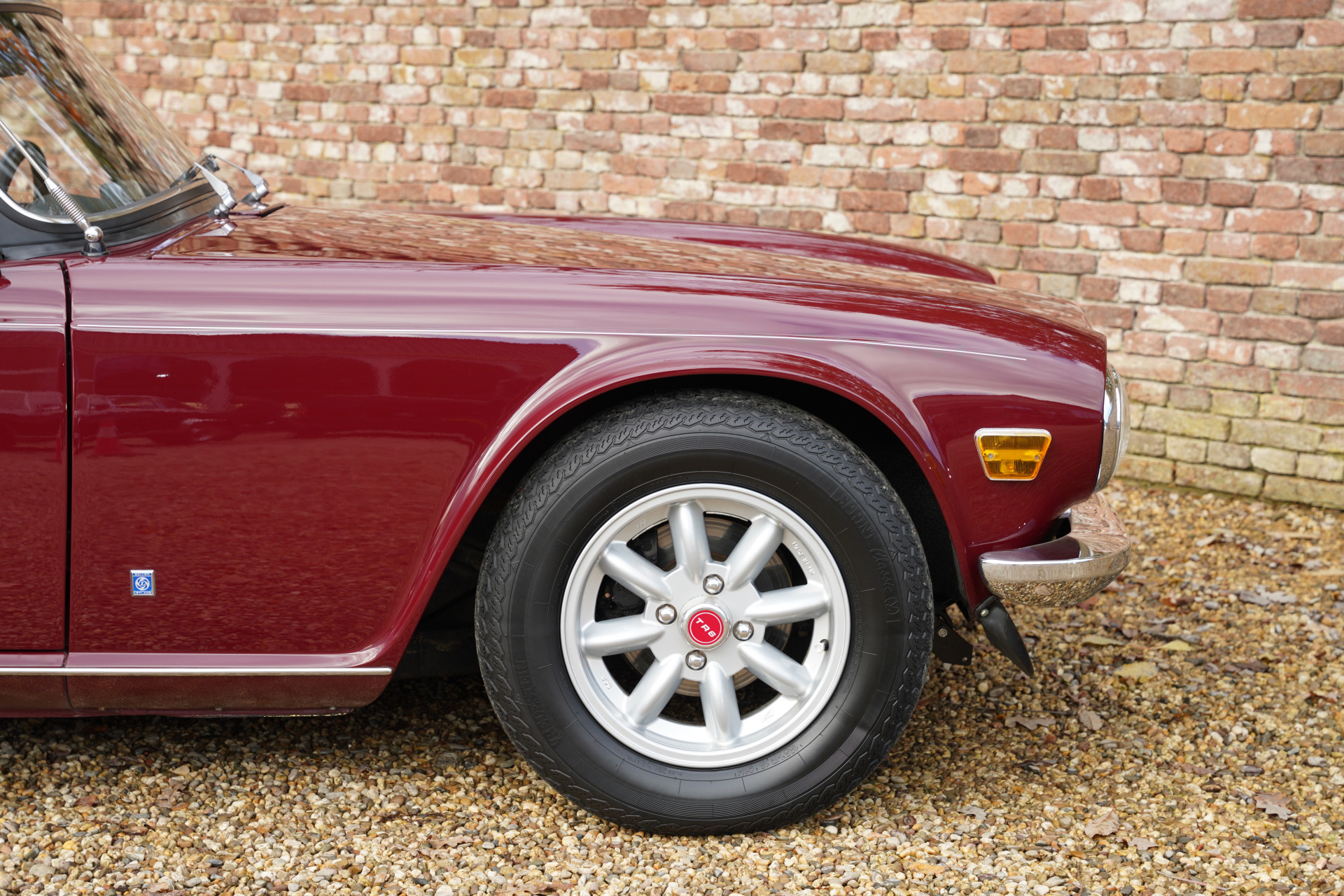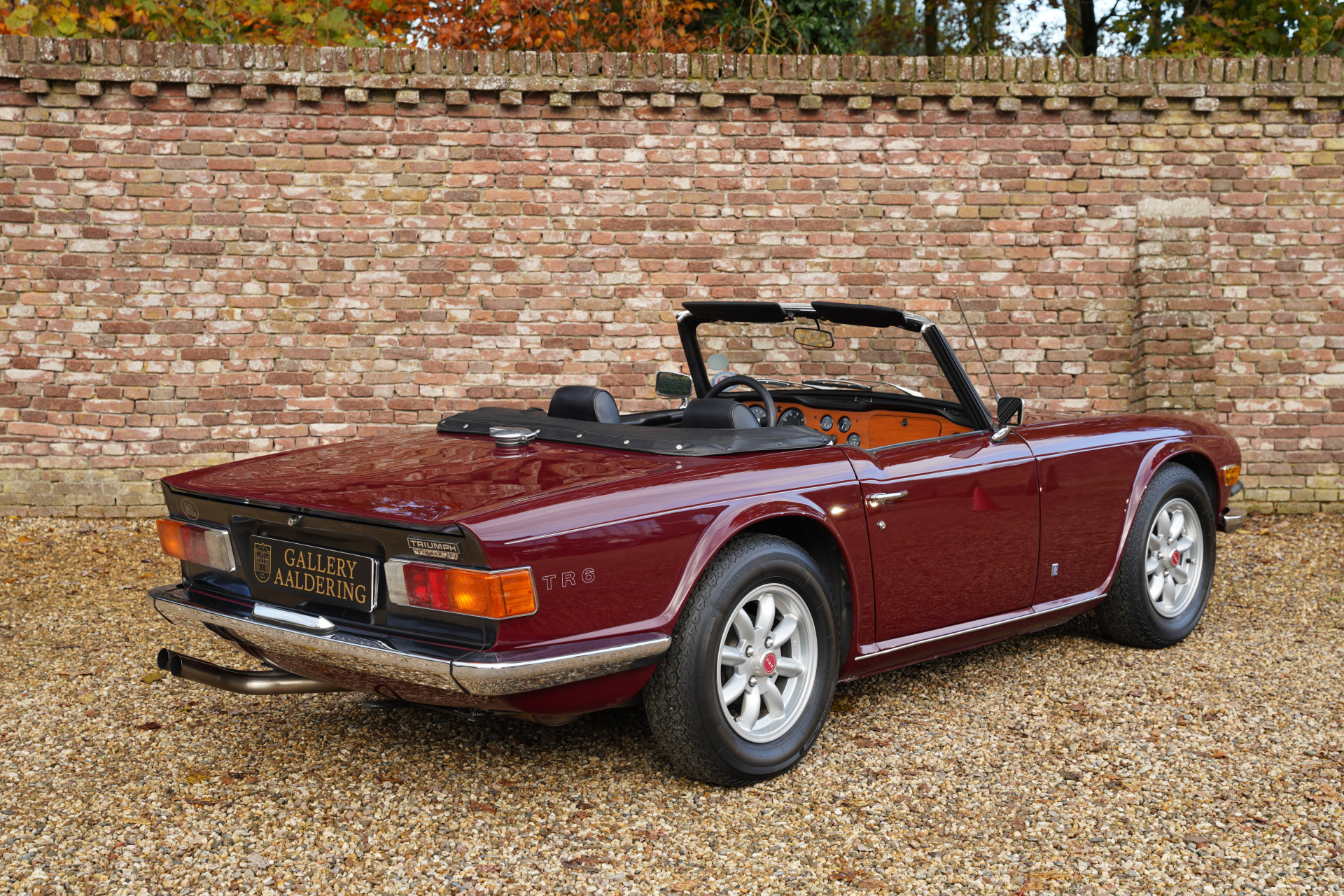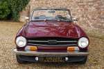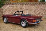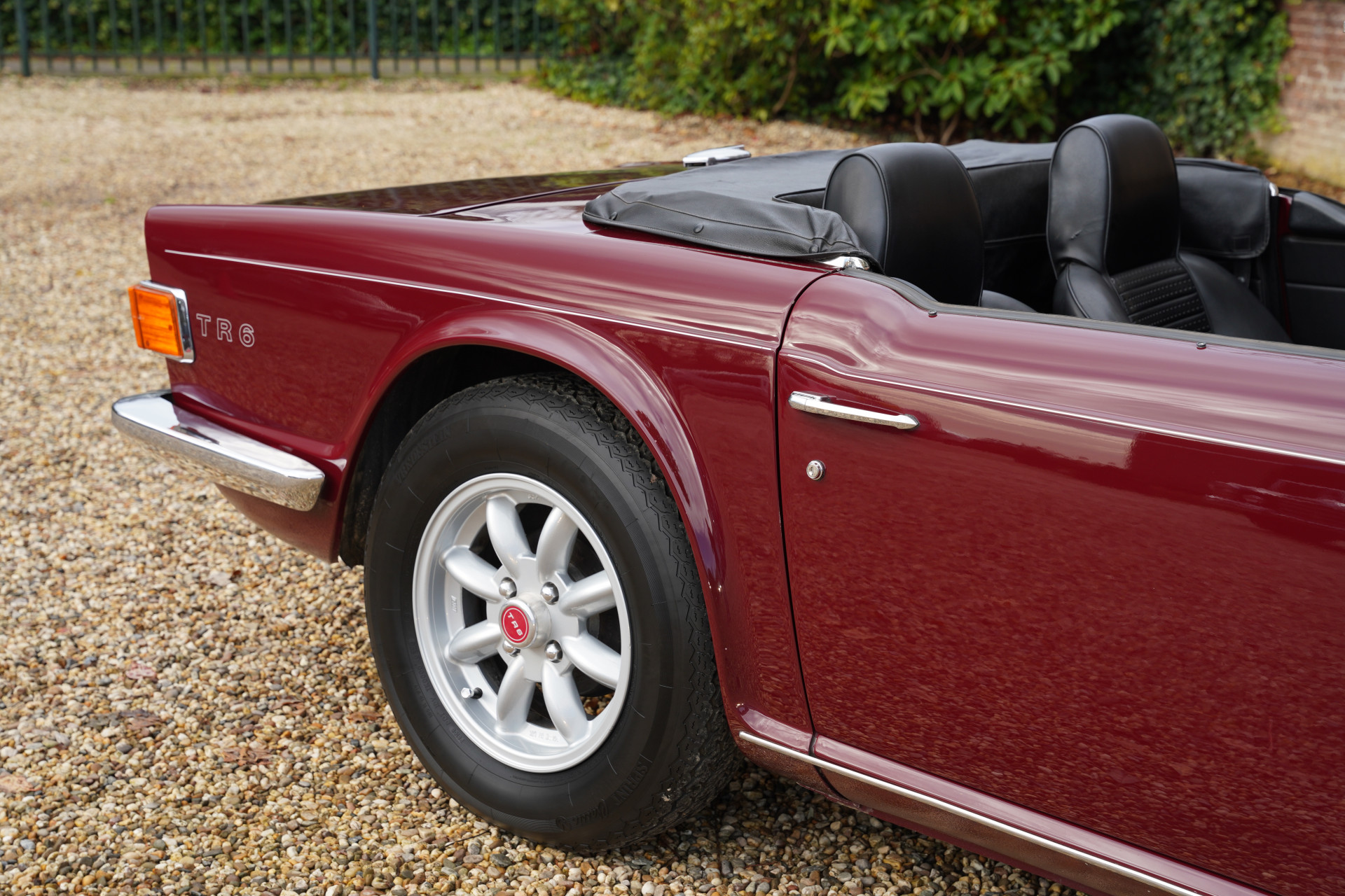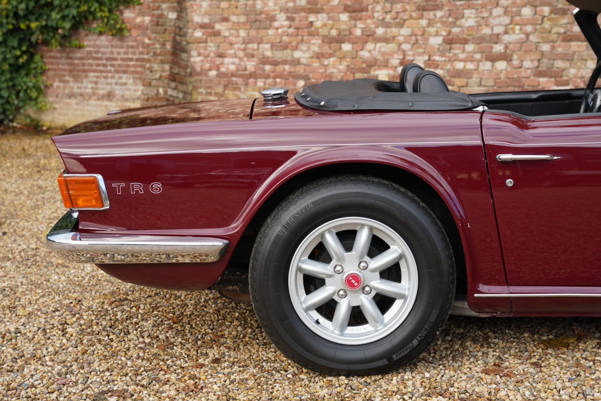 Our stunning Triumph, finished in Damson Red with matching black upholstery, is a very attractive TR6 to behold. It looks sporty yet has a classy appearance, doesn’t it? We’ll let you decide, but let’s agree that the color combination suits it exceptionally well. Moreover, this Triumph has undergone a body-off restoration, and the mechanics have been overhauled by specialists. The engine is equipped with a Kent Cam TH5 Fast Road camshaft with corresponding valve springs. Additionally, various modifications have been made, such as an improved cooling system.