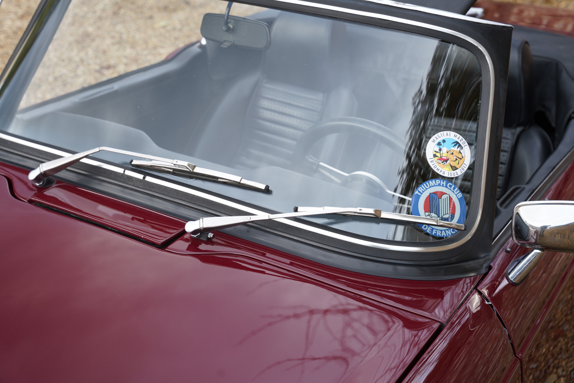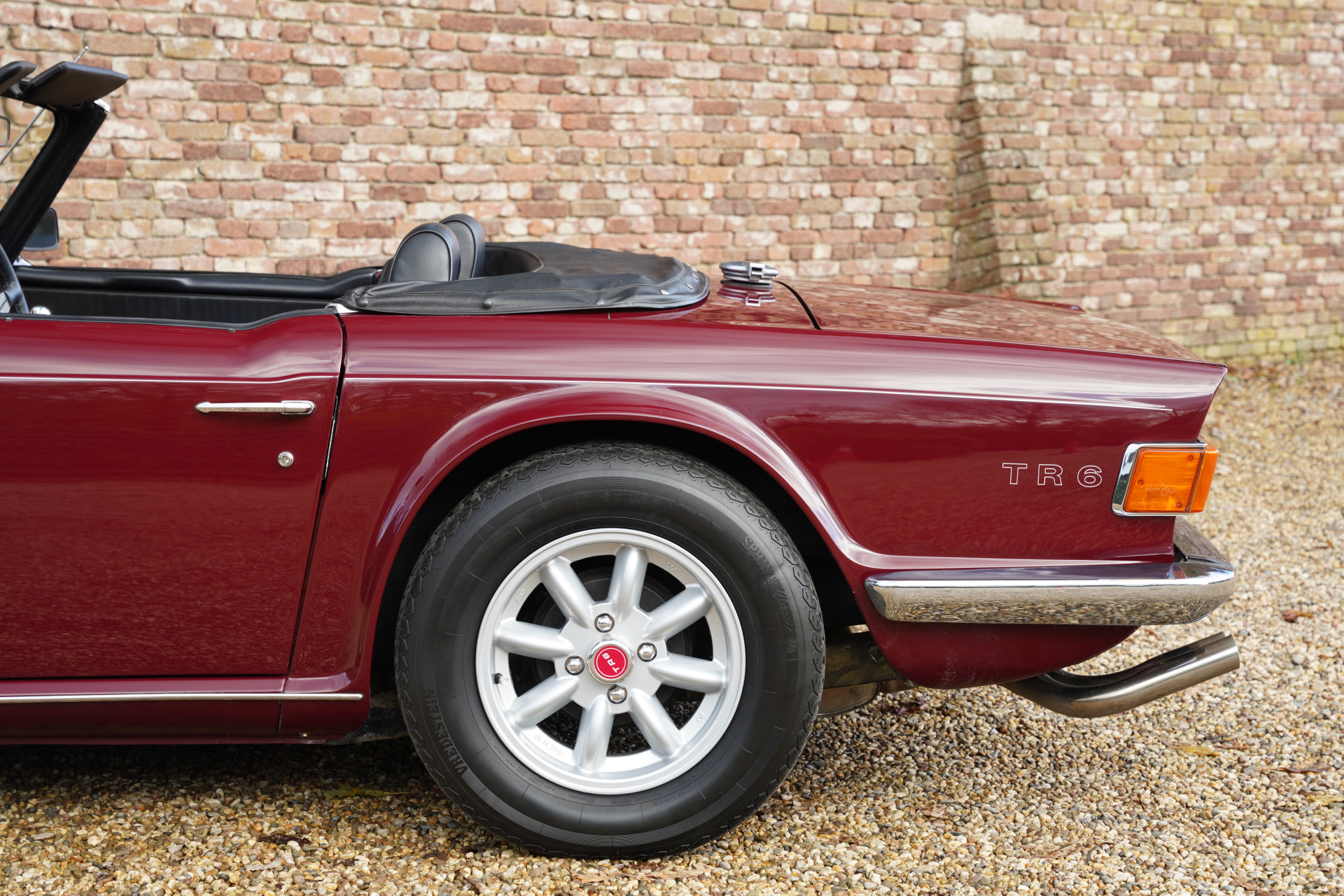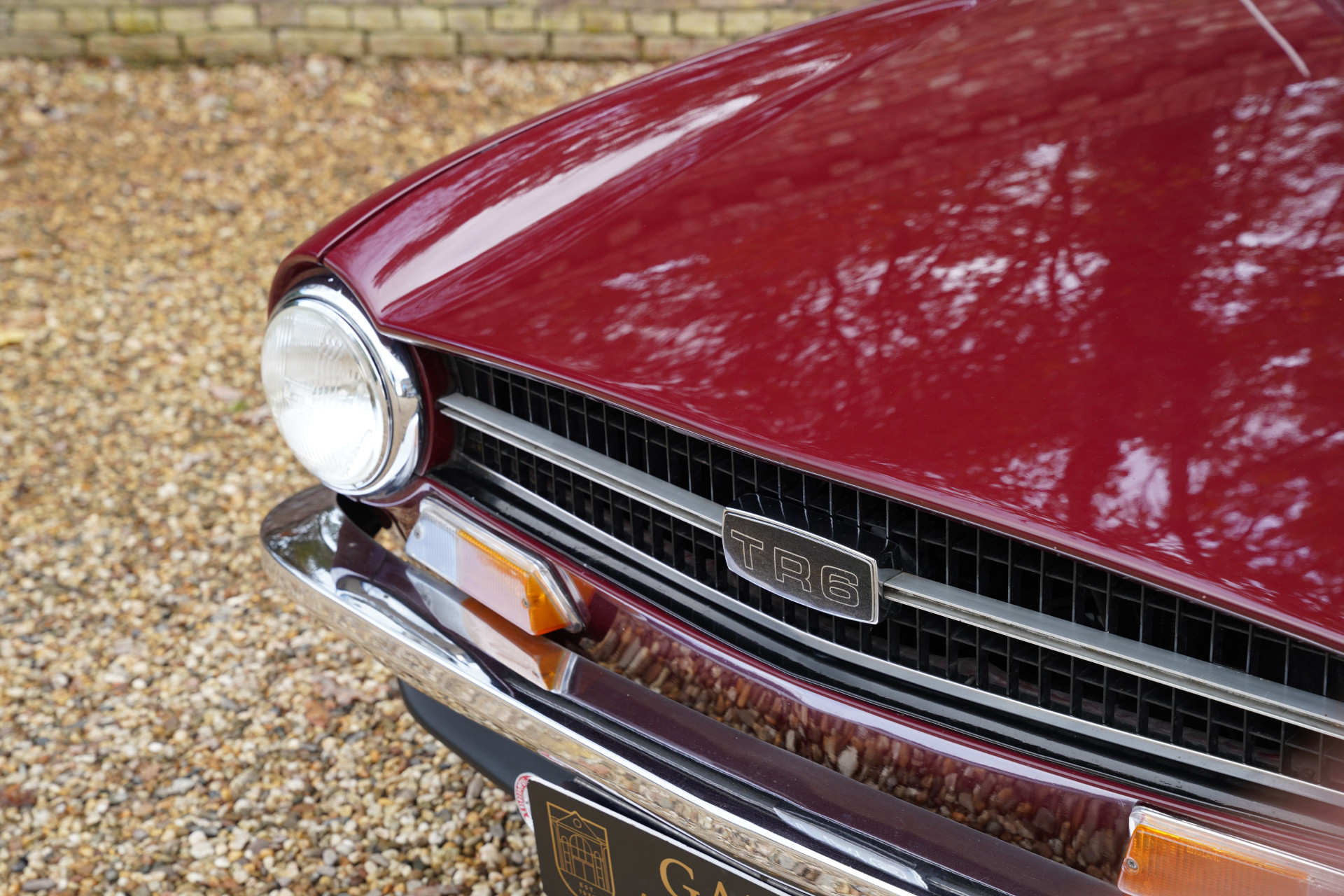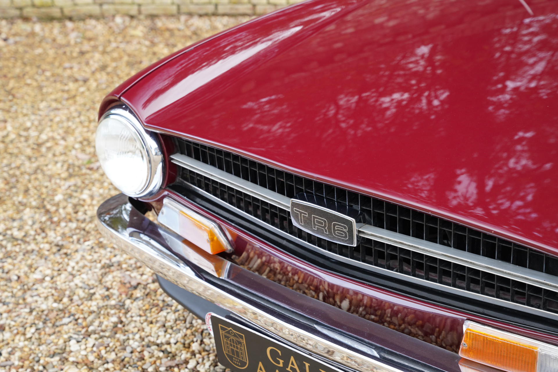 Our stunning Triumph, finished in Damson Red with matching black upholstery, is a very attractive TR6 to behold. It looks sporty yet has a classy appearance, doesn’t it? We’ll let you decide, but let’s agree that the color combination suits it exceptionally well. Moreover, this Triumph has undergone a body-off restoration, and the mechanics have been overhauled by specialists. The engine is equipped with a Kent Cam TH5 Fast Road camshaft with corresponding valve springs. Additionally, various modifications have been made, such as an improved cooling system.