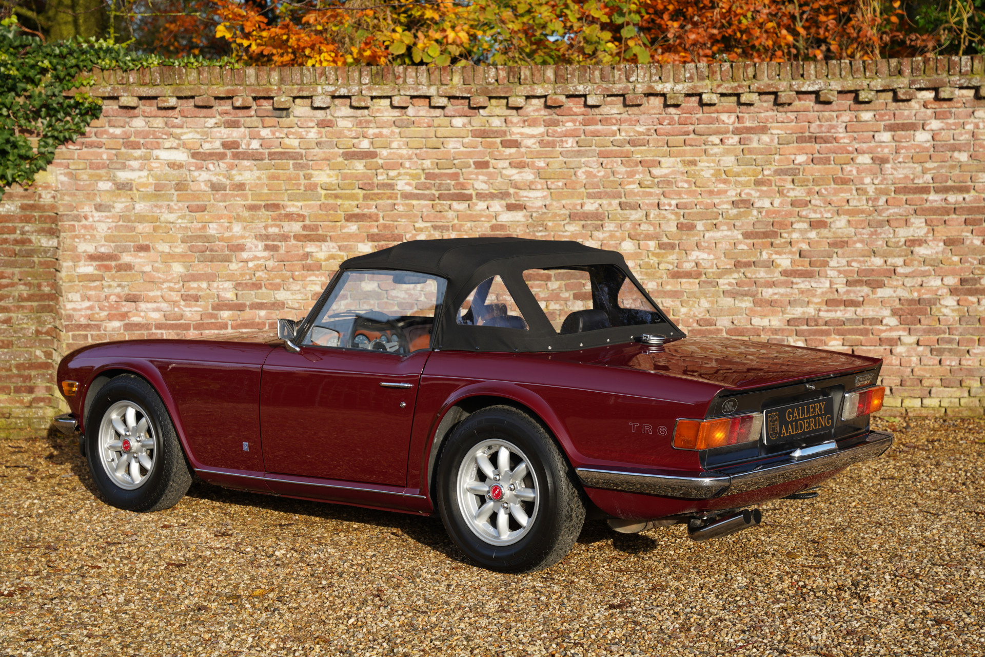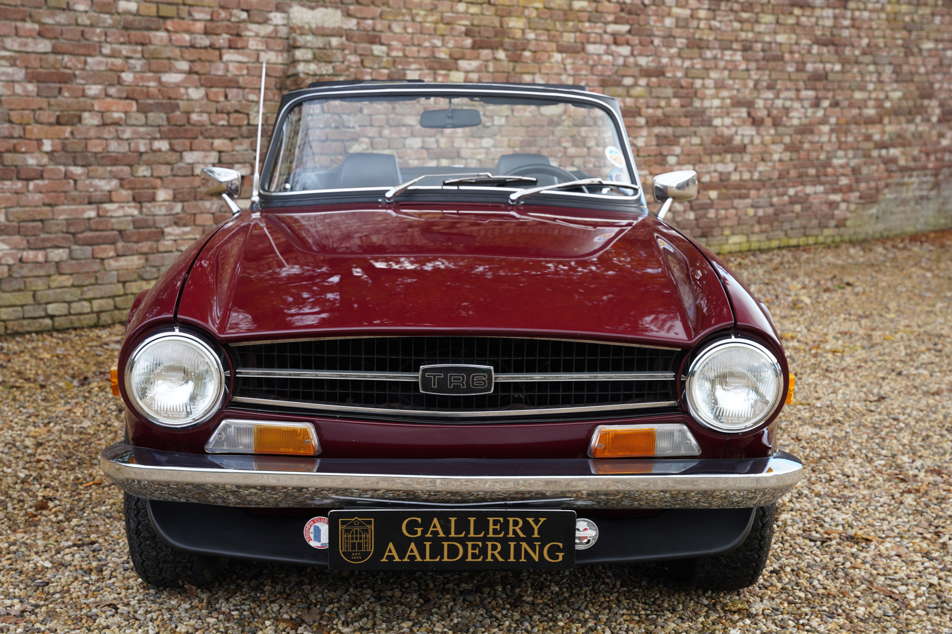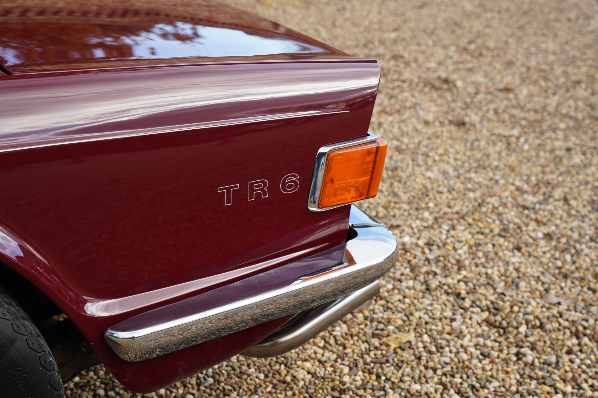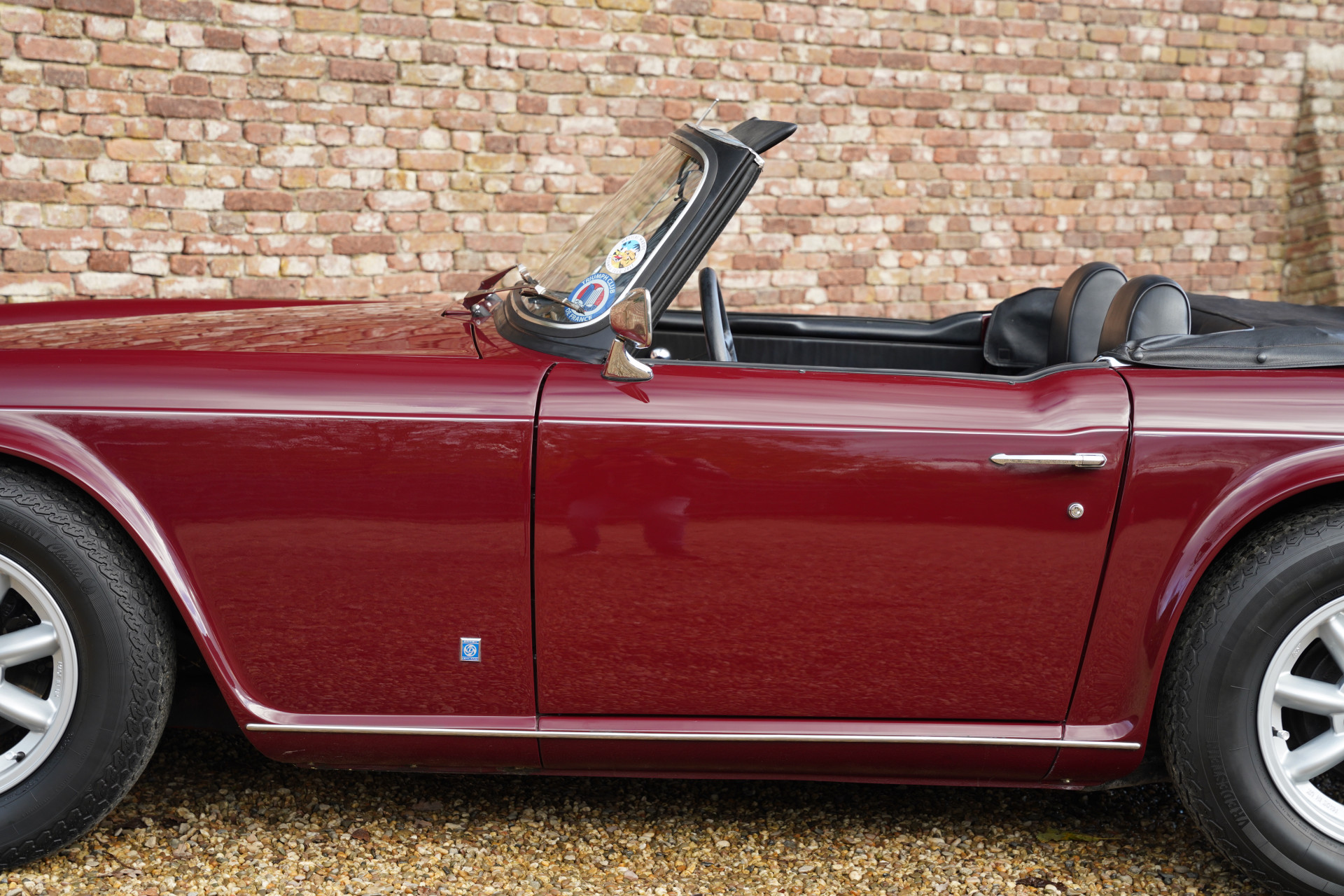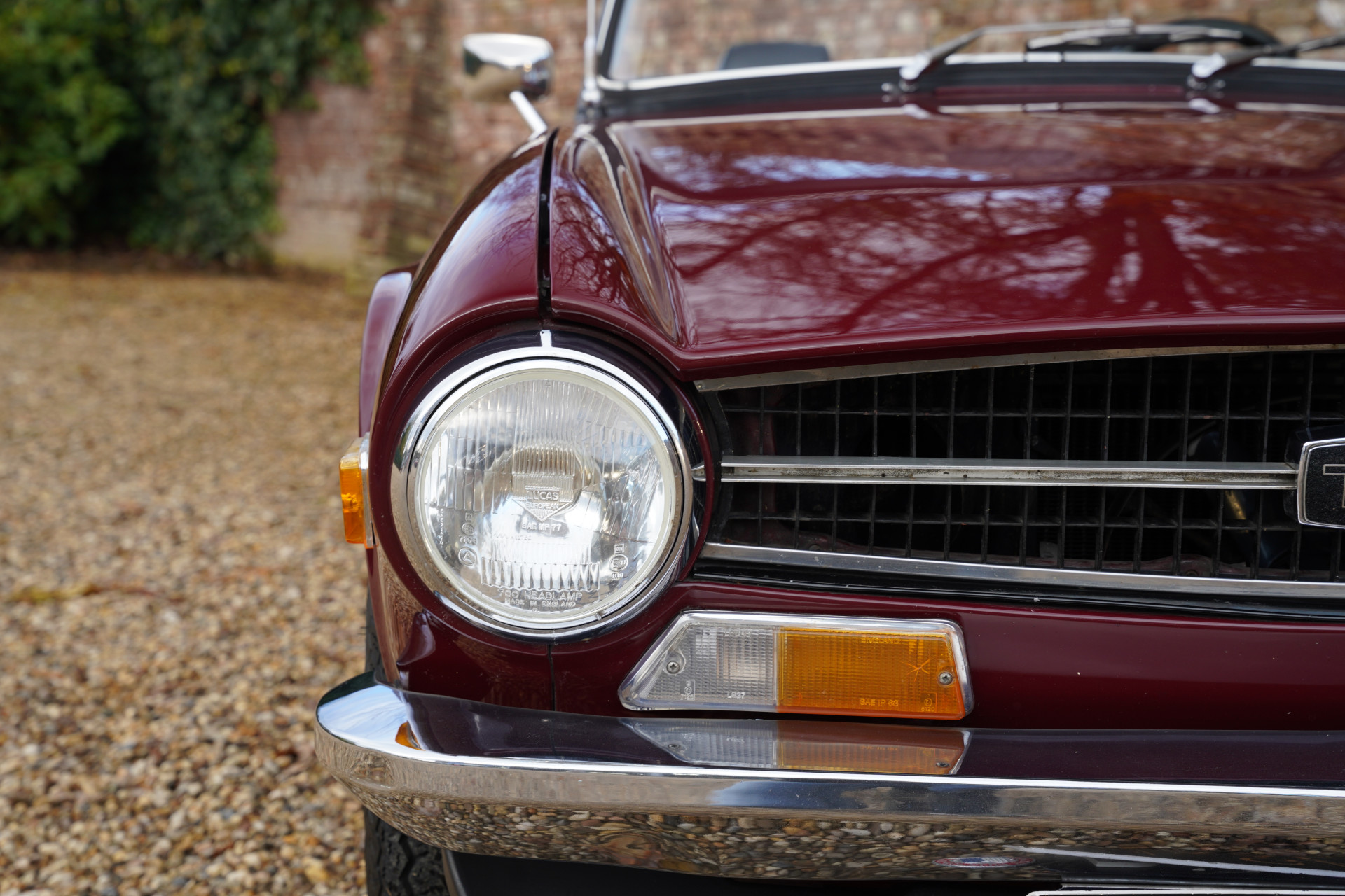 Our stunning Triumph, finished in Damson Red with matching black upholstery, is a very attractive TR6 to behold. It looks sporty yet has a classy appearance, doesn’t it? We’ll let you decide, but let’s agree that the color combination suits it exceptionally well. Moreover, this Triumph has undergone a body-off restoration, and the mechanics have been overhauled by specialists. The engine is equipped with a Kent Cam TH5 Fast Road camshaft with corresponding valve springs. Additionally, various modifications have been made, such as an improved cooling system.