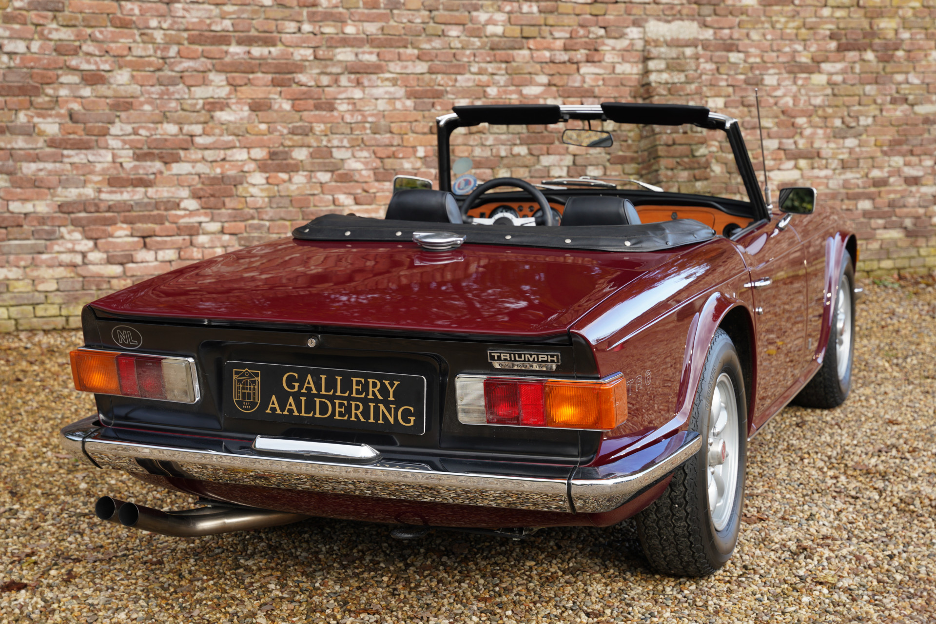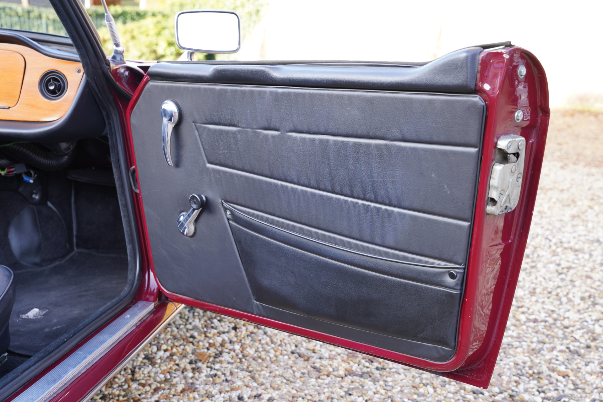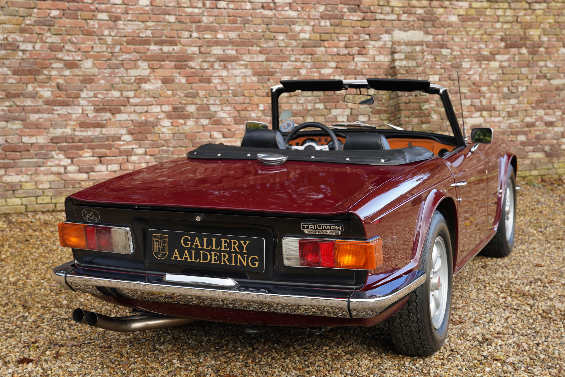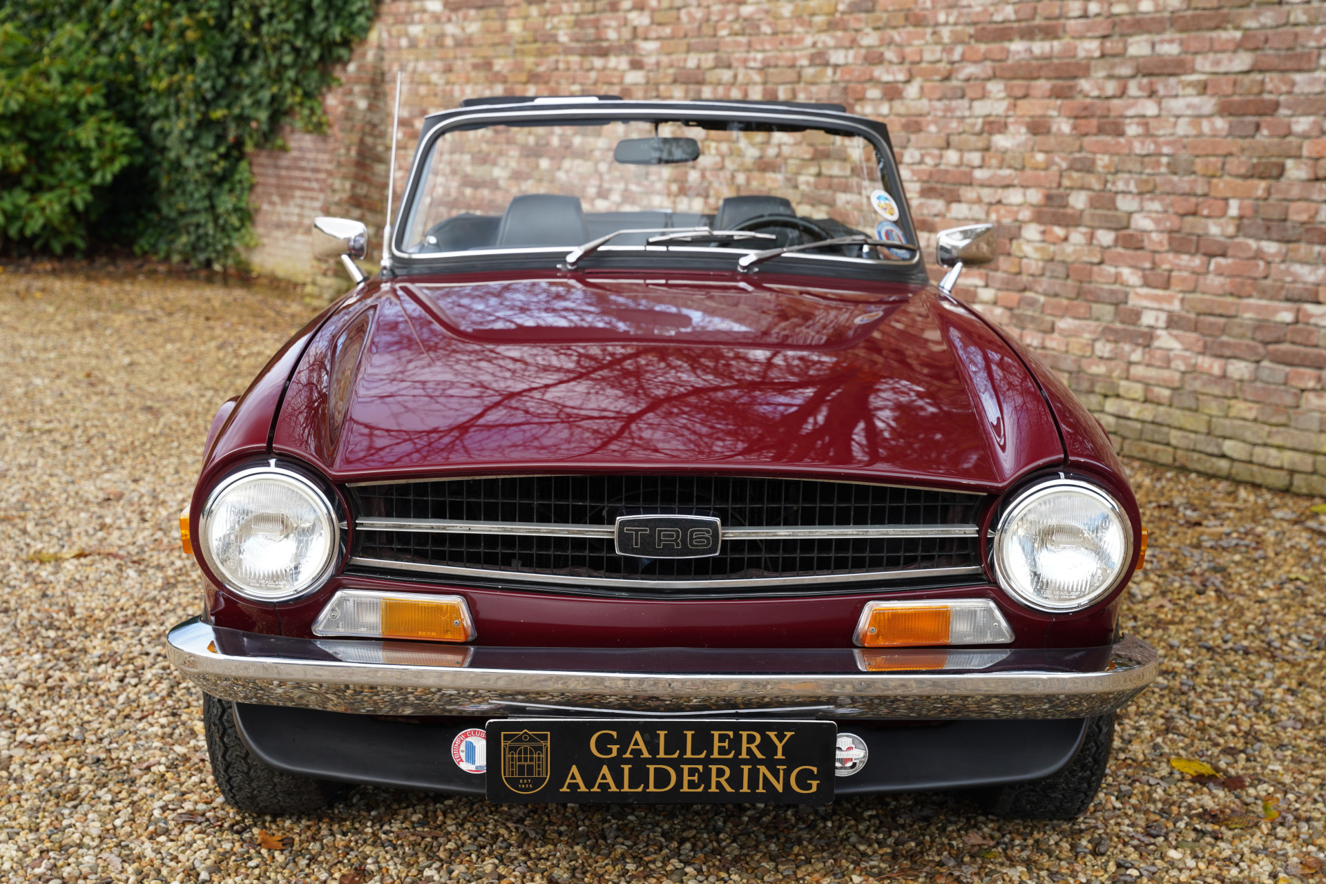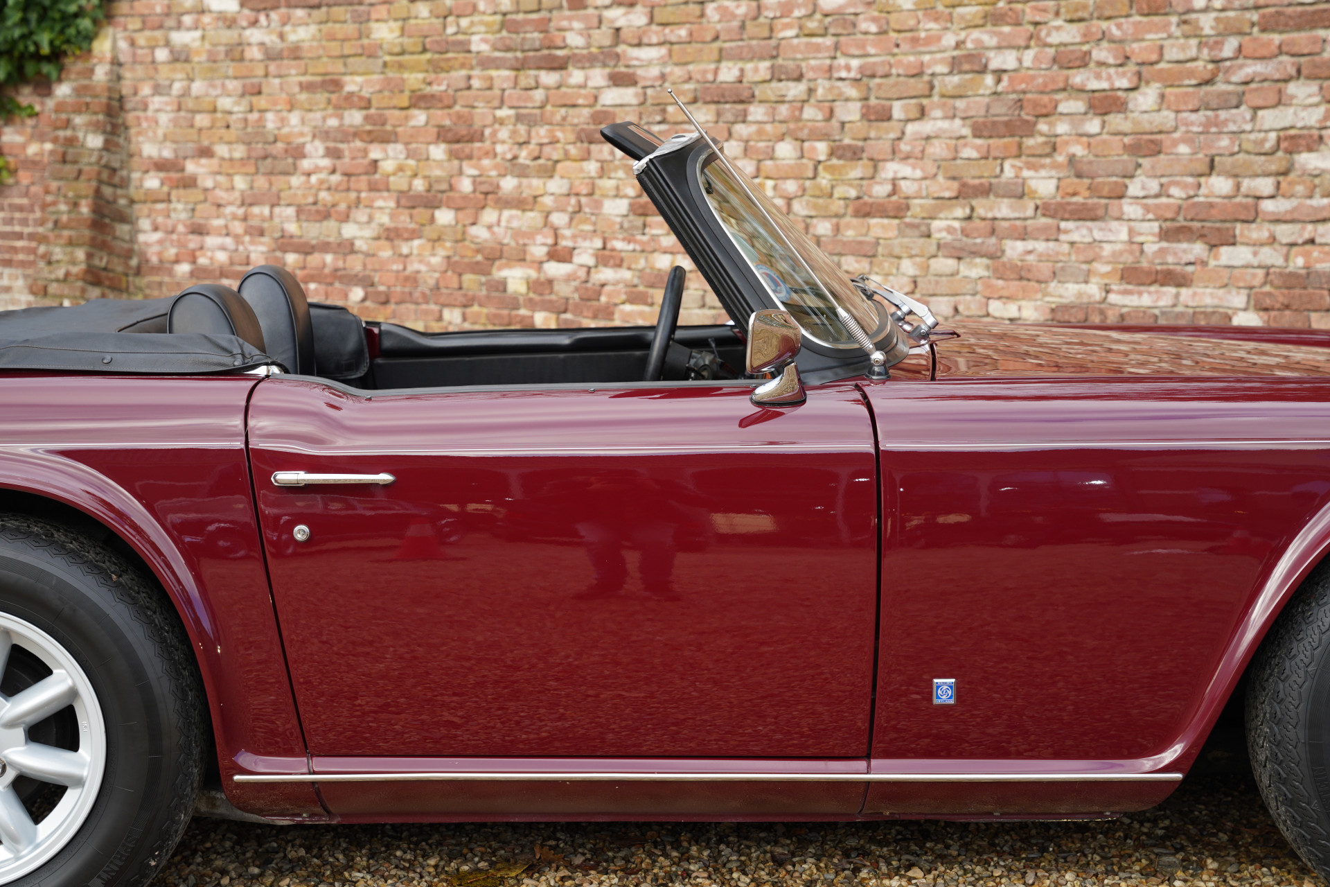 Our stunning Triumph, finished in Damson Red with matching black upholstery, is a very attractive TR6 to behold. It looks sporty yet has a classy appearance, doesn’t it? We’ll let you decide, but let’s agree that the color combination suits it exceptionally well. Moreover, this Triumph has undergone a body-off restoration, and the mechanics have been overhauled by specialists. The engine is equipped with a Kent Cam TH5 Fast Road camshaft with corresponding valve springs. Additionally, various modifications have been made, such as an improved cooling system.