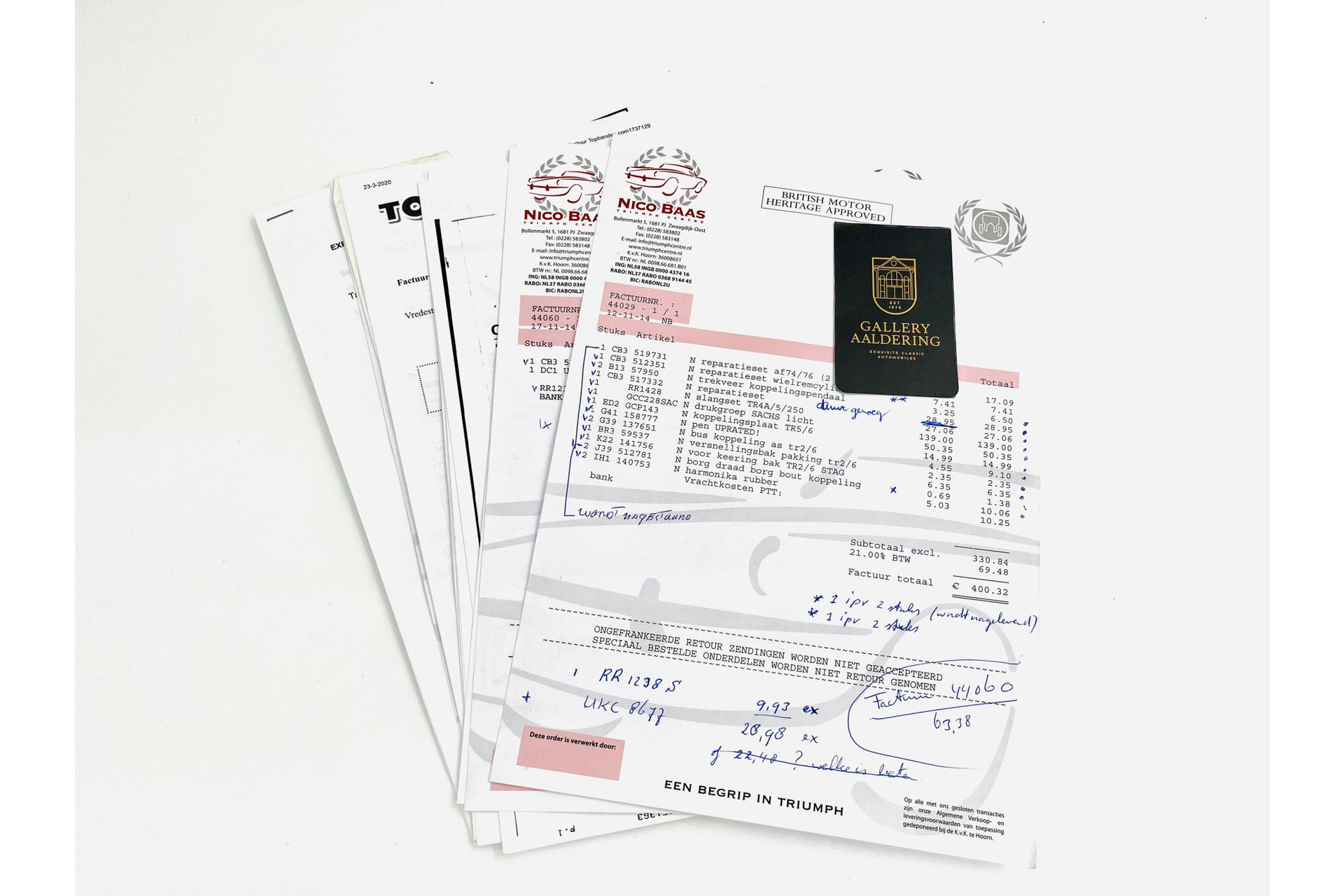 Een van de hoogtepunten, naast de zeer goede staat van deze Triumph, is de grote hoeveelheid documentatie die aanwezig is. De recente facturen gaan ver terug het verleden in, waardoor u een uitstekend overzicht hebt van de werkzaamheden die aan deze Triumph verricht werden. Ook zijn de diverse restauratiewerkzaamheden tot in detail omschreven door de vorige eigenaar. Dit is hele waardevolle informatie en het enthousiasme straalt van de documentatie af.