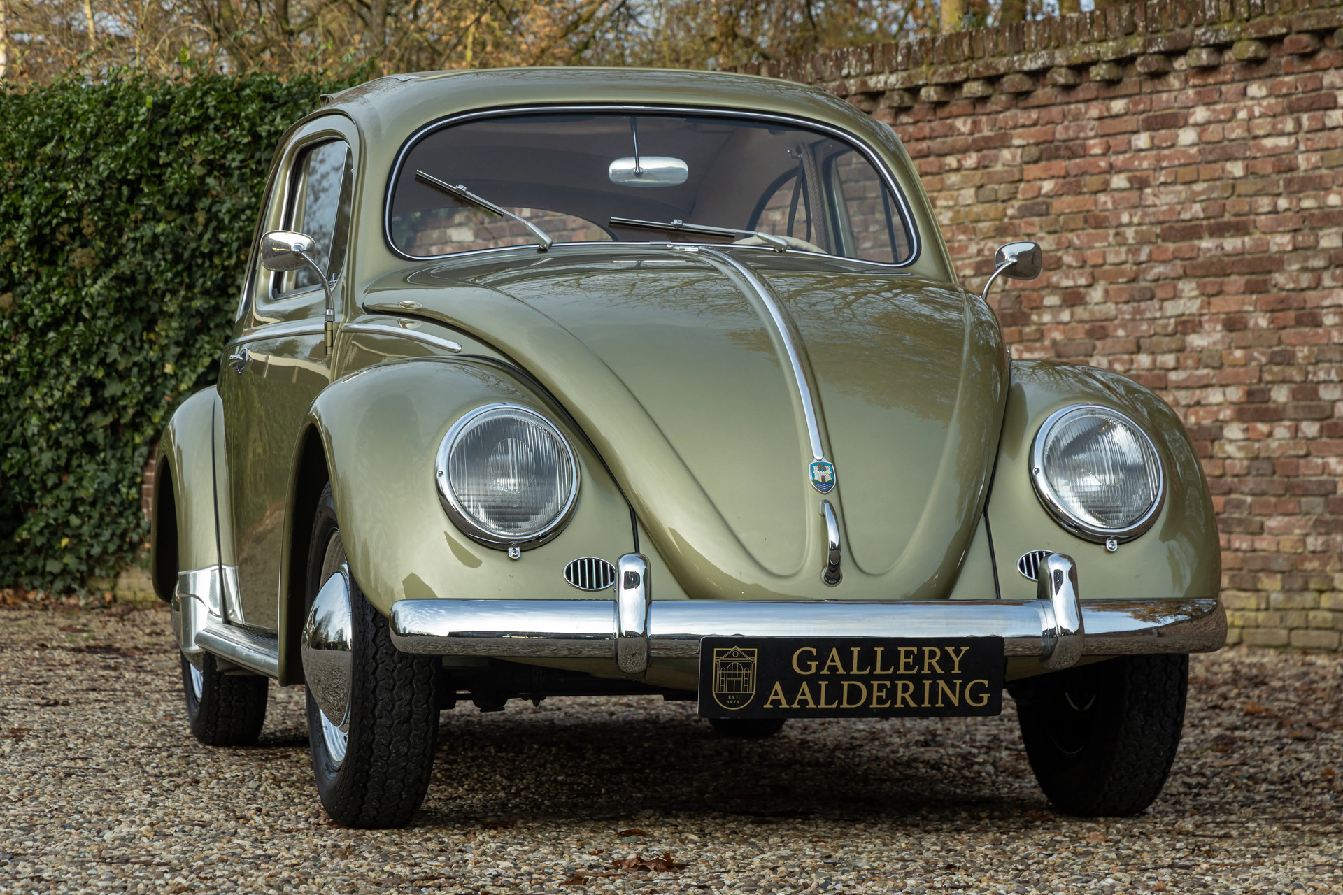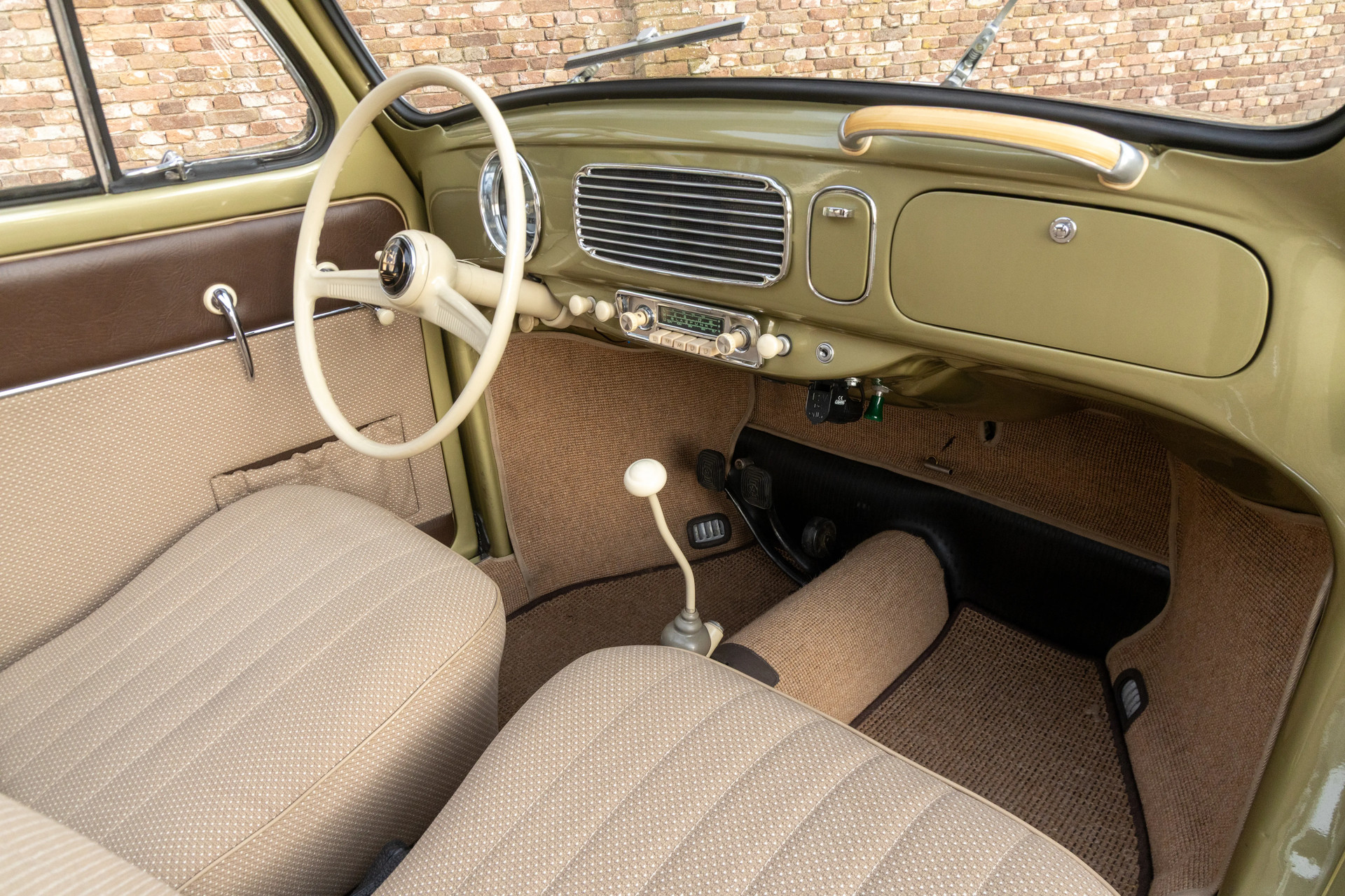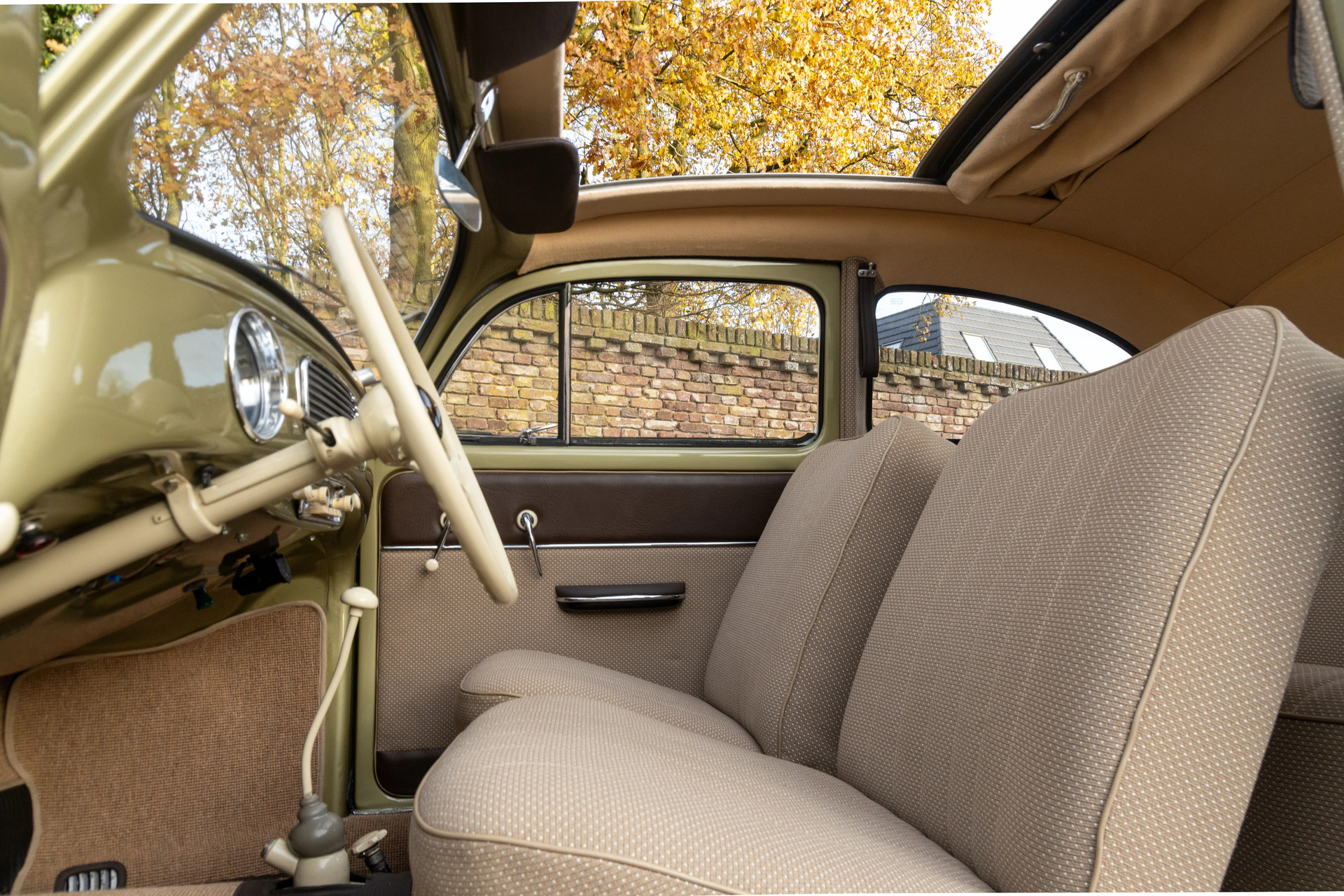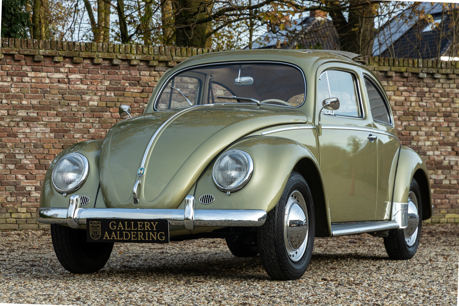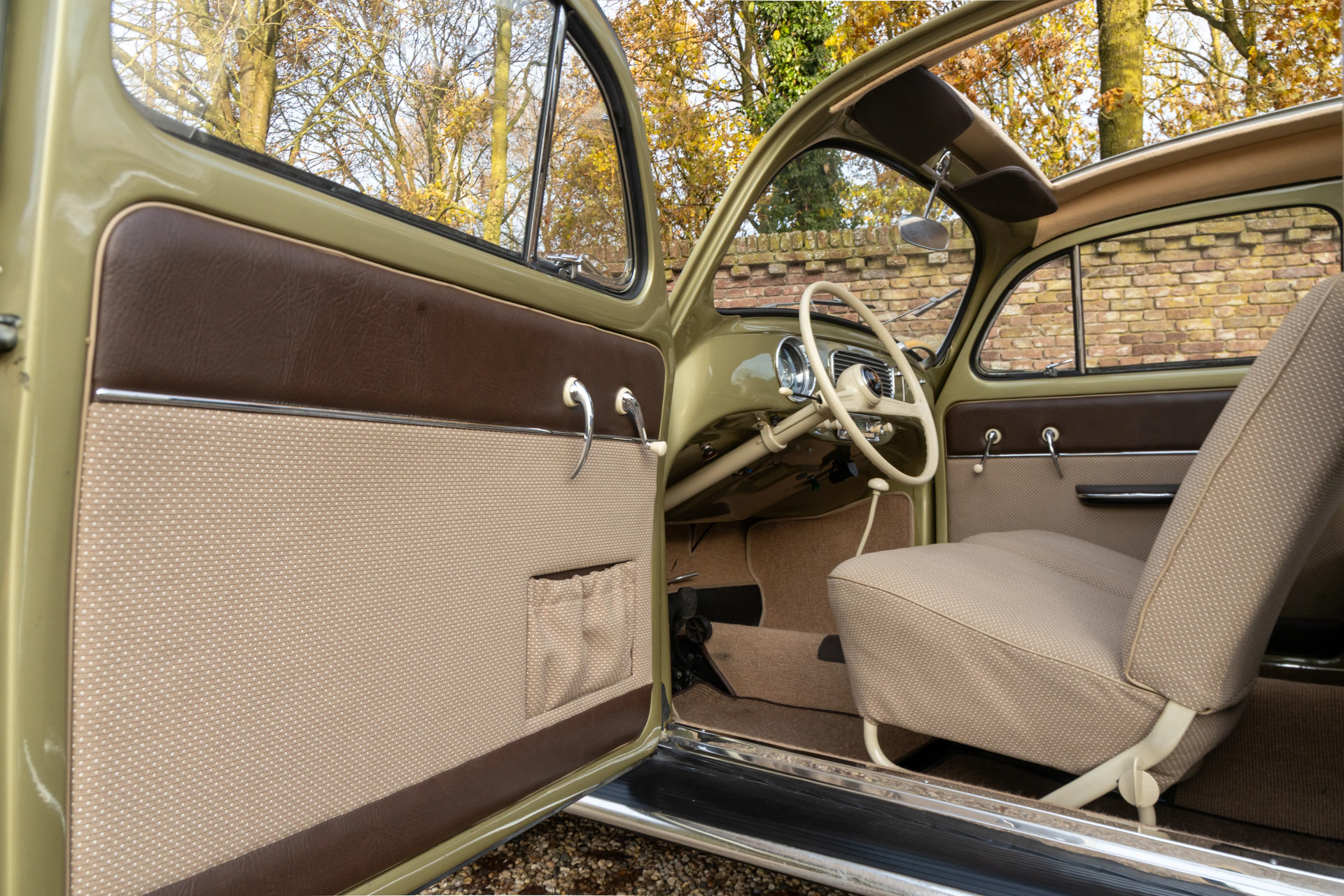 Some classic cars make you smile the moment you see them. This 1956 Beetle belongs unmistakably to that category. The elegant Oval Ragtop, finished in the timeless shade of Diamant Grün with a warm beige-brown cloth interior, has that irresistible presence that sets the finest classics apart. It doesn’t try to impress; it simply does.