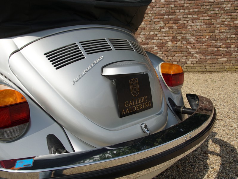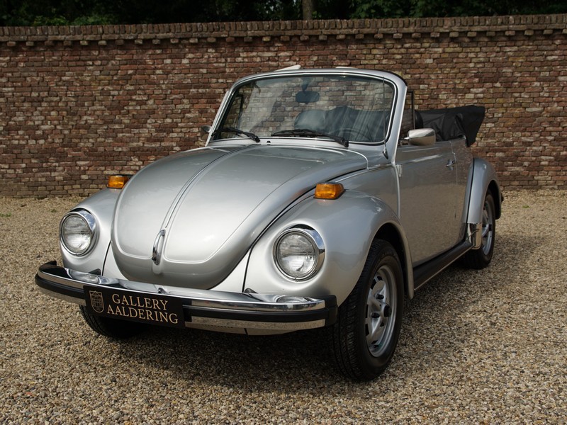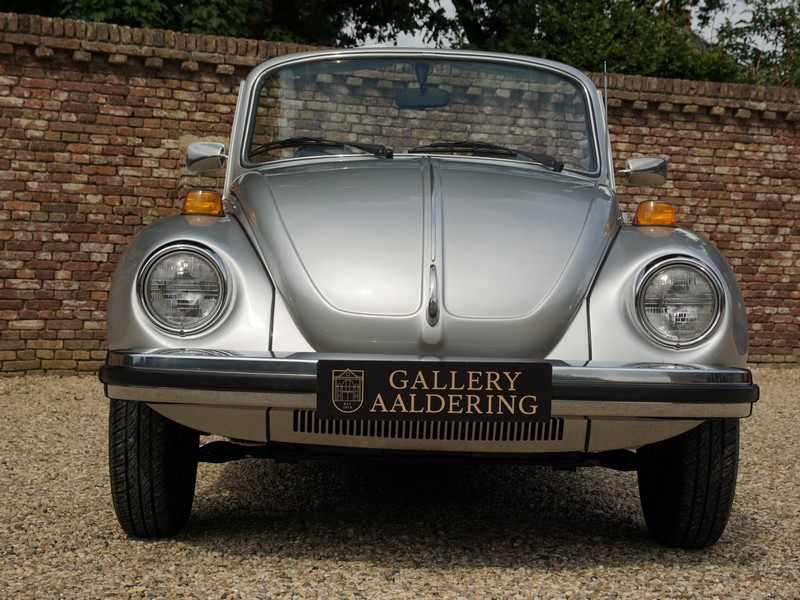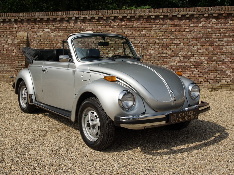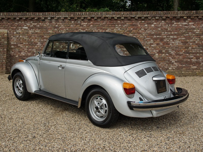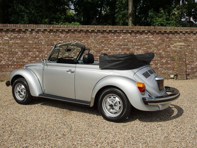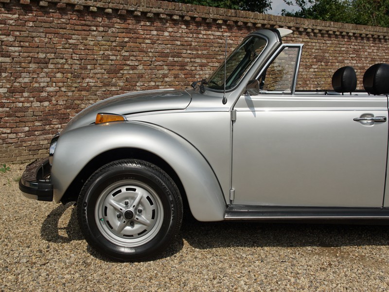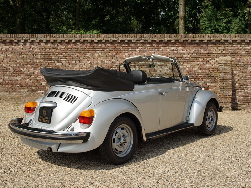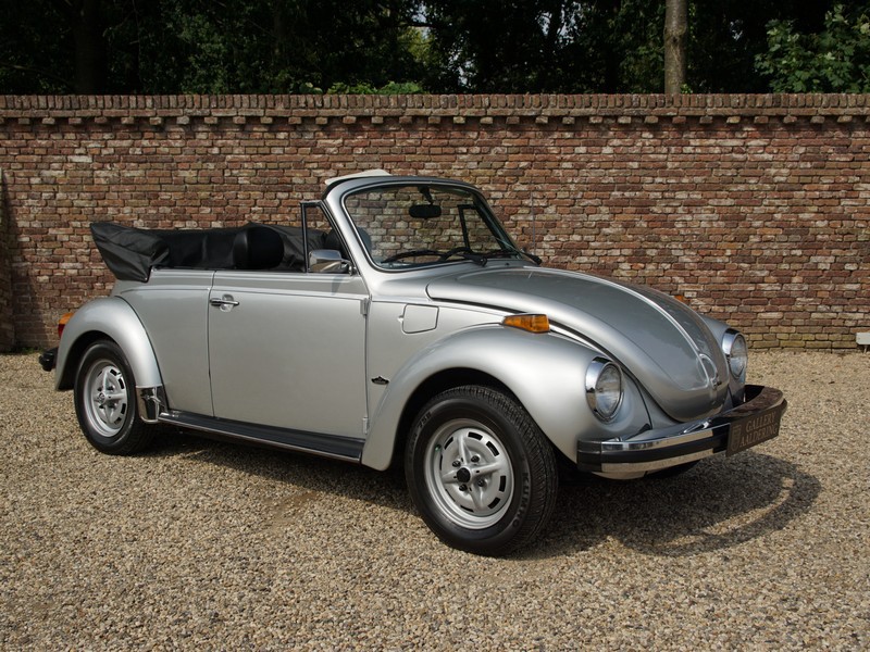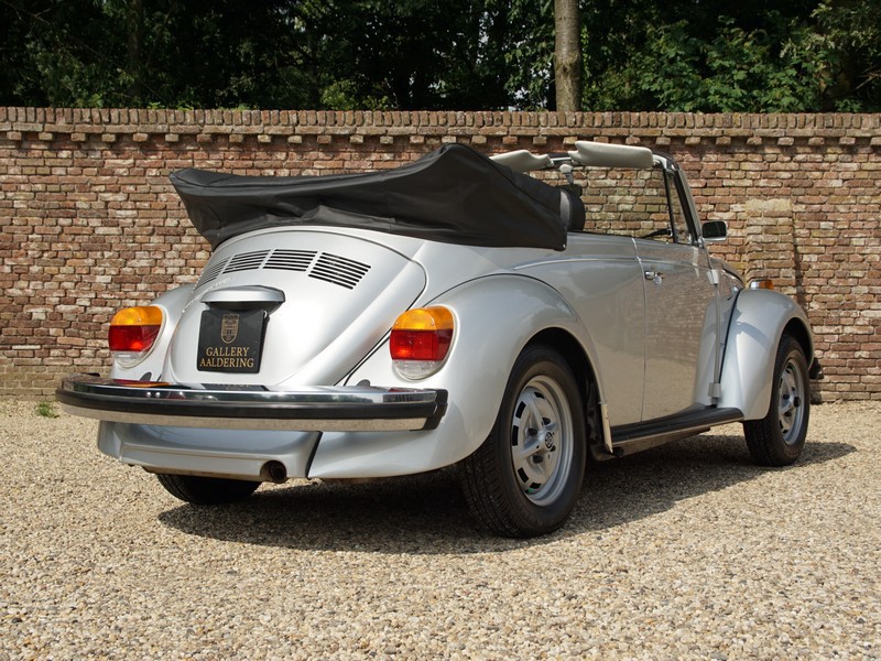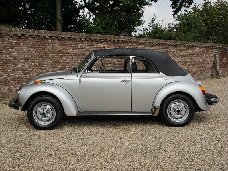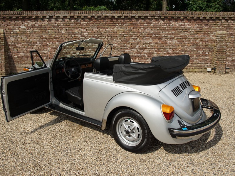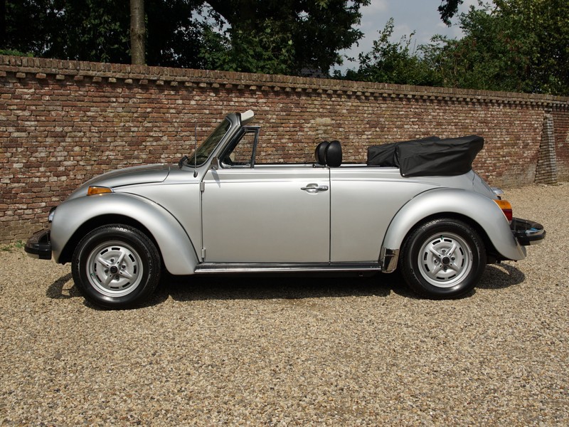 Super originele Volkswagen Kever cabriolet van bouwjaar 1979. Deze prachtige Beetle is op 25 januari 1980 nieuw geleverd door Volkswagen dealer Jim McDonald in Lincoln, Nebraska, USA en heeft vandaag de dag slechts 19.037 miles gereden. De auto verkeert in een bijzonder originele staat en is nooit gerestaureerd. De carrosserie is prachtig, heeft goede passingen en zeer mooi lakwerk. De onderzijde is als nieuw, nooit aan gelast en is volledig vrij van roest. Technisch uitstekend en in een perfect werkende en rijdende conditie verkerend. Uitgevoerd in de originele kleurstelling ‘Silver’ in combinatie met een zwart skai interieur en bijpassende soft-top. Voorzien van correcte injectie motor. De Kever is gedocumenteerd met haar originele service en instructieboekje.