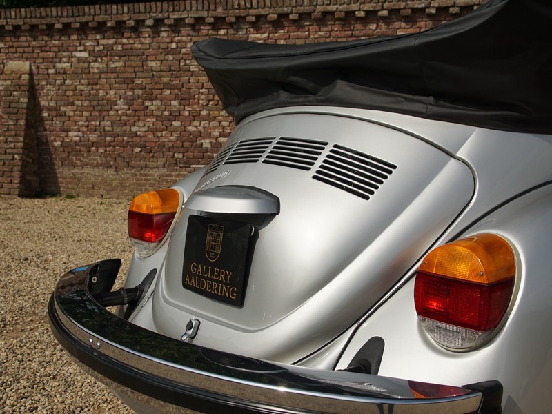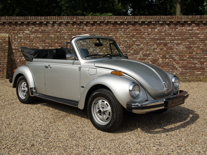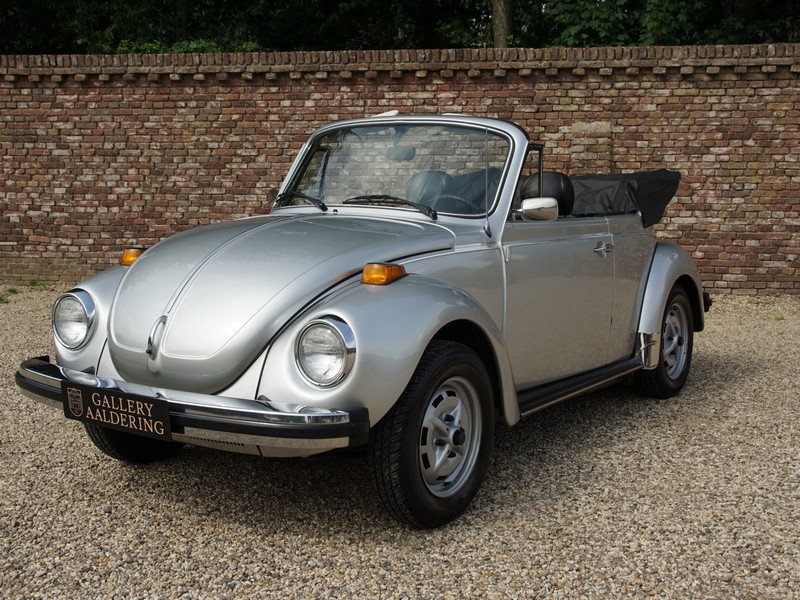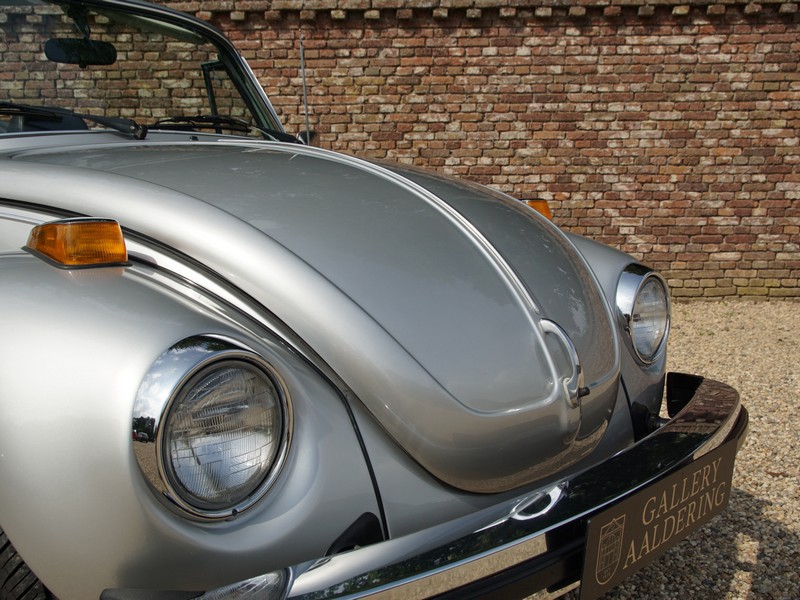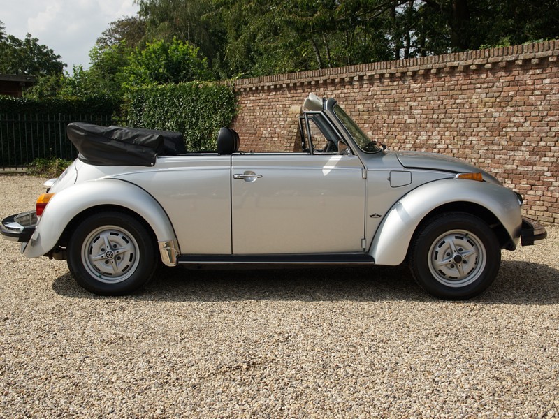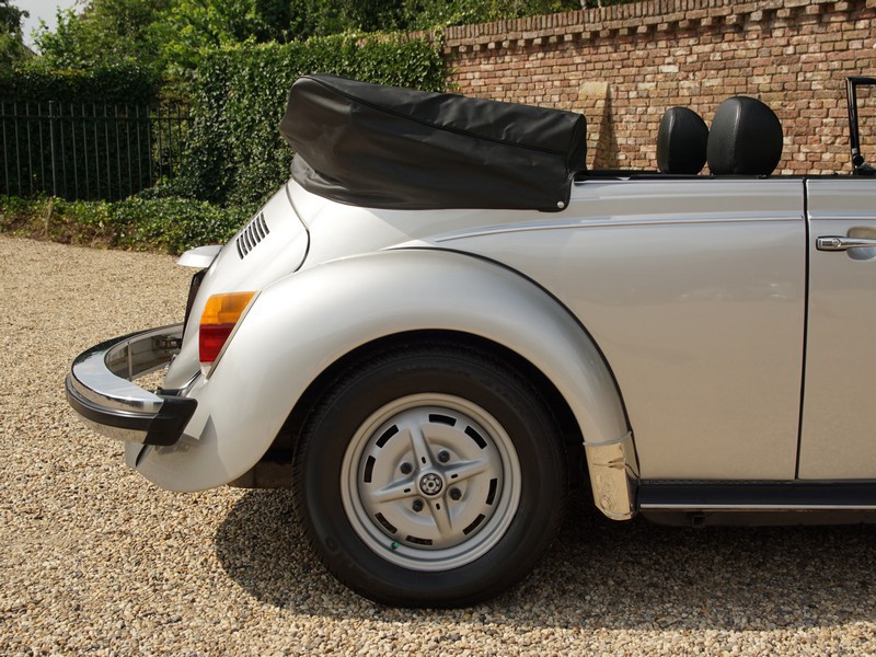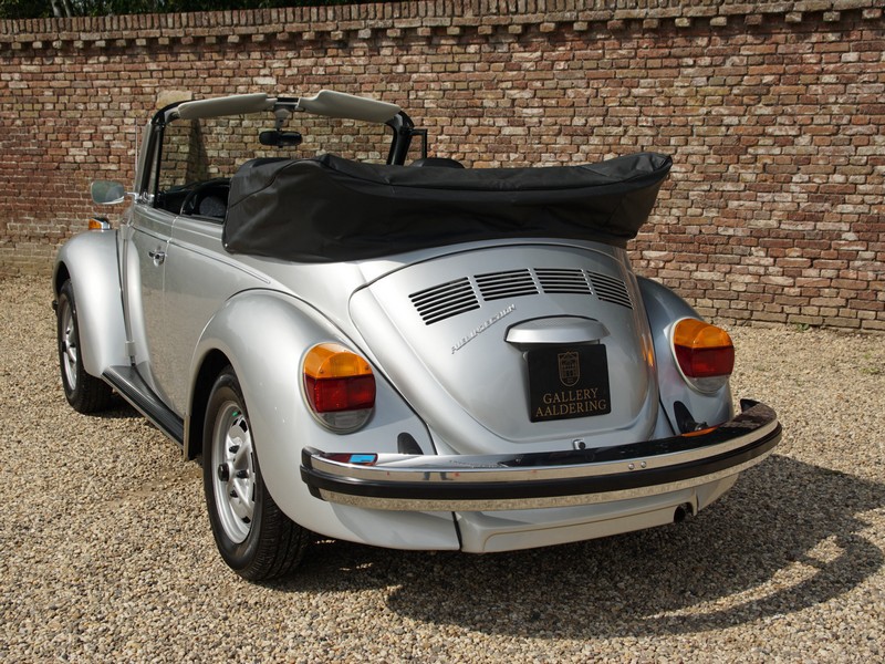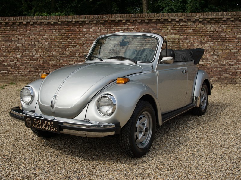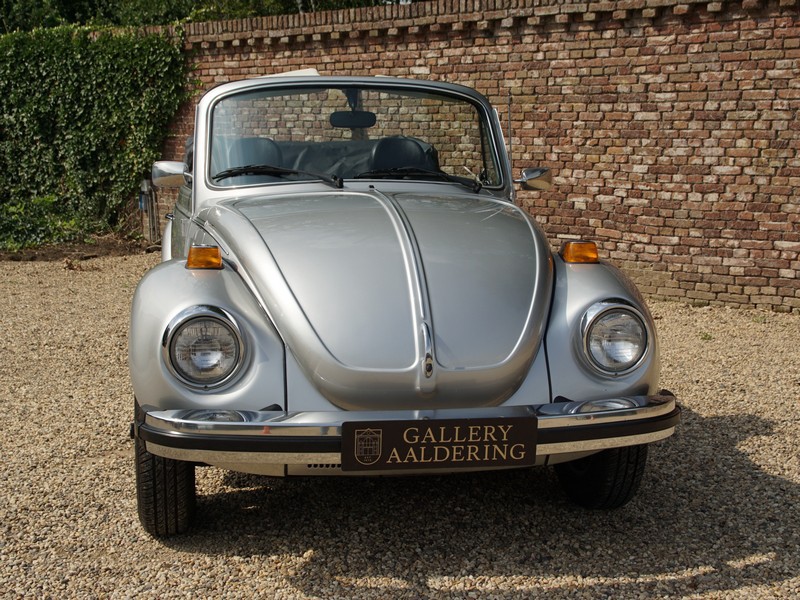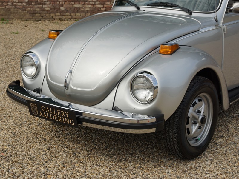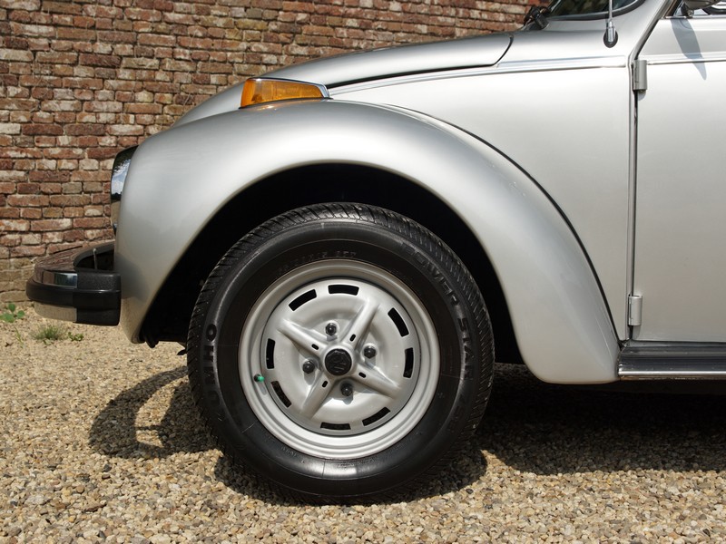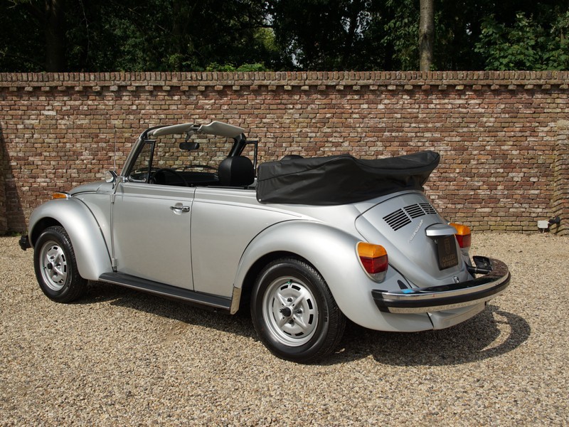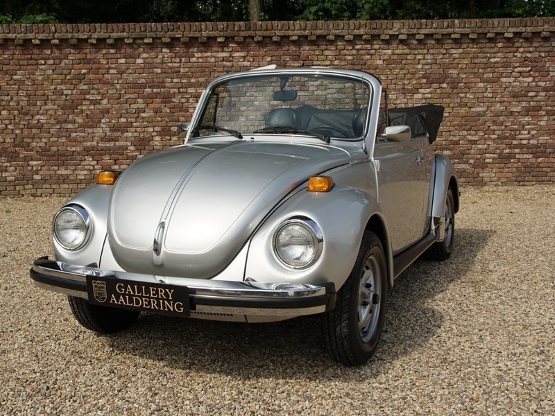 Super originele Volkswagen Kever cabriolet van bouwjaar 1979. Deze prachtige Beetle is op 25 januari 1980 nieuw geleverd door Volkswagen dealer Jim McDonald in Lincoln, Nebraska, USA en heeft vandaag de dag slechts 19.037 miles gereden. De auto verkeert in een bijzonder originele staat en is nooit gerestaureerd. De carrosserie is prachtig, heeft goede passingen en zeer mooi lakwerk. De onderzijde is als nieuw, nooit aan gelast en is volledig vrij van roest. Technisch uitstekend en in een perfect werkende en rijdende conditie verkerend. Uitgevoerd in de originele kleurstelling ‘Silver’ in combinatie met een zwart skai interieur en bijpassende soft-top. Voorzien van correcte injectie motor. De Kever is gedocumenteerd met haar originele service en instructieboekje.