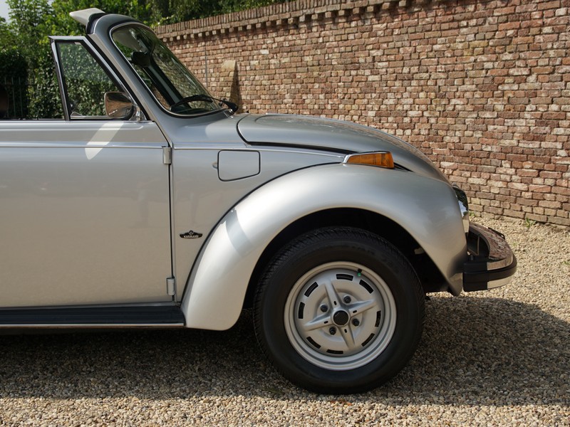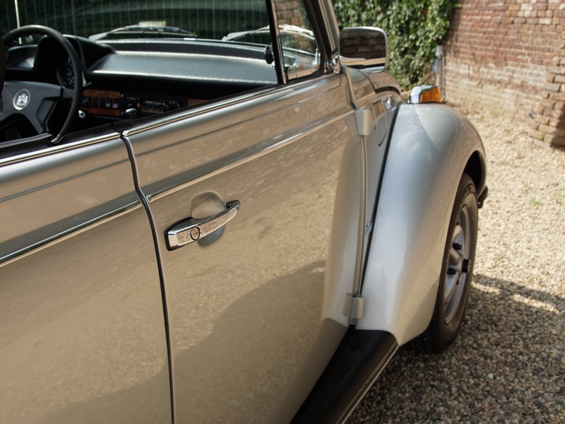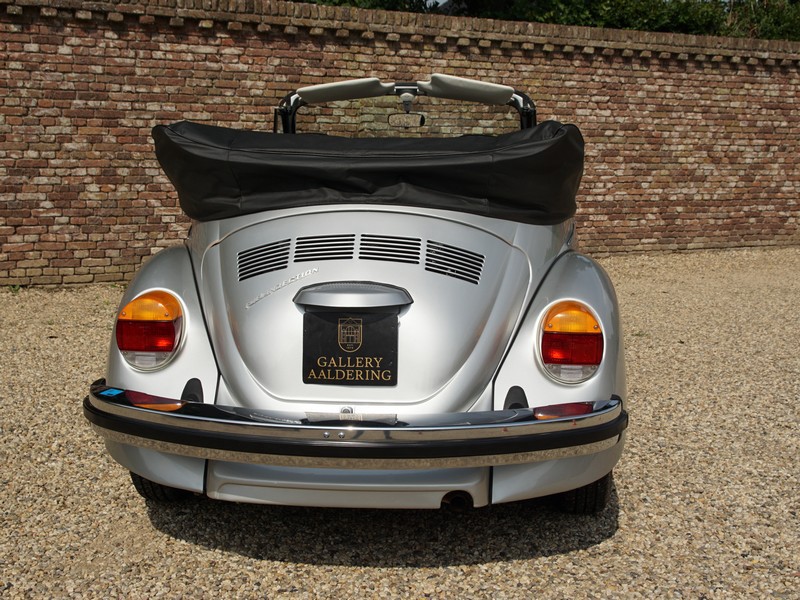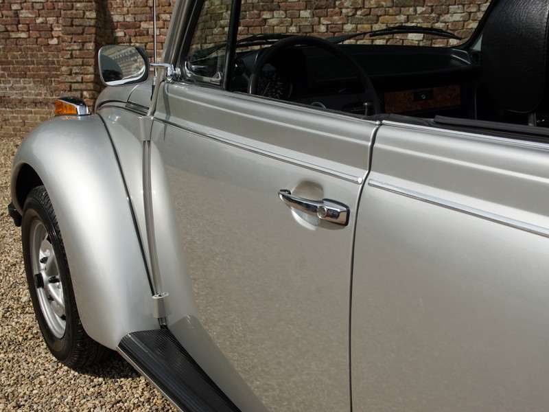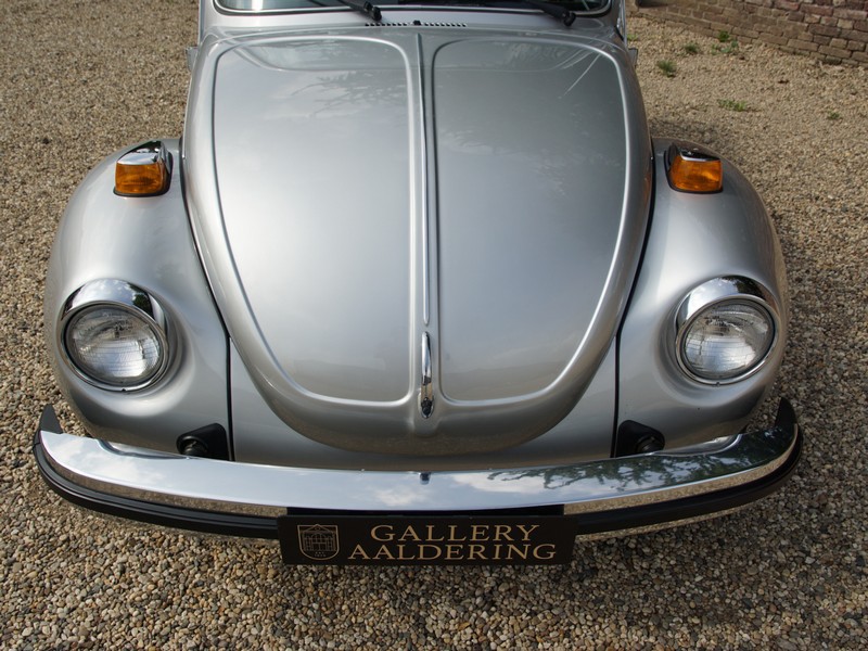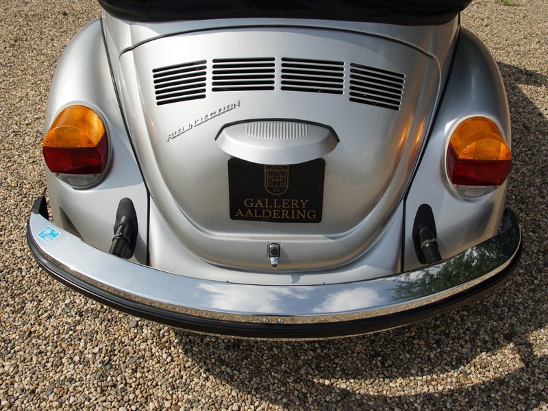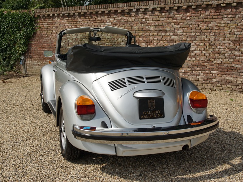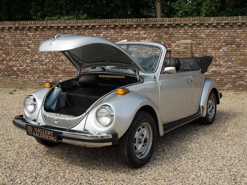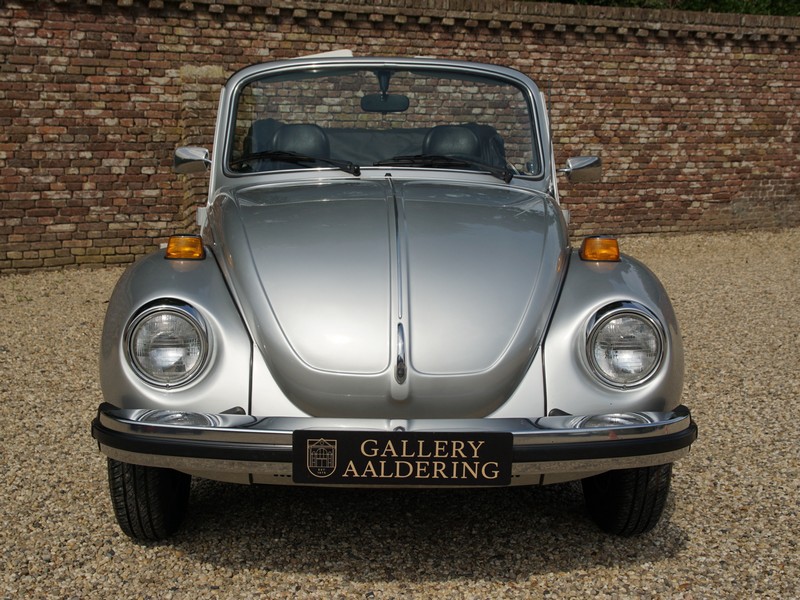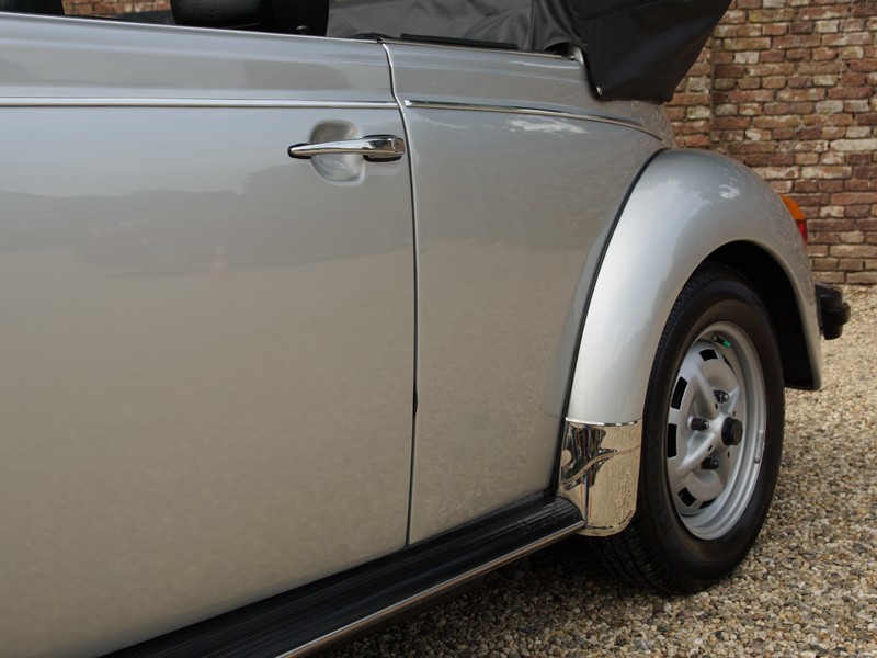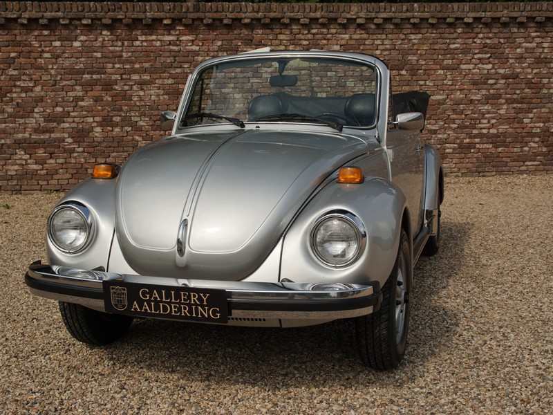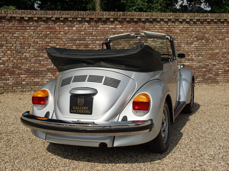 Super originele Volkswagen Kever cabriolet van bouwjaar 1979. Deze prachtige Beetle is op 25 januari 1980 nieuw geleverd door Volkswagen dealer Jim McDonald in Lincoln, Nebraska, USA en heeft vandaag de dag slechts 19.037 miles gereden. De auto verkeert in een bijzonder originele staat en is nooit gerestaureerd. De carrosserie is prachtig, heeft goede passingen en zeer mooi lakwerk. De onderzijde is als nieuw, nooit aan gelast en is volledig vrij van roest. Technisch uitstekend en in een perfect werkende en rijdende conditie verkerend. Uitgevoerd in de originele kleurstelling ‘Silver’ in combinatie met een zwart skai interieur en bijpassende soft-top. Voorzien van correcte injectie motor. De Kever is gedocumenteerd met haar originele service en instructieboekje.