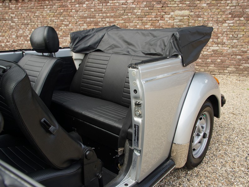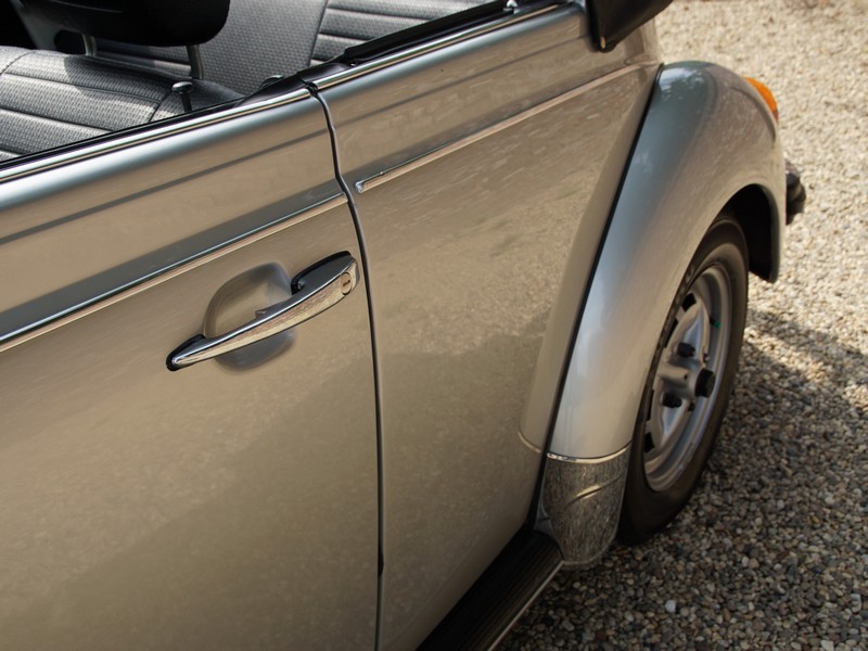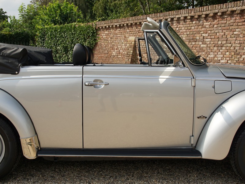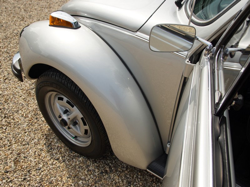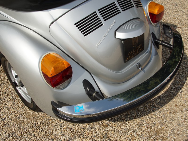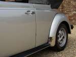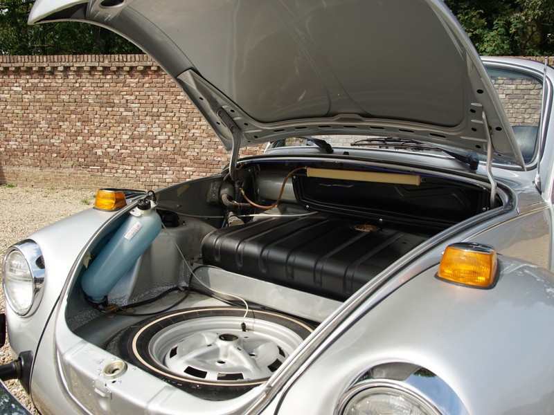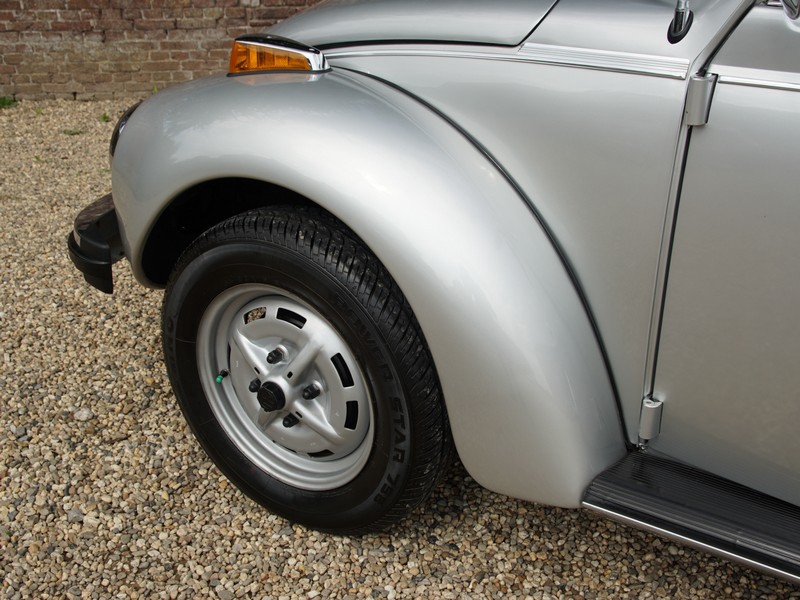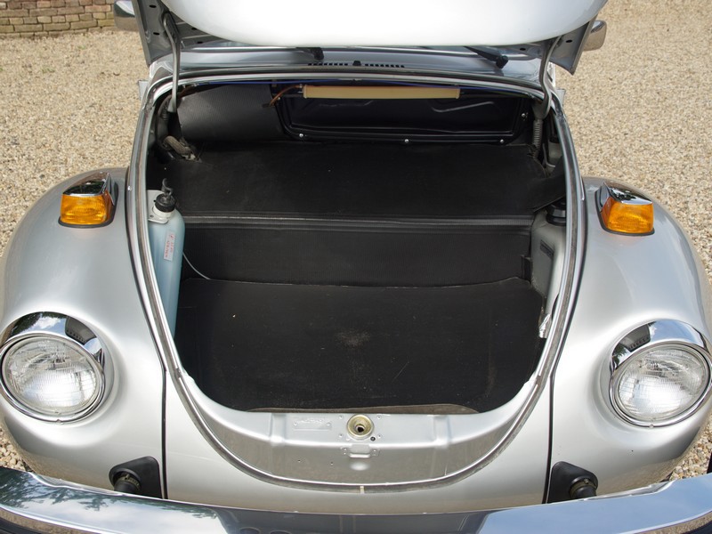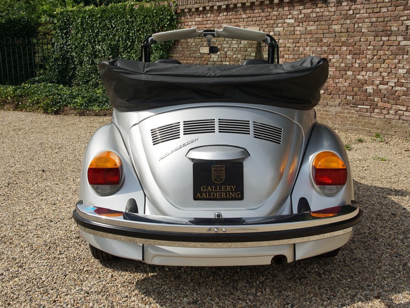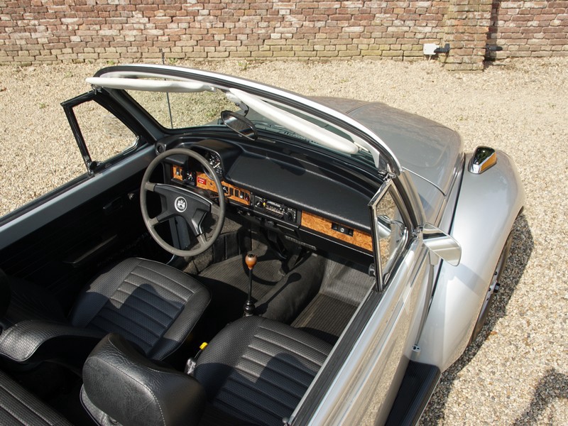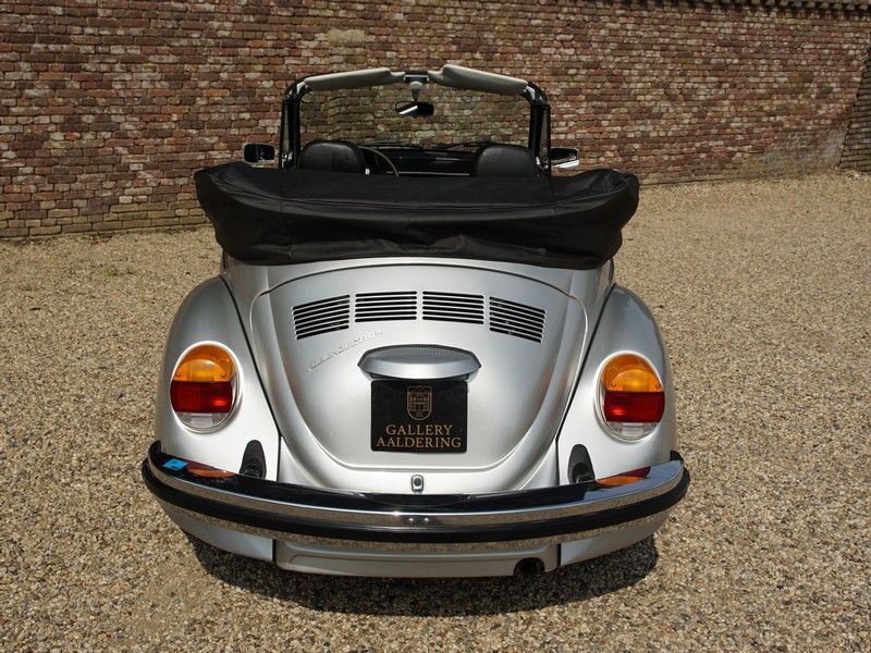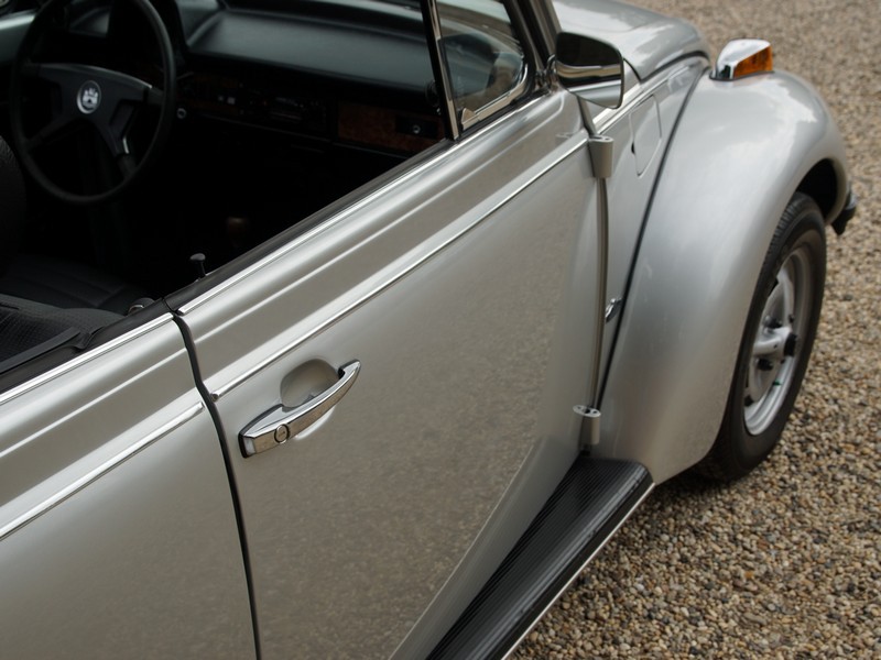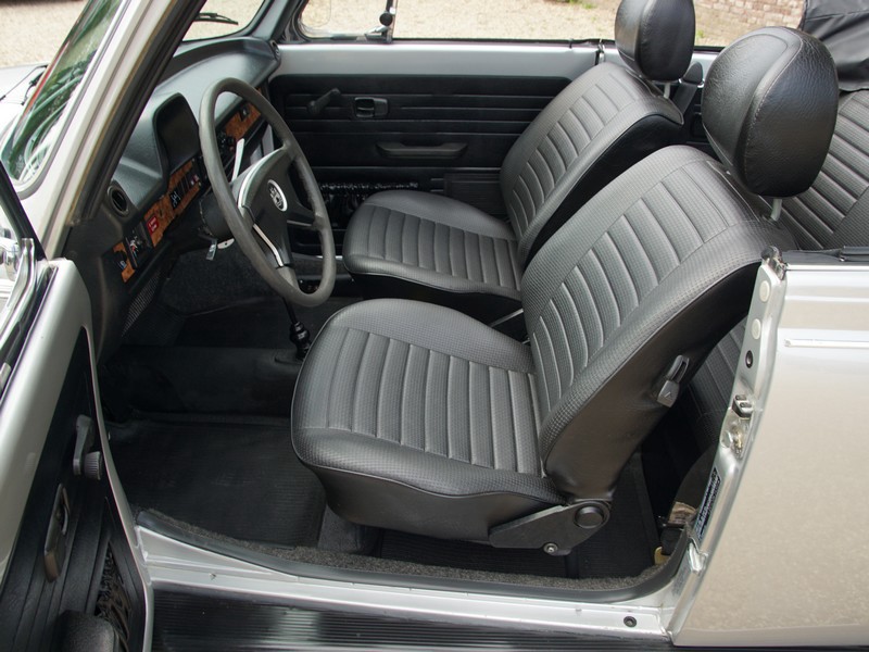 Super originele Volkswagen Kever cabriolet van bouwjaar 1979. Deze prachtige Beetle is op 25 januari 1980 nieuw geleverd door Volkswagen dealer Jim McDonald in Lincoln, Nebraska, USA en heeft vandaag de dag slechts 19.037 miles gereden. De auto verkeert in een bijzonder originele staat en is nooit gerestaureerd. De carrosserie is prachtig, heeft goede passingen en zeer mooi lakwerk. De onderzijde is als nieuw, nooit aan gelast en is volledig vrij van roest. Technisch uitstekend en in een perfect werkende en rijdende conditie verkerend. Uitgevoerd in de originele kleurstelling ‘Silver’ in combinatie met een zwart skai interieur en bijpassende soft-top. Voorzien van correcte injectie motor. De Kever is gedocumenteerd met haar originele service en instructieboekje.
