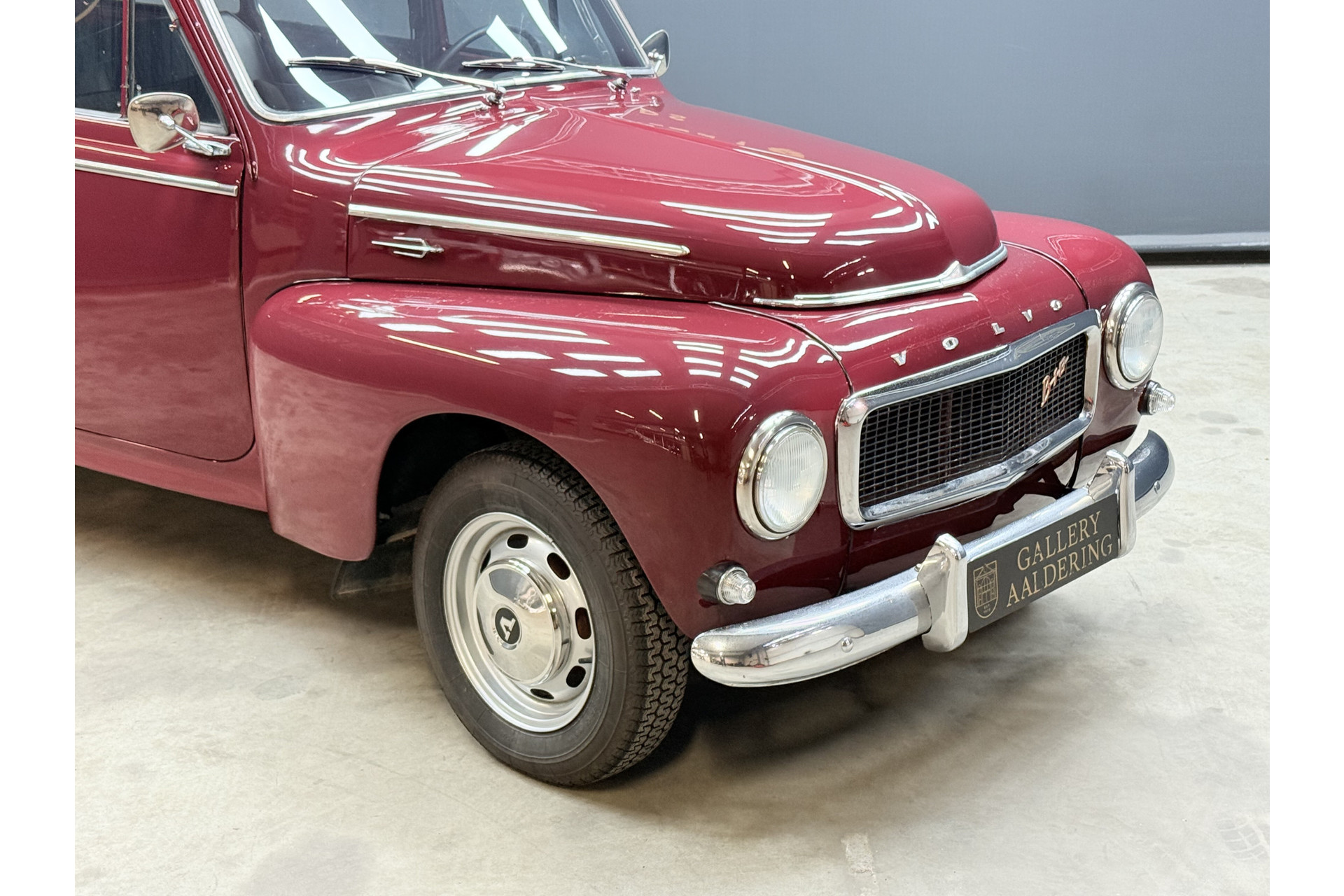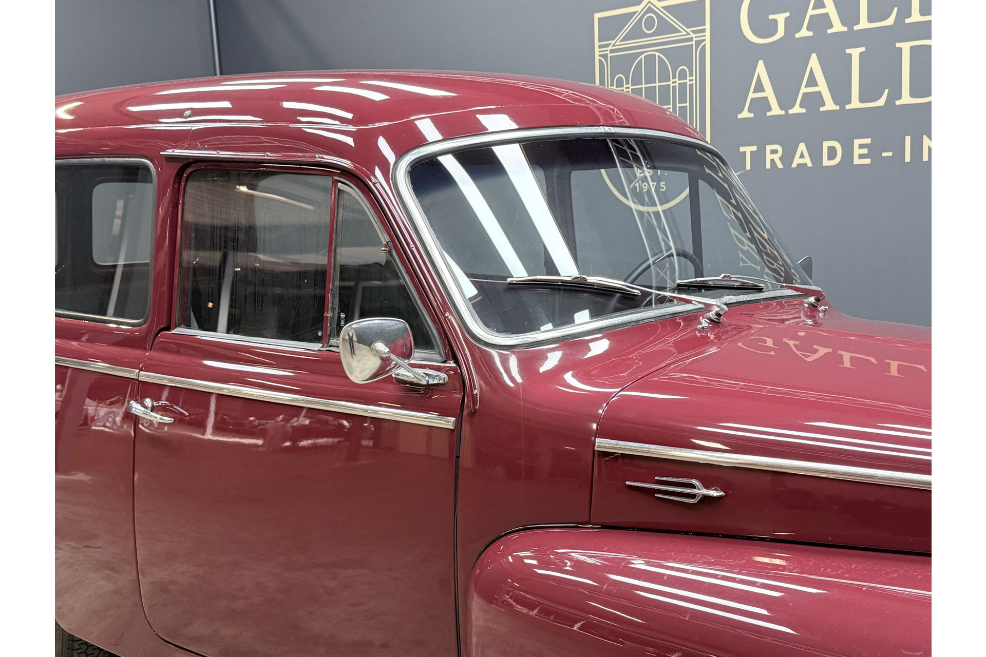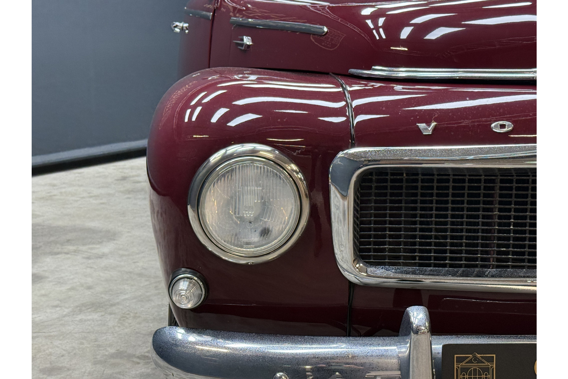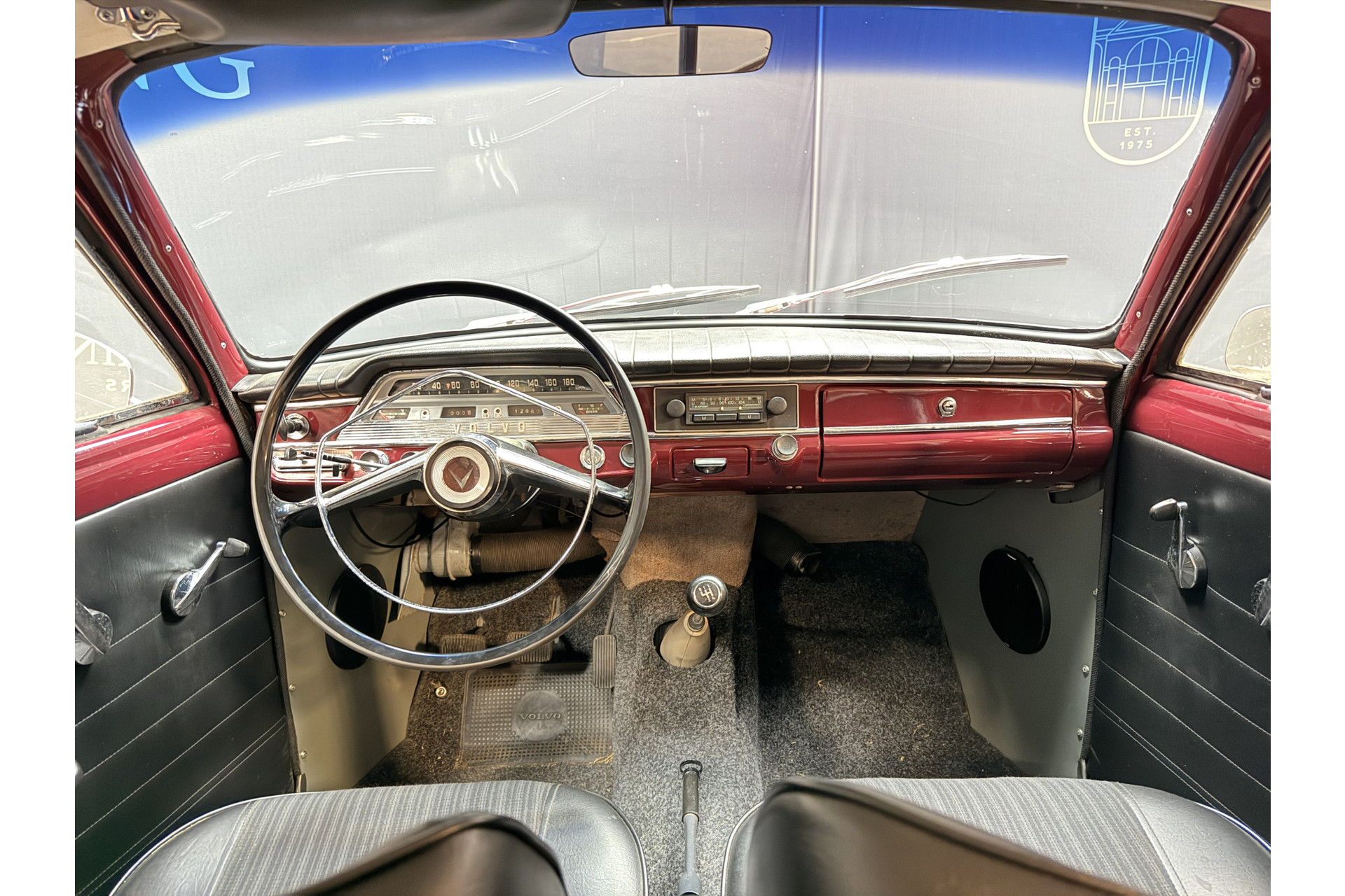 Dit specifieke exemplaar is een P210, het latere model dat in 1960 de PV445 verving. Hoe herkent u hem? Aan die prachtige, gebogen ééndelige voorruit, gedeeld met de PV544. Het geeft de auto net dat beetje modernere uitstraling, terwijl hij nog steeds die heerlijke ouderwetse Volvo robuustheid uitstraalt. En die robuustheid is geen marketingpraat: onder de motorkap ligt de legendarische B18A-motor, goed voor 75 pk maar vooral beroemd omdat hij gewoon niet kapot te krijgen is. De B18 was zó sterk dat Volvo hem als basis gebruikte voor rallyauto’s én hij vormt één van de redenen dat oude Volvo’s zo’n mythische reputatie hebben. Indestructible, zoals ze zeggen.