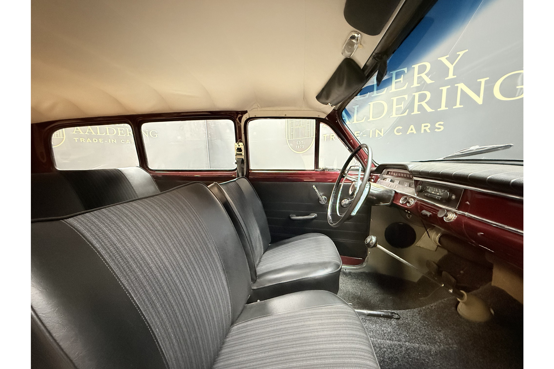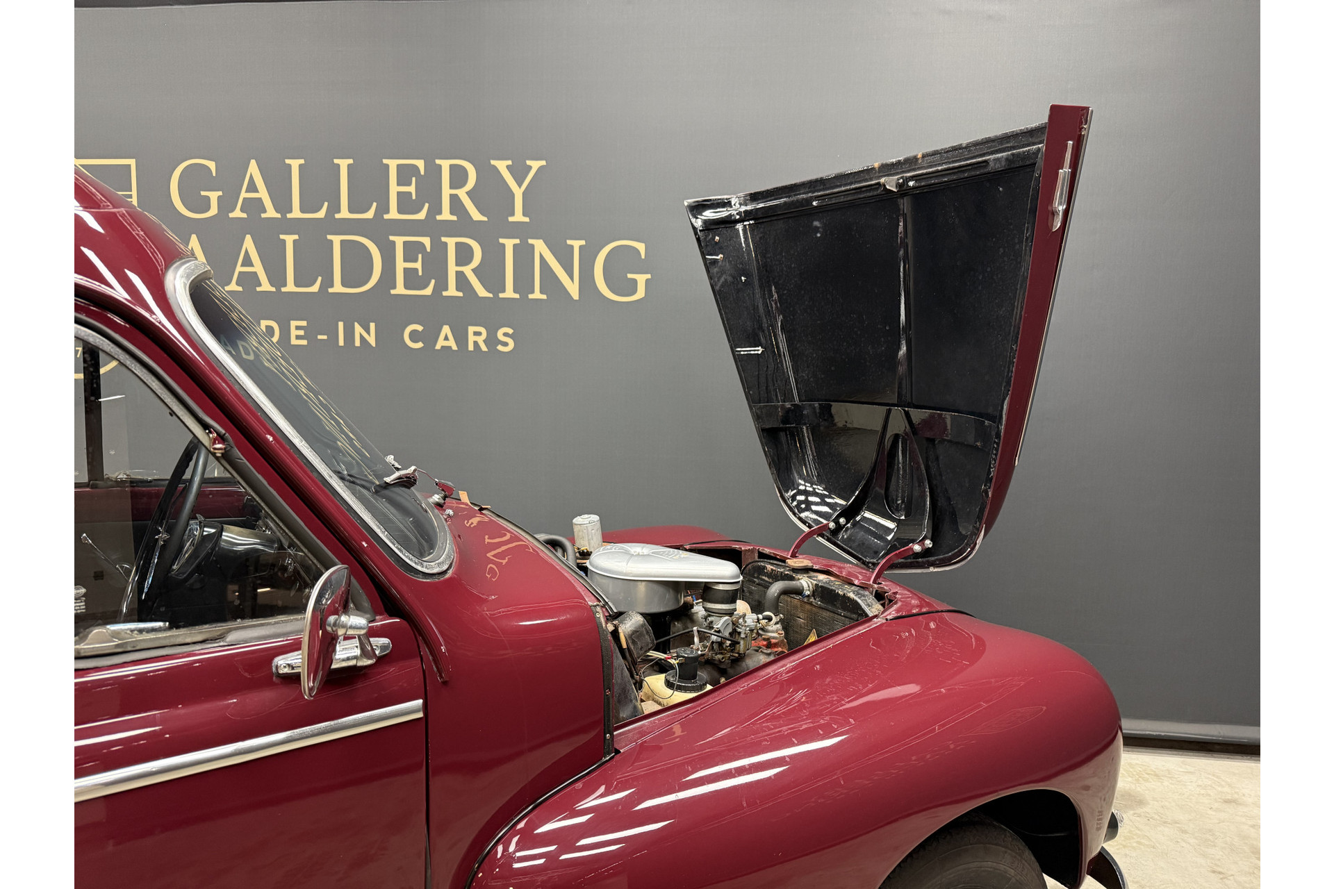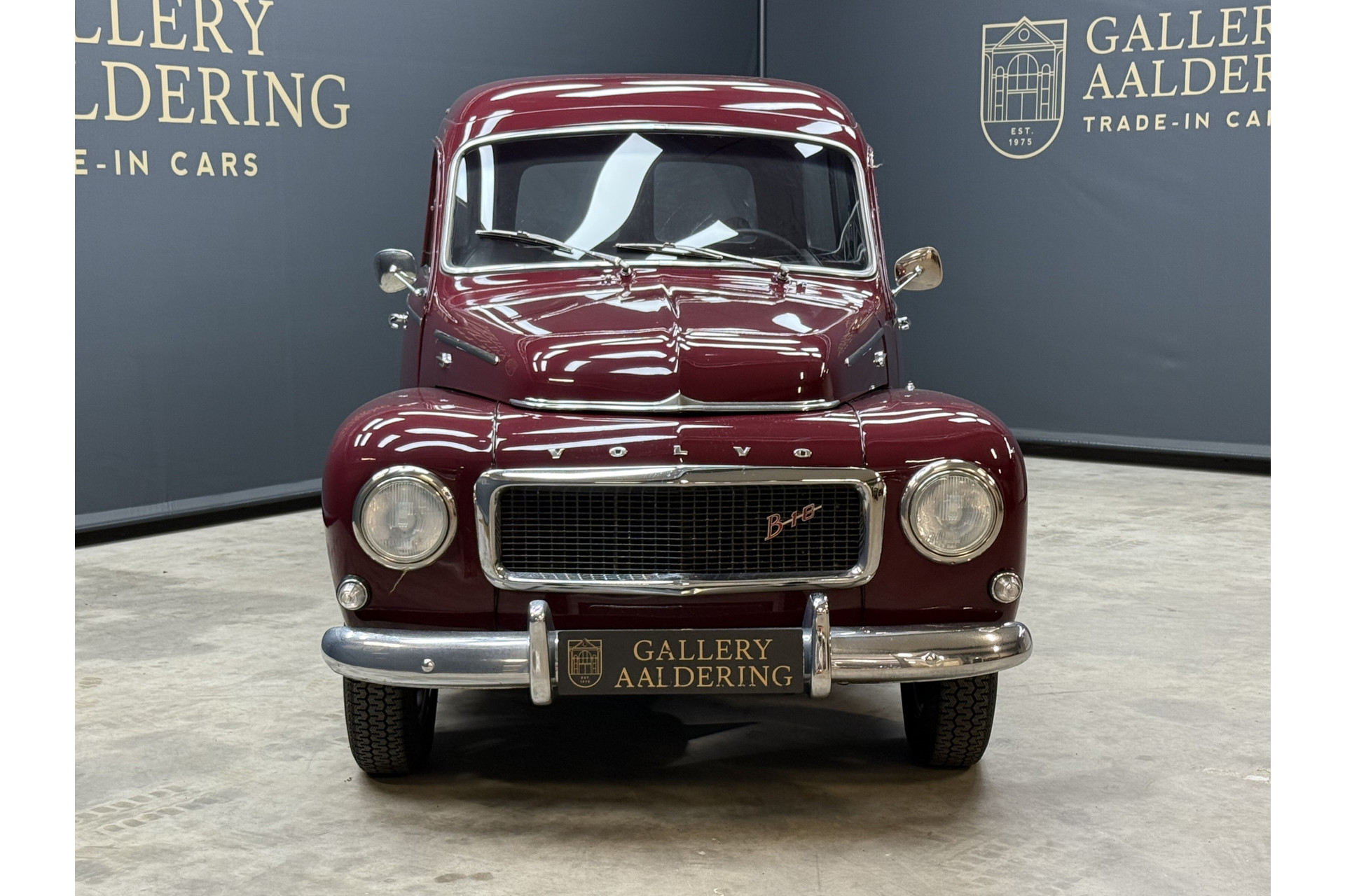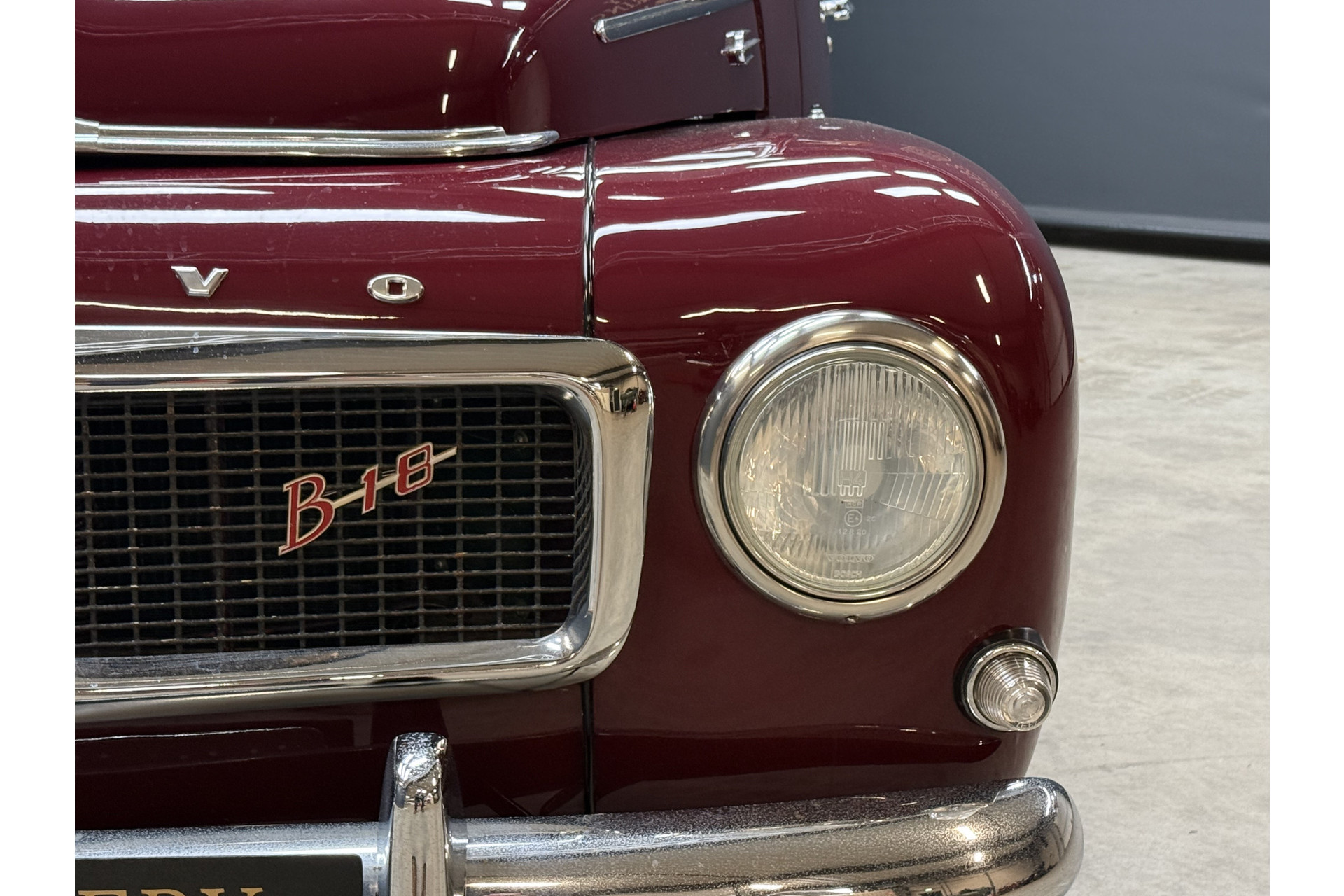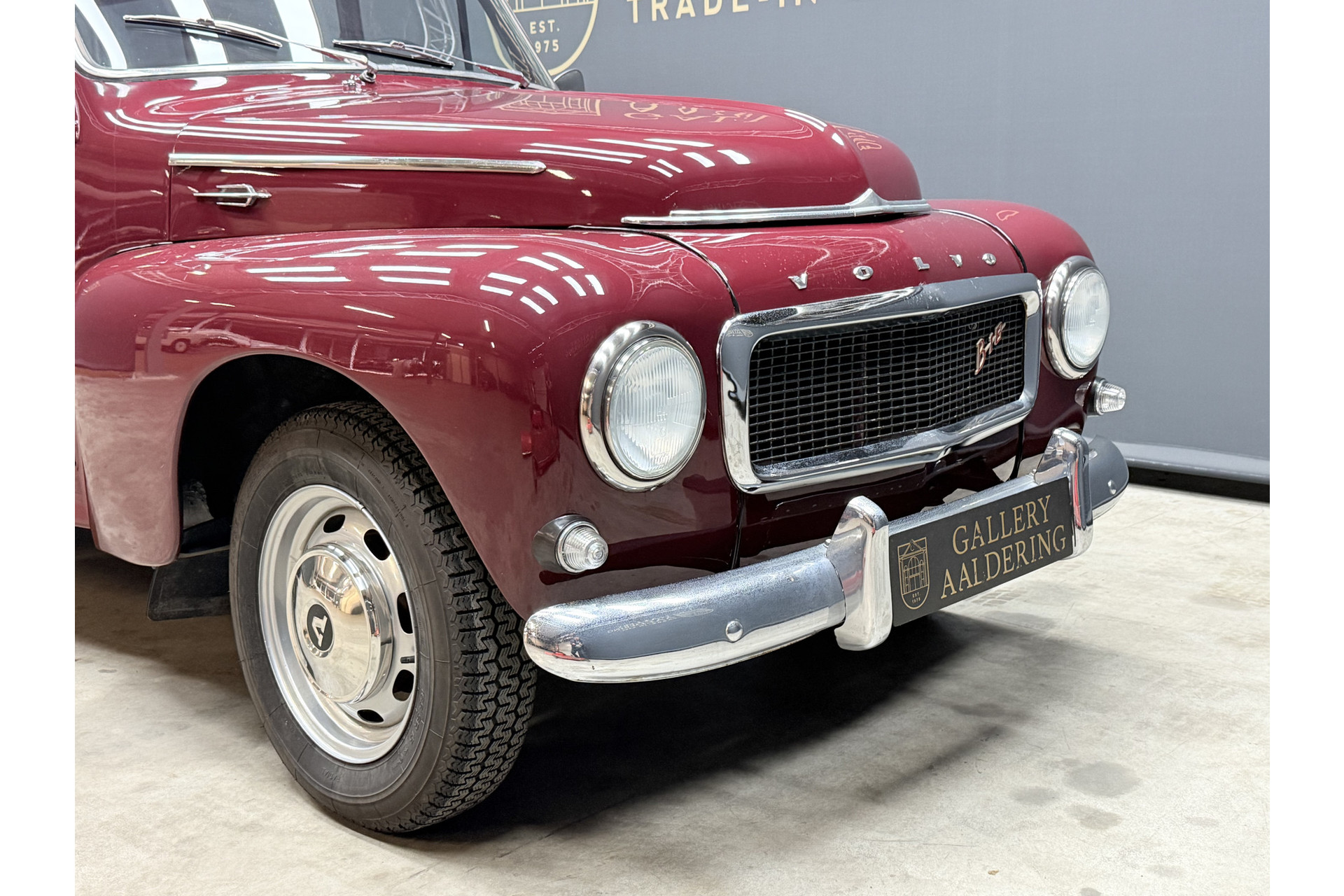 Dit specifieke exemplaar is een P210, het latere model dat in 1960 de PV445 verving. Hoe herkent u hem? Aan die prachtige, gebogen ééndelige voorruit, gedeeld met de PV544. Het geeft de auto net dat beetje modernere uitstraling, terwijl hij nog steeds die heerlijke ouderwetse Volvo robuustheid uitstraalt. En die robuustheid is geen marketingpraat: onder de motorkap ligt de legendarische B18A-motor, goed voor 75 pk maar vooral beroemd omdat hij gewoon niet kapot te krijgen is. De B18 was zó sterk dat Volvo hem als basis gebruikte voor rallyauto’s én hij vormt één van de redenen dat oude Volvo’s zo’n mythische reputatie hebben. Indestructible, zoals ze zeggen.