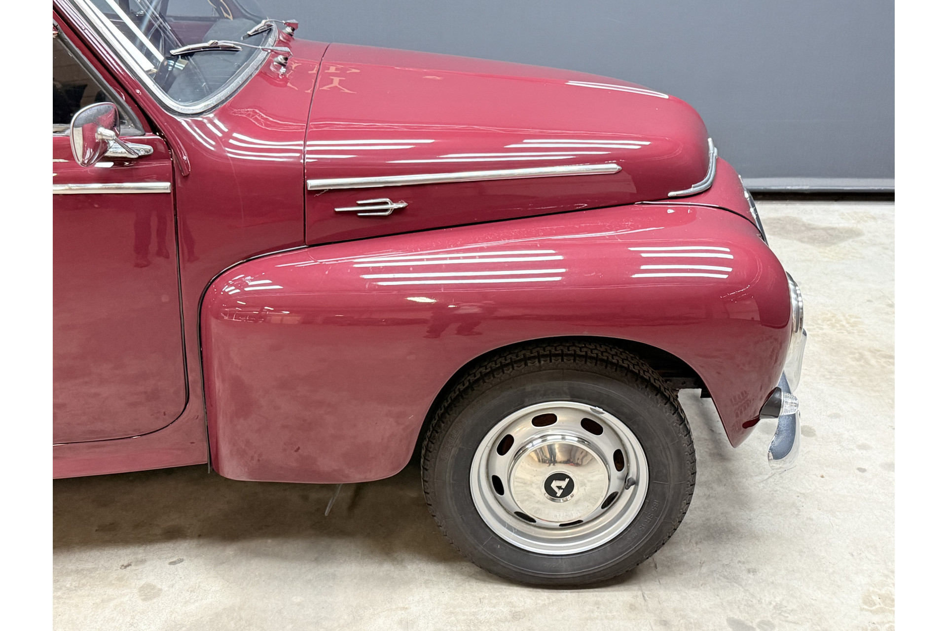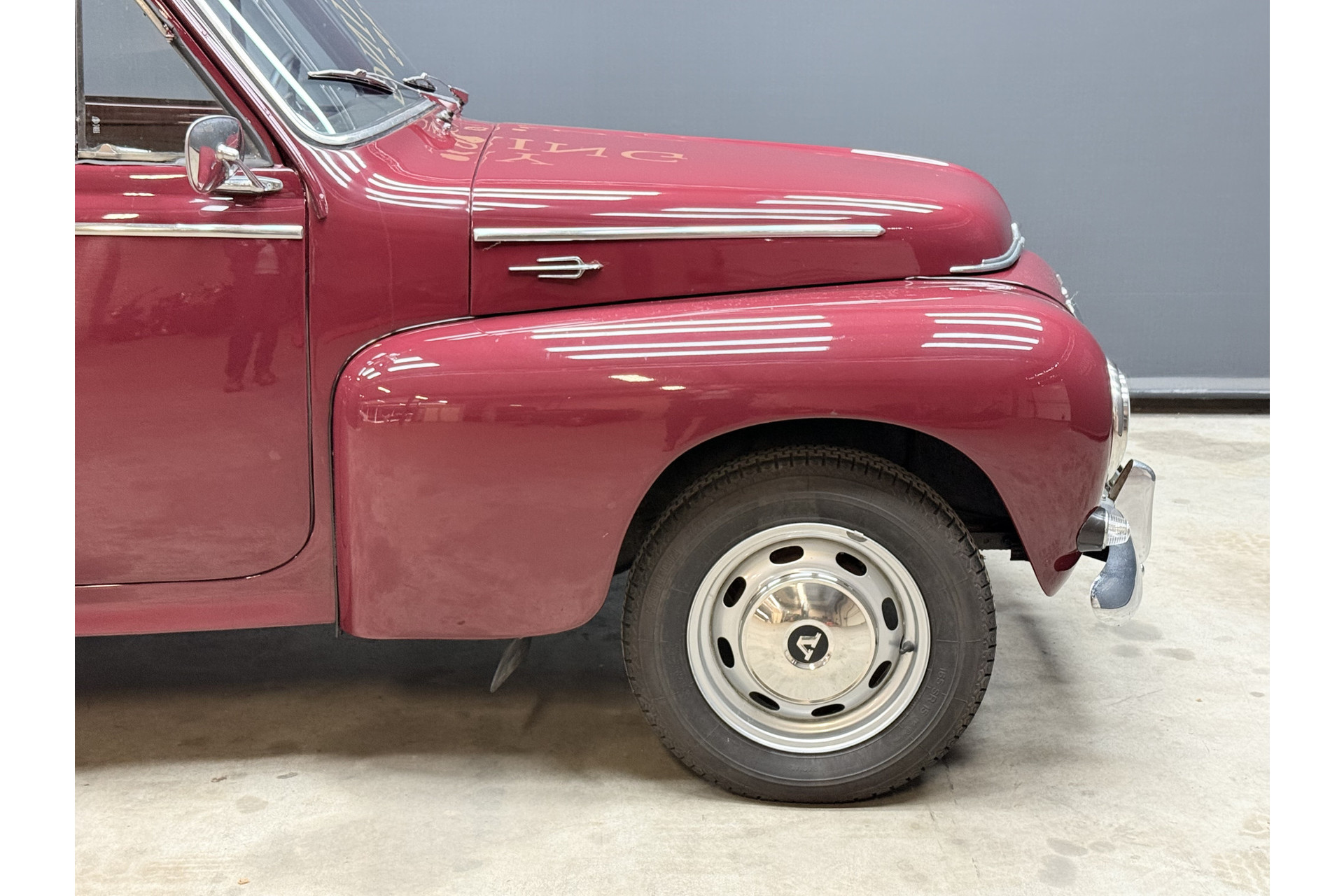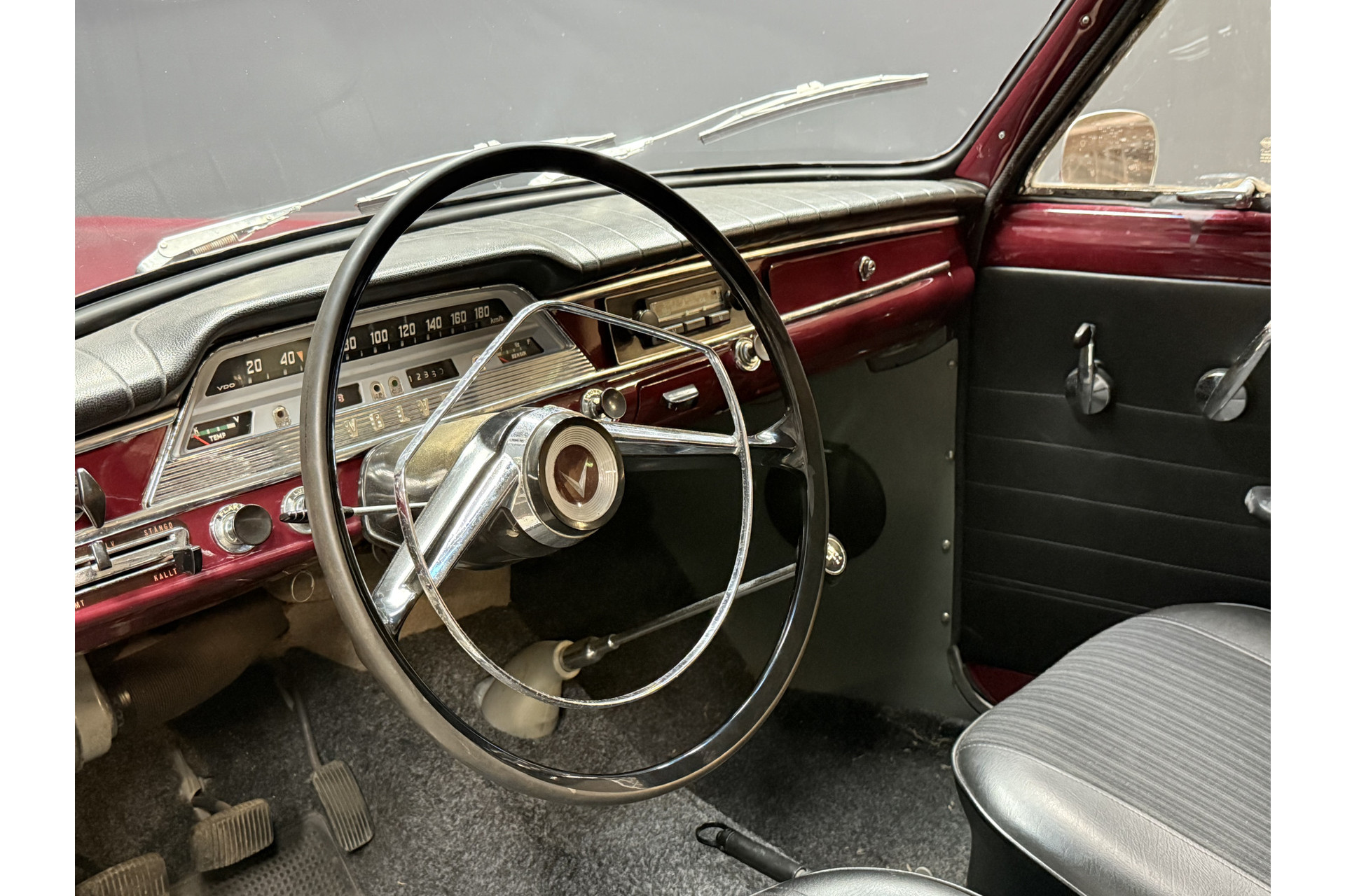 Im Jahr 2004 wurde dieser Duett fachgerecht restauriert und revidiert und befindet sich heute in ausgesprochen schöner Verfassung. Die Karosserie wurde in einem tiefen, warmen Wine Red neu lackiert – eine perfekte Kombination mit dem schwarzen Vinylinterieur. Es ist einer dieser Wagen, bei denen man sofort denkt: Ja, das passt. Das fühlt sich richtig an. Das Gesamtbild wirkt äußerst gepflegt, und dieser Volvo präsentiert sich dementsprechend in sehr ordentlichem Zustand.